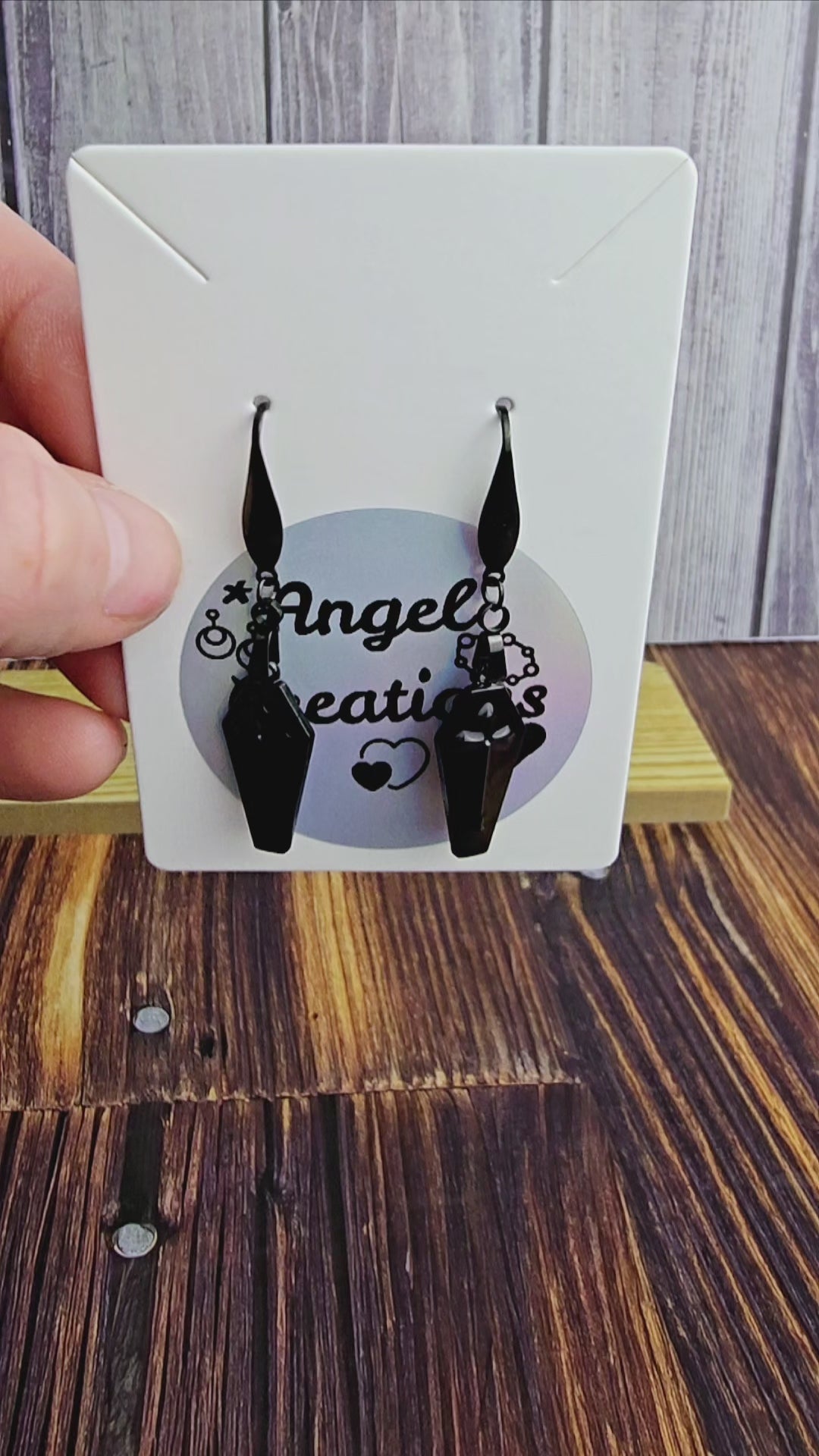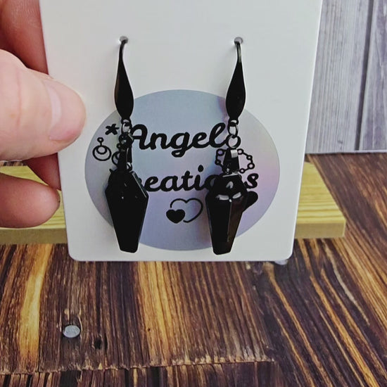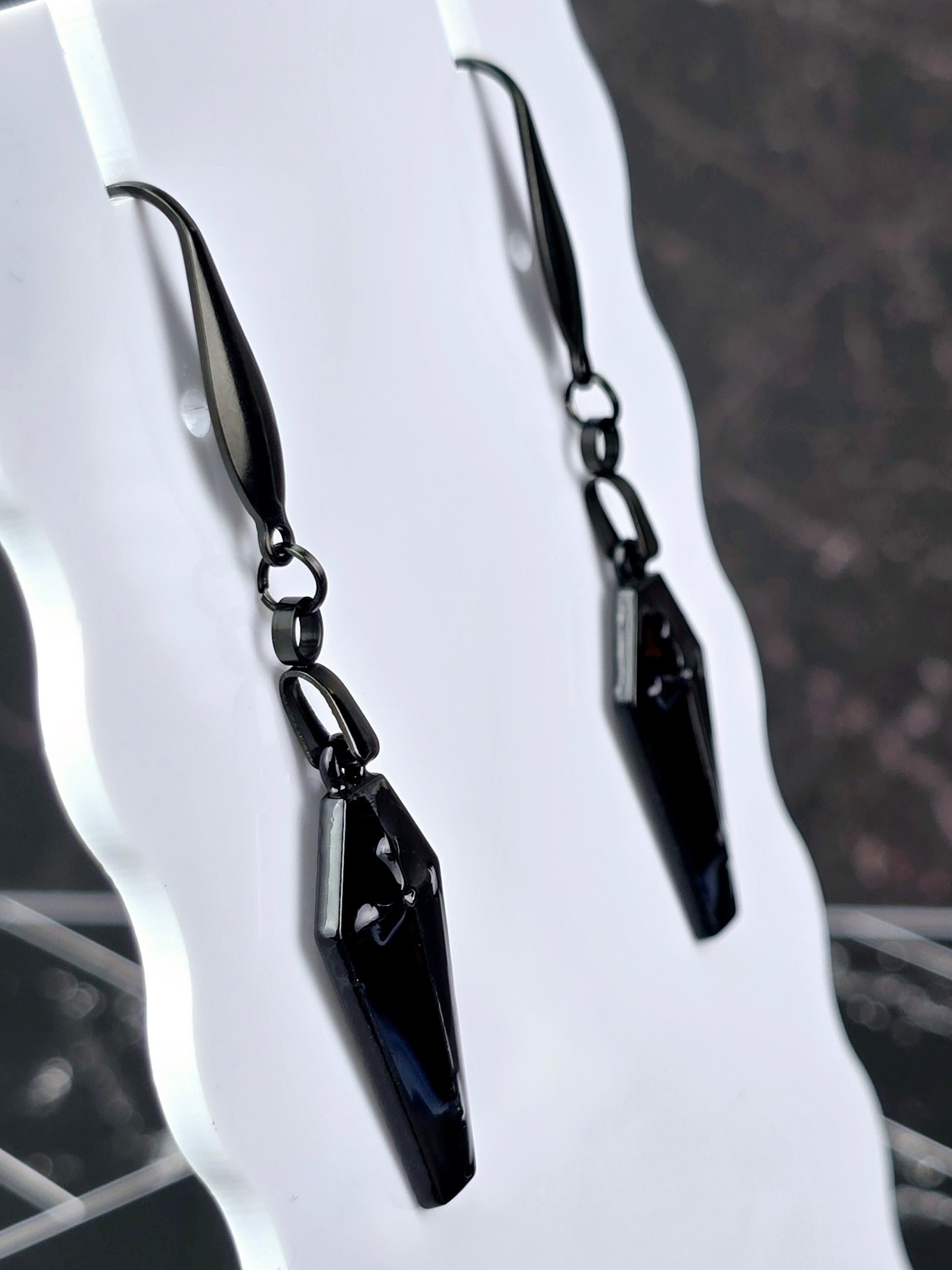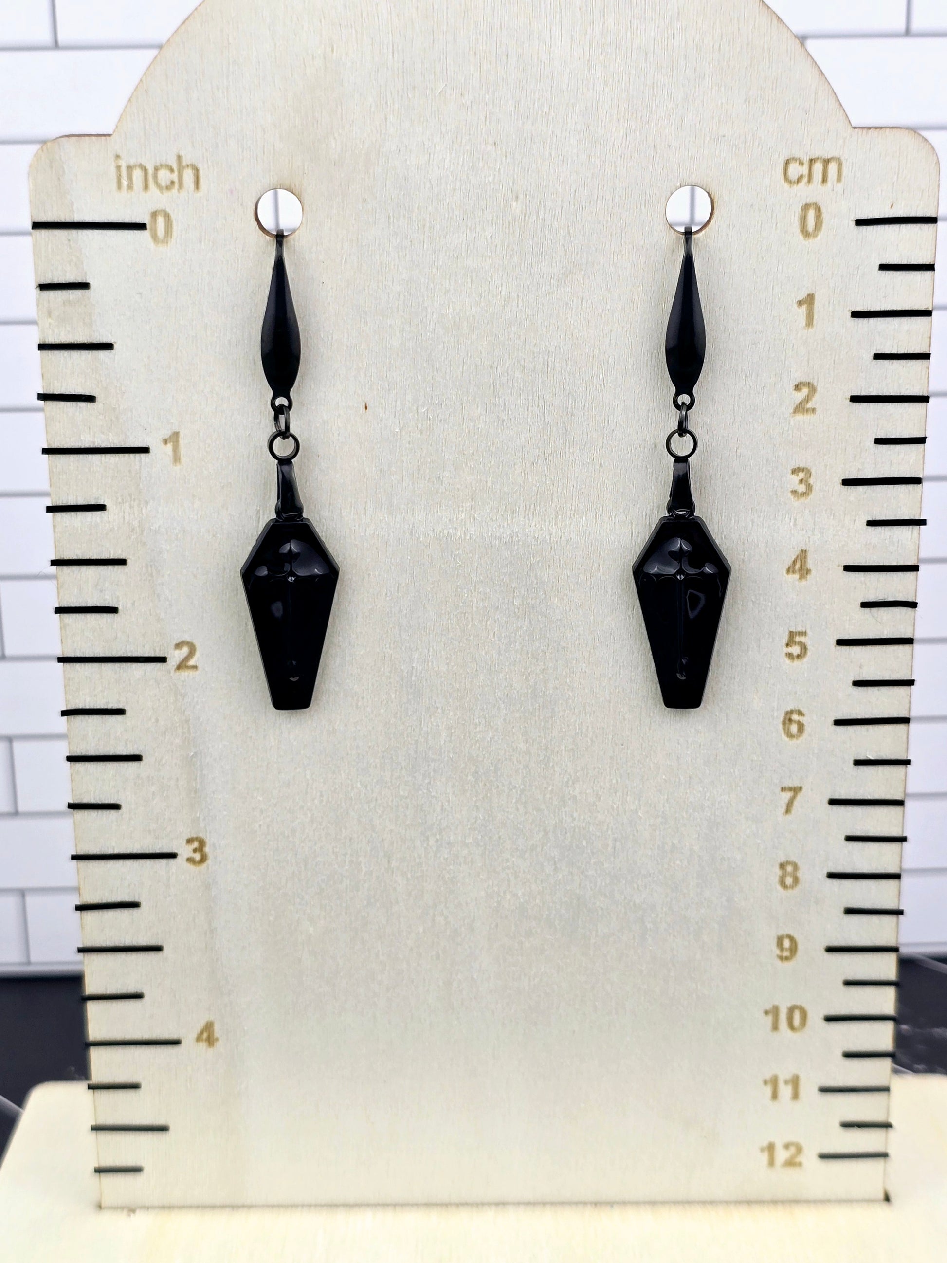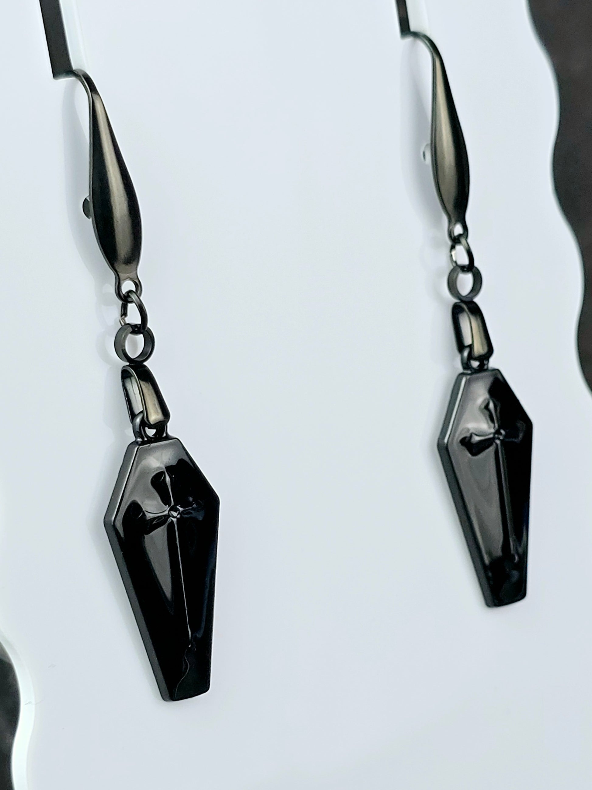 Add a touch of gothic flair to your look with these black stainless steel wire hook style earrings featuring black enamel coated coffin charms. The total length of these earrings is 5.5cm, with a drop length of 3.5cm and a width of 1cm. The black stainless steel earring hooks perfectly complement the dark and edgy vibe of the enamel coated coffin charms. Make a bold statement with these unique and stylish earrings.