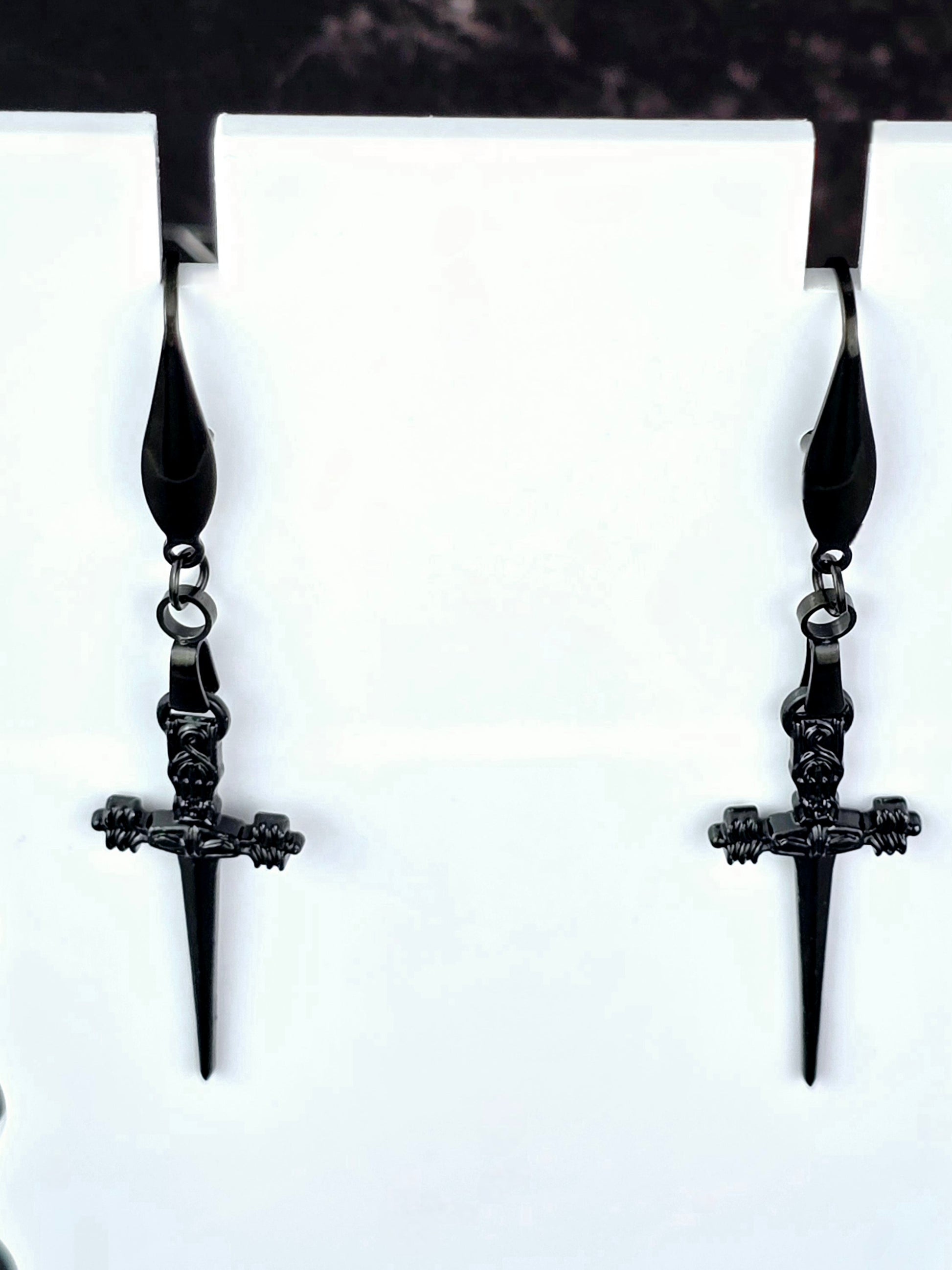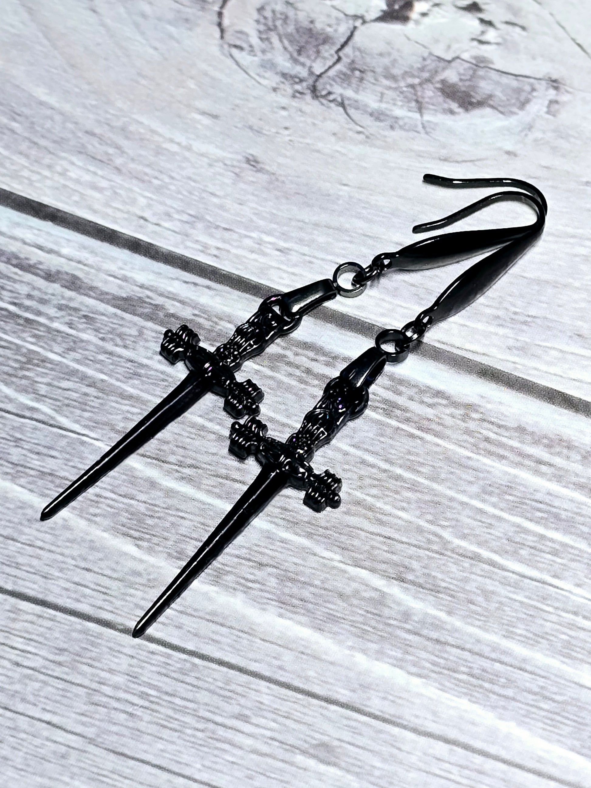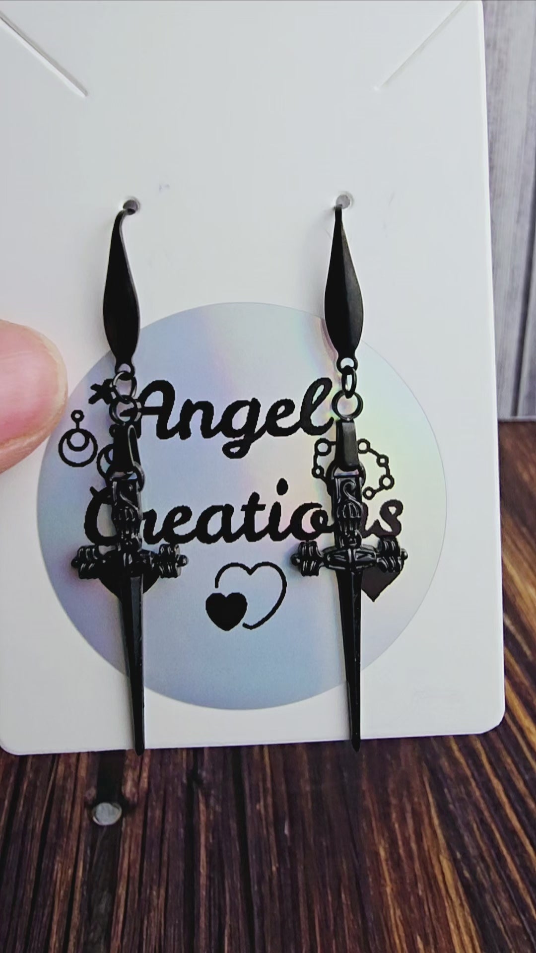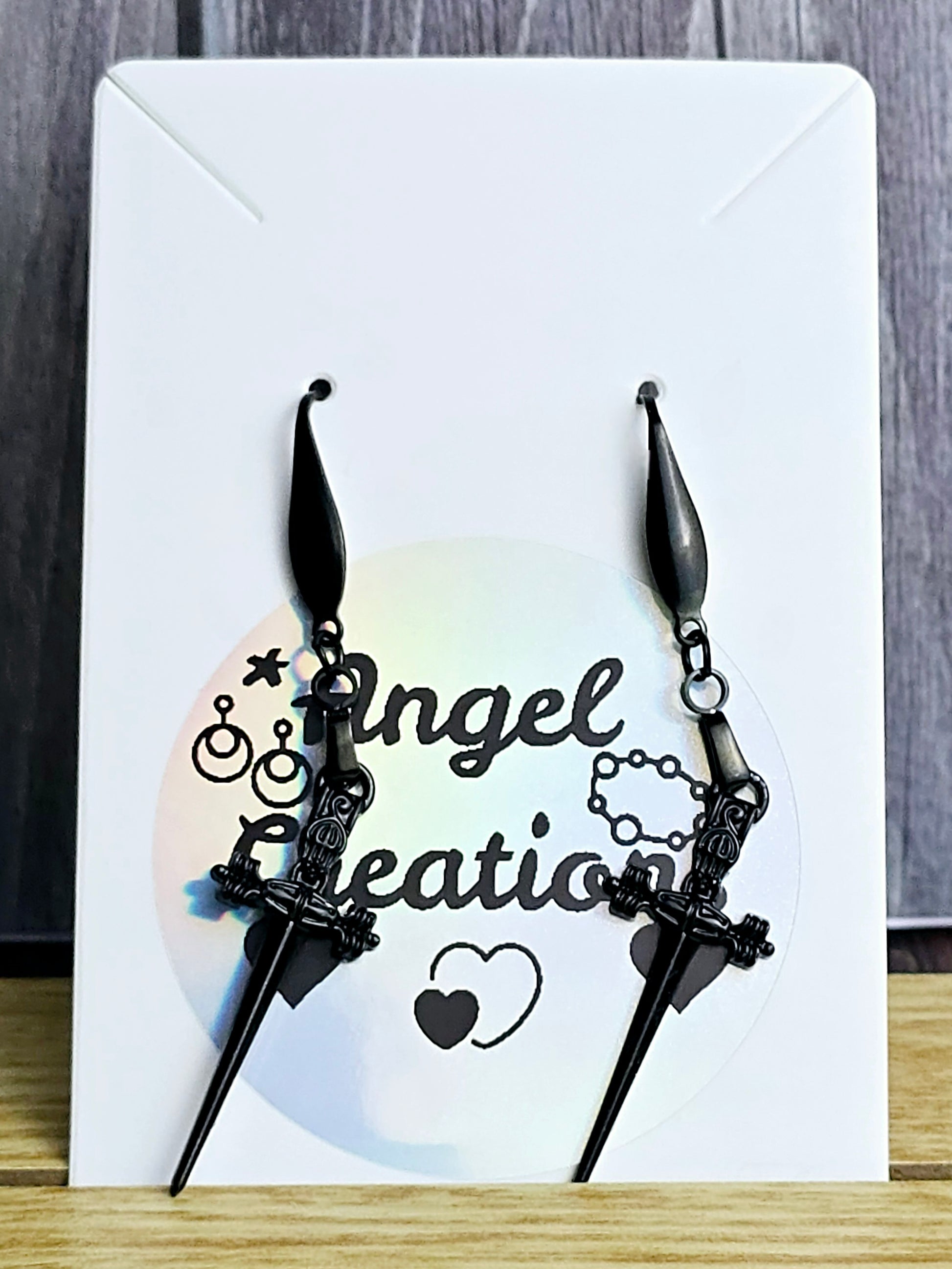 Add a touch of edgy sophistication to your look with these unique earrings. The earring hooks and clasp are crafted from durable black stainless steel, ensuring long-lasting quality. The standout feature of these earrings is the black enamel coated metal alloy knife pendant, adding a bold and daring element to your style.