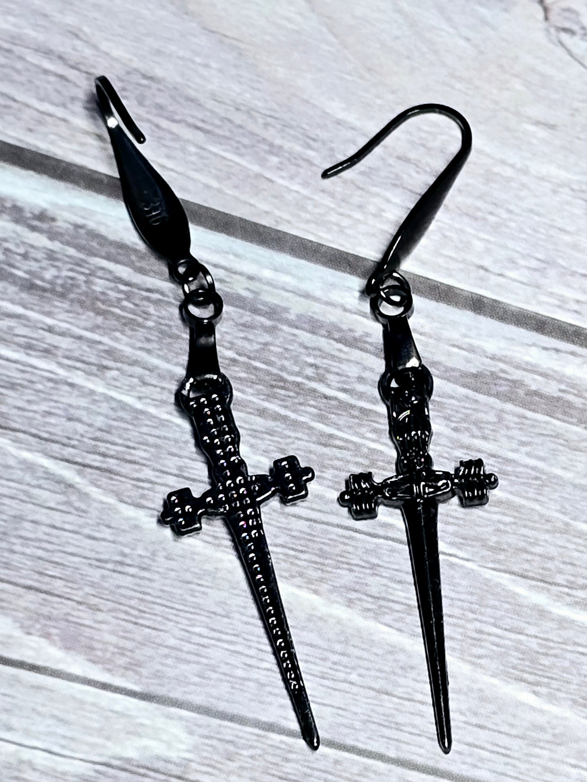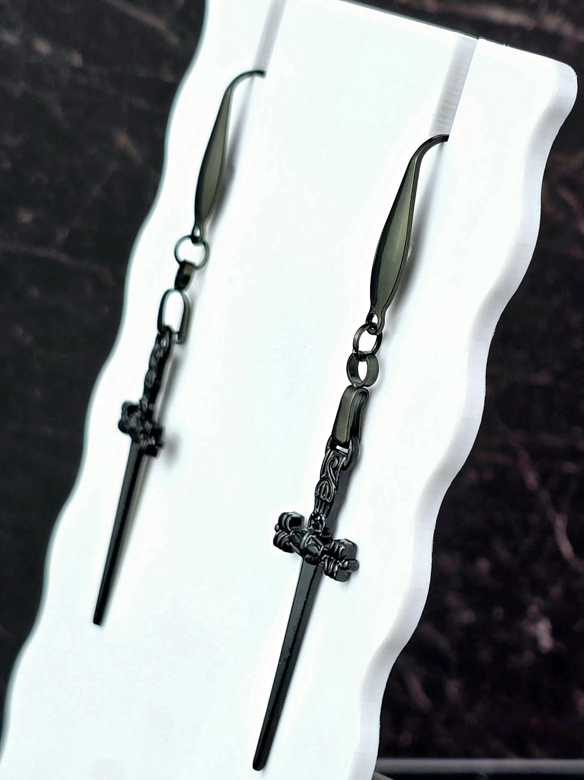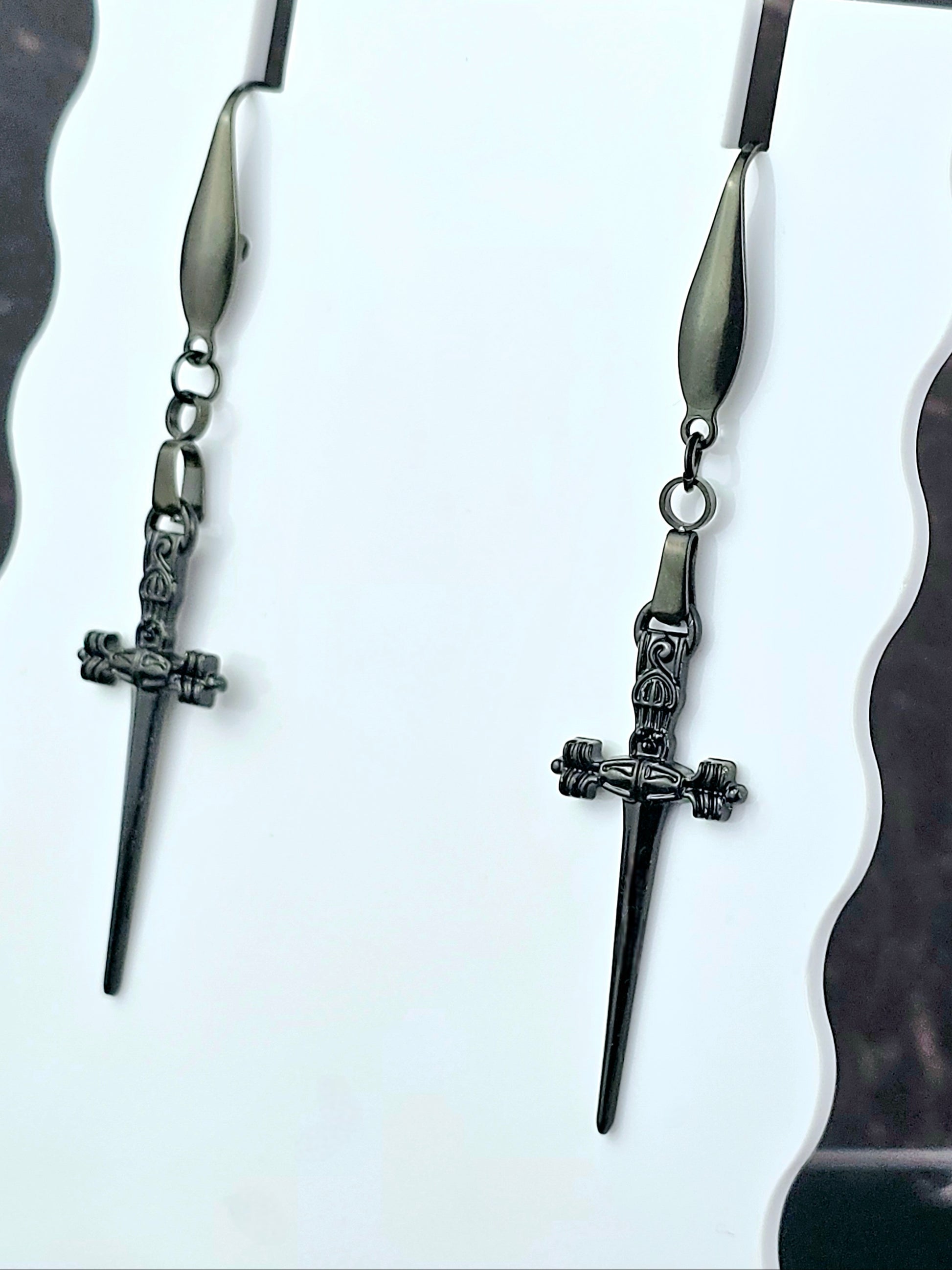 Add a touch of edgy sophistication to your look with these unique earrings. The earring hooks and clasp are crafted from durable black stainless steel, ensuring long-lasting quality. The standout feature of these earrings is the black enamel coated metal alloy knife pendant, adding a bold and daring element to your style.