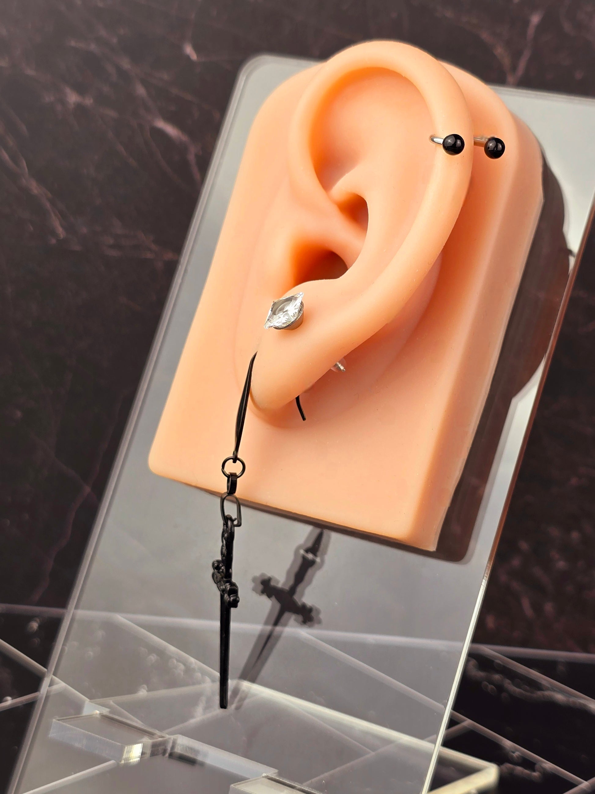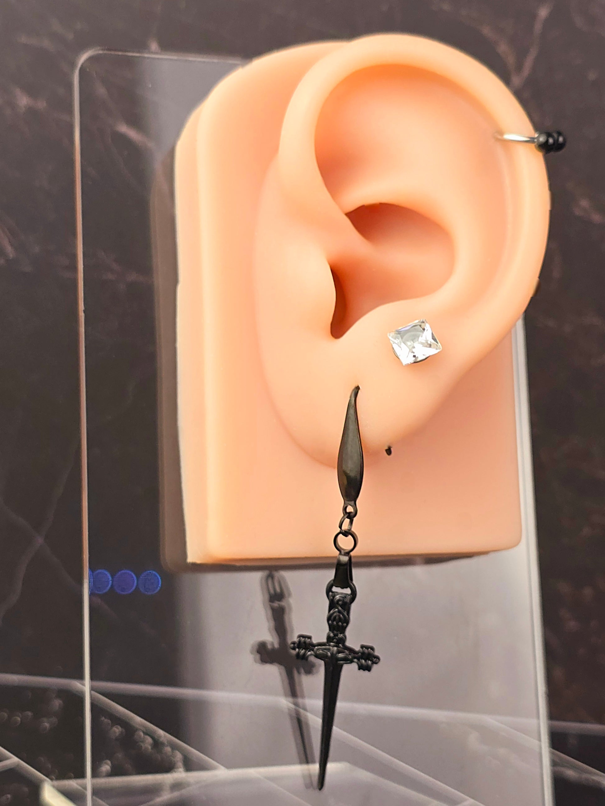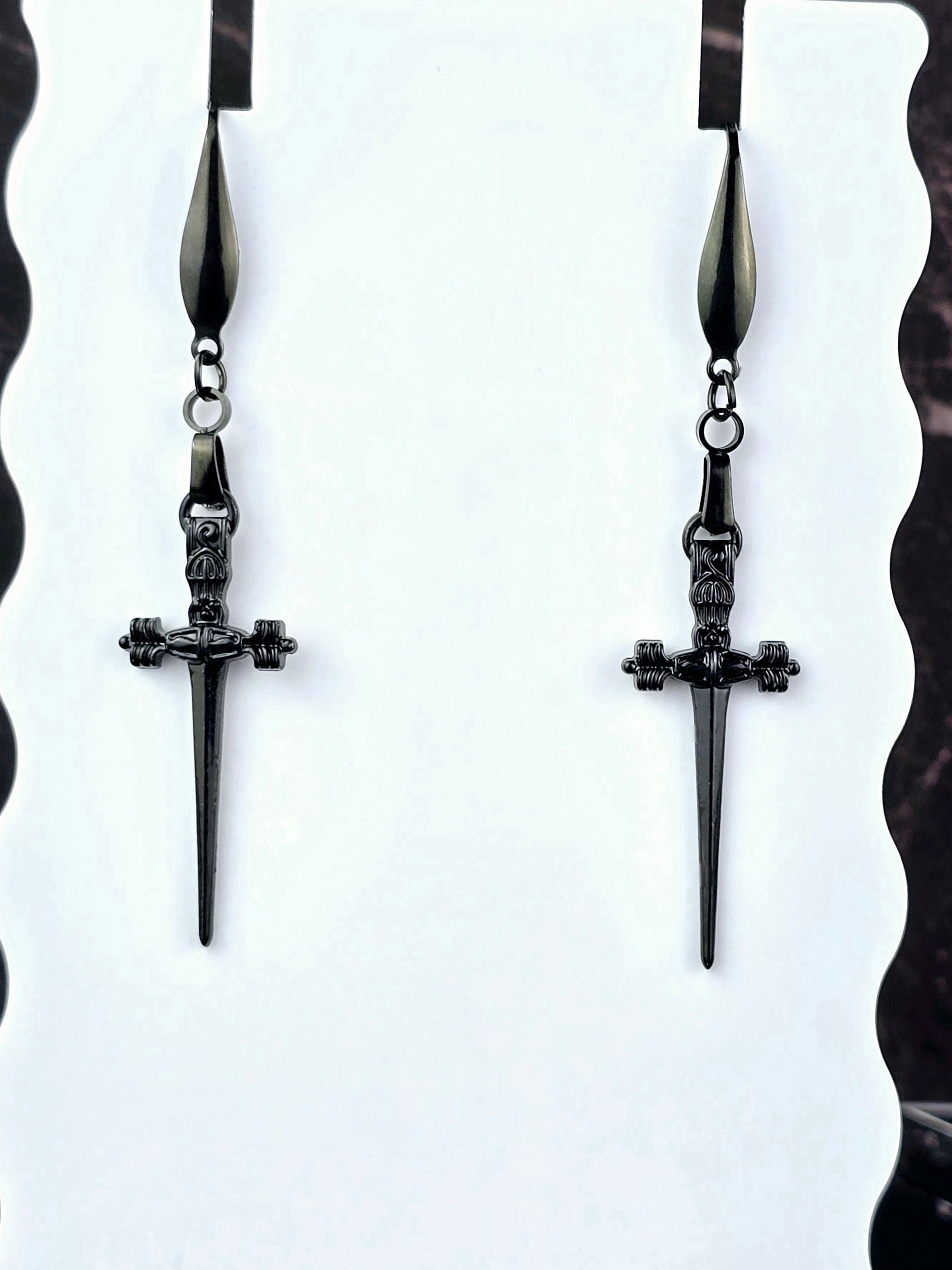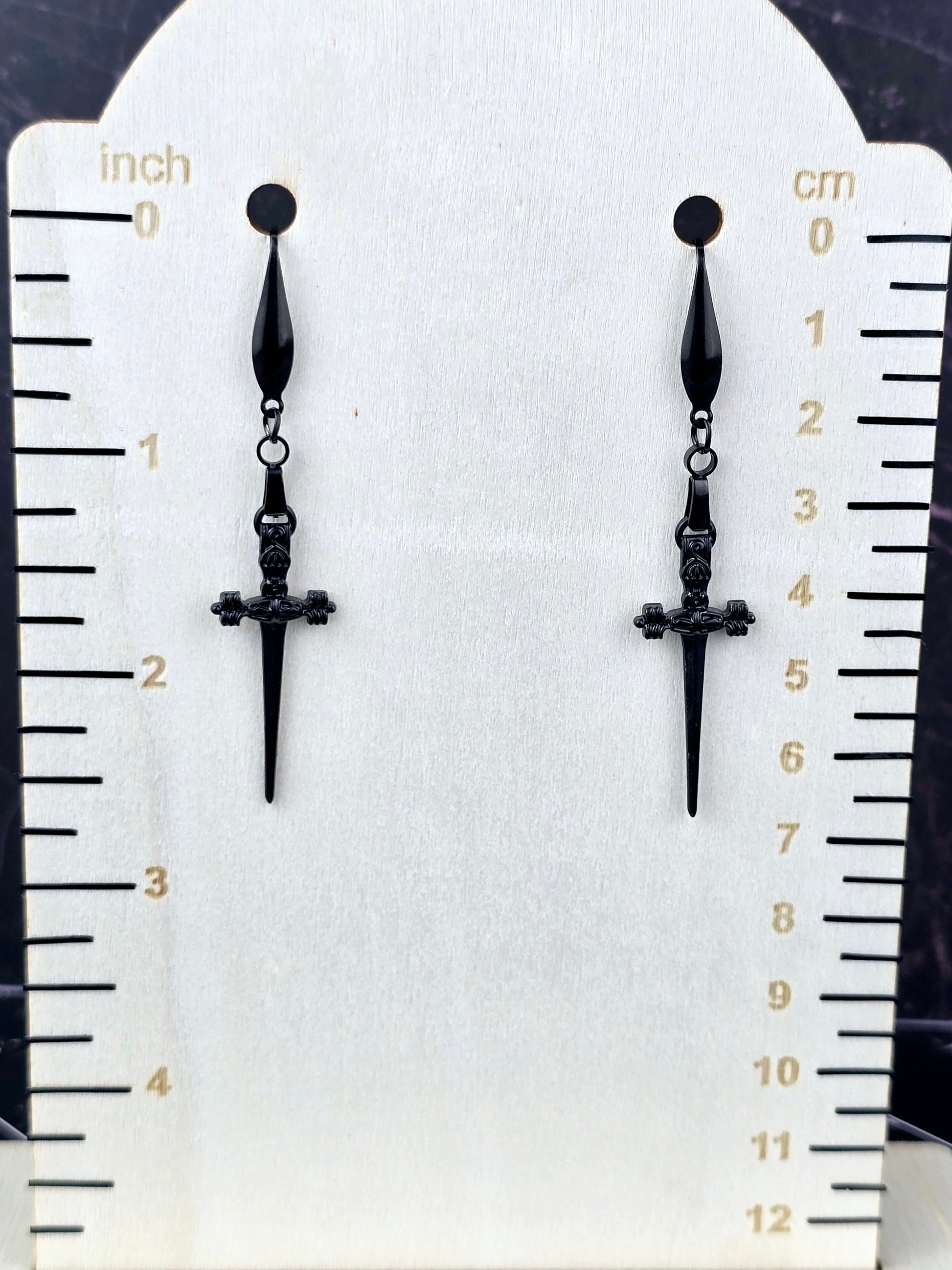 Add a touch of edgy sophistication to your look with these unique earrings. The earring hooks and clasp are crafted from durable black stainless steel, ensuring long-lasting quality. The standout feature of these earrings is the black enamel coated metal alloy knife pendant, adding a bold and daring element to your style.
