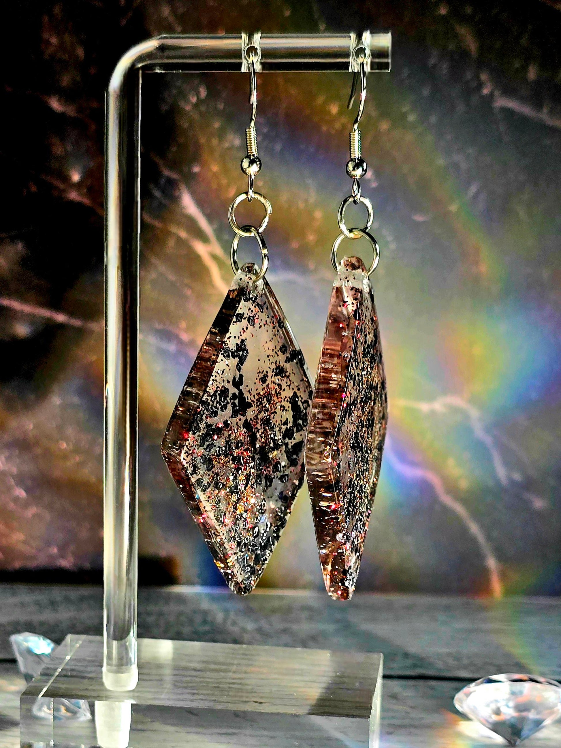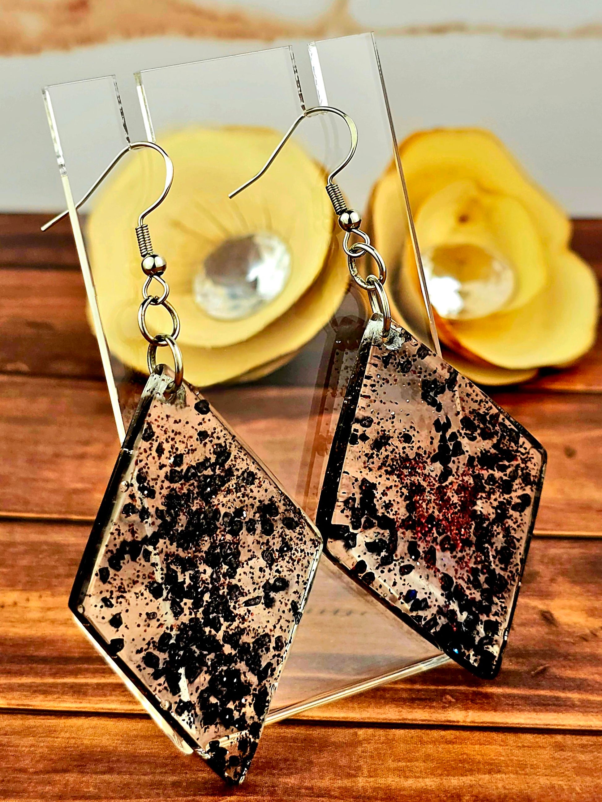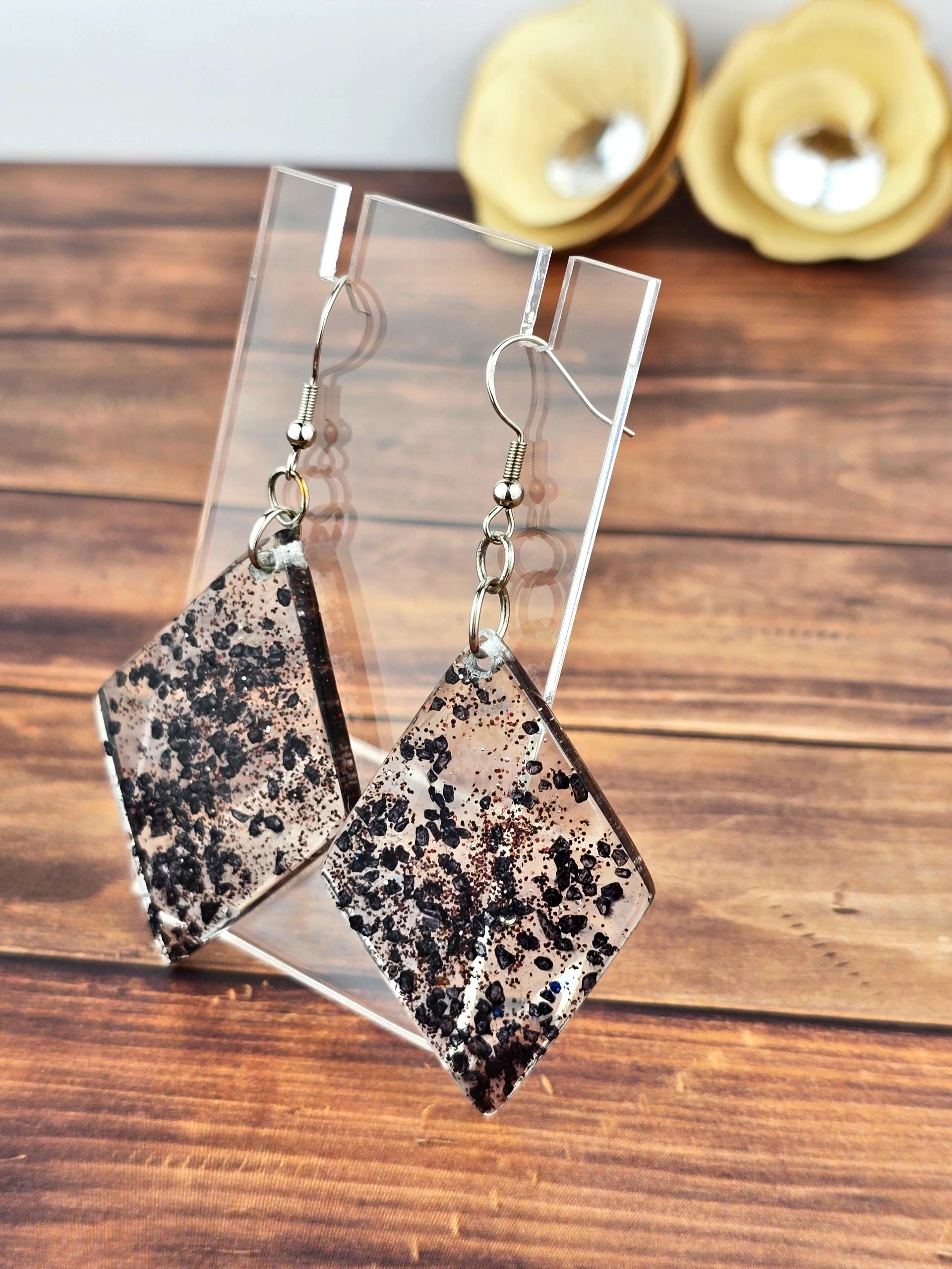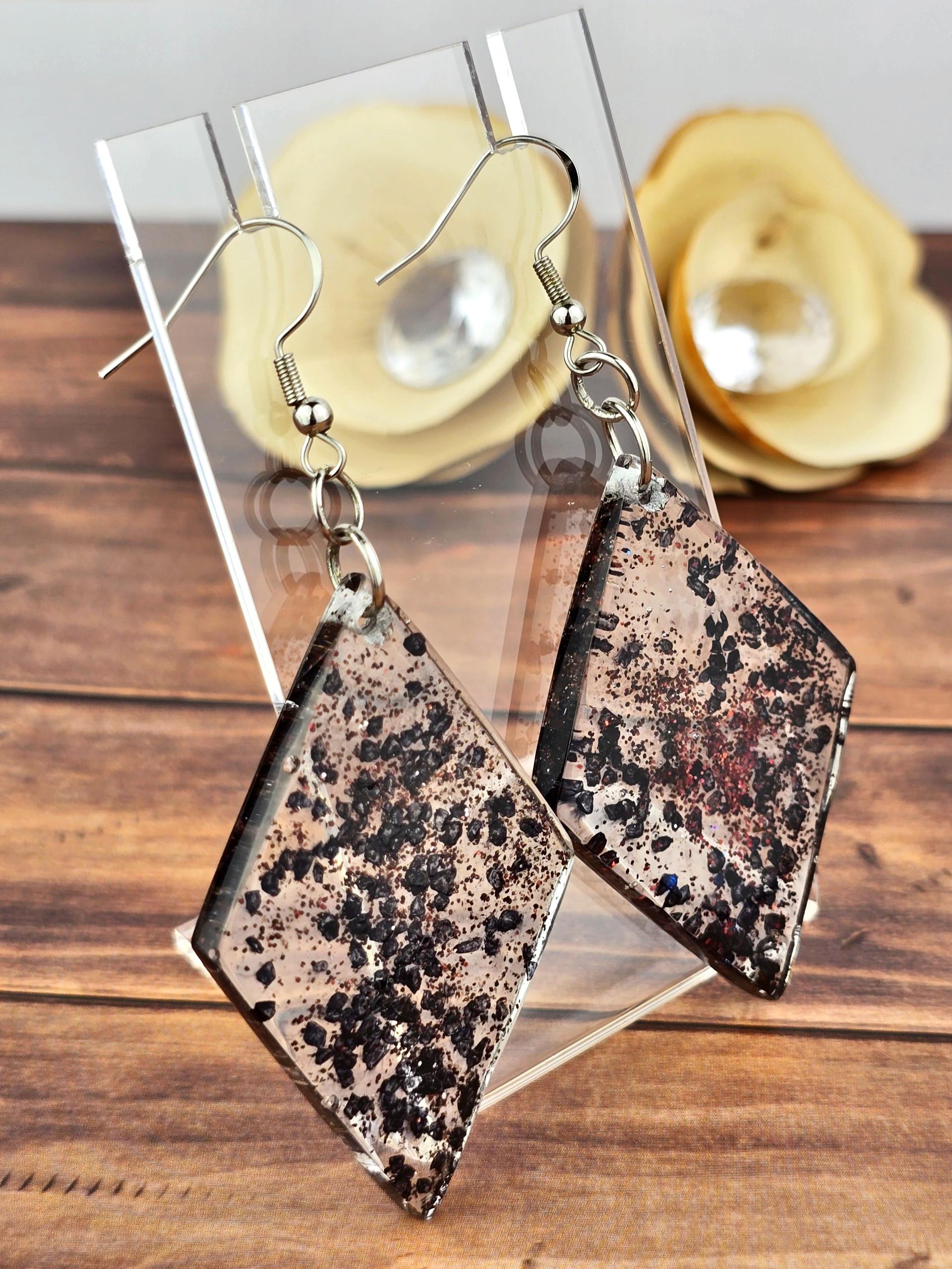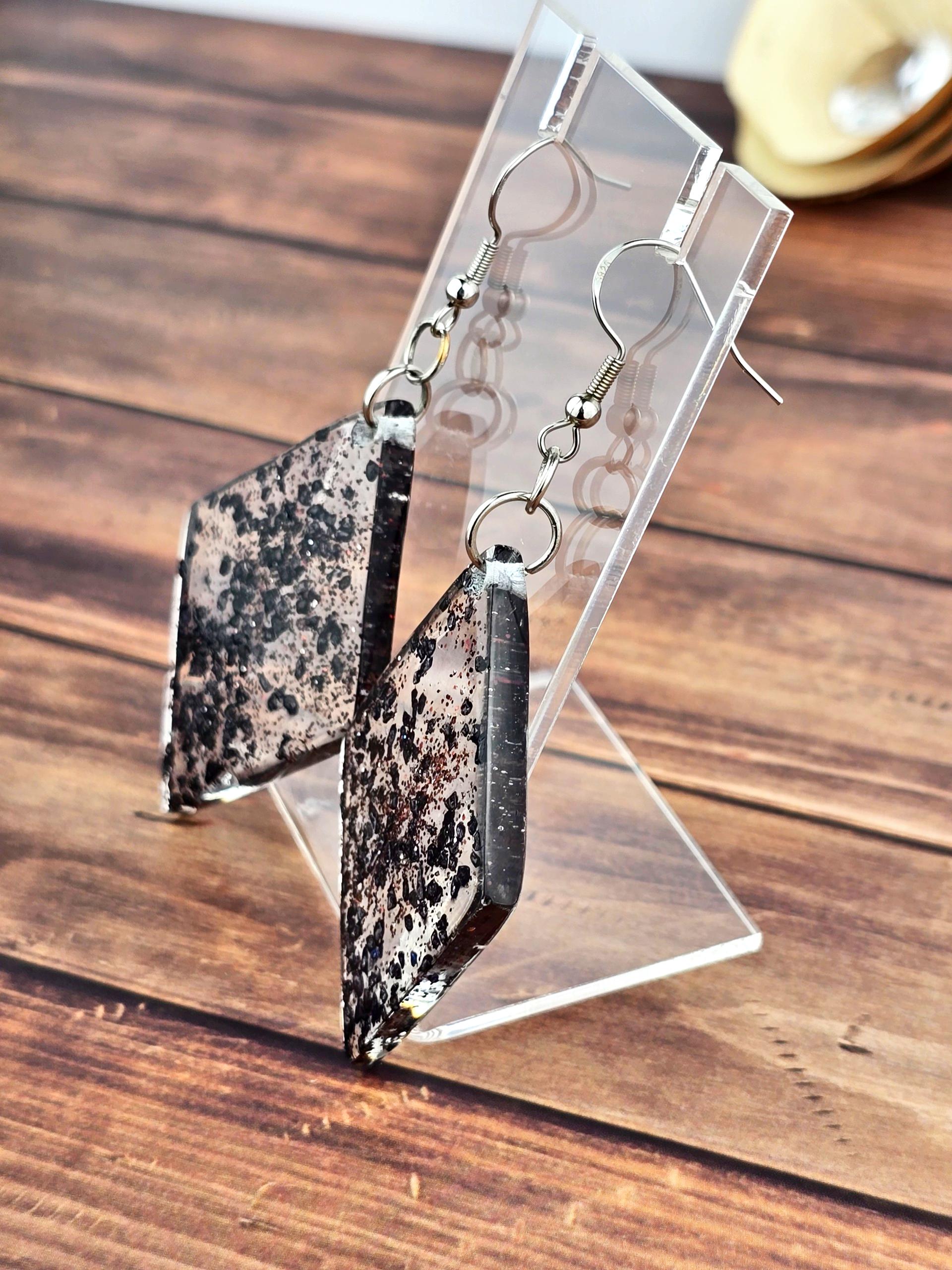 Find some elegance to add to your outfit with these stunning hook style earrings. Made with durable 304 stainless steel, these earrings feature a large diamond shaped pendant filled with clear epoxy resin and black rock flakes for a unique and eye-catching look. The earrings measure 8cm in total length, with a drop length of 6cm and a width of 3cm at the widest point of the pendant. The pendant itself measures 5cm x 3cm, making it a bold statement piece. Perfect for adding a touch of glamour to any outfit, these earrings are sure to turn heads wherever you go.
