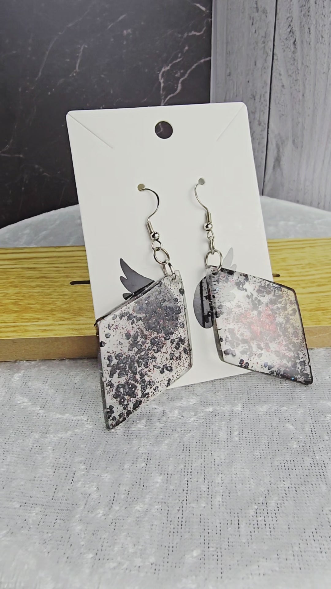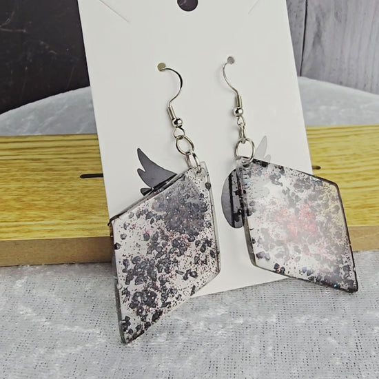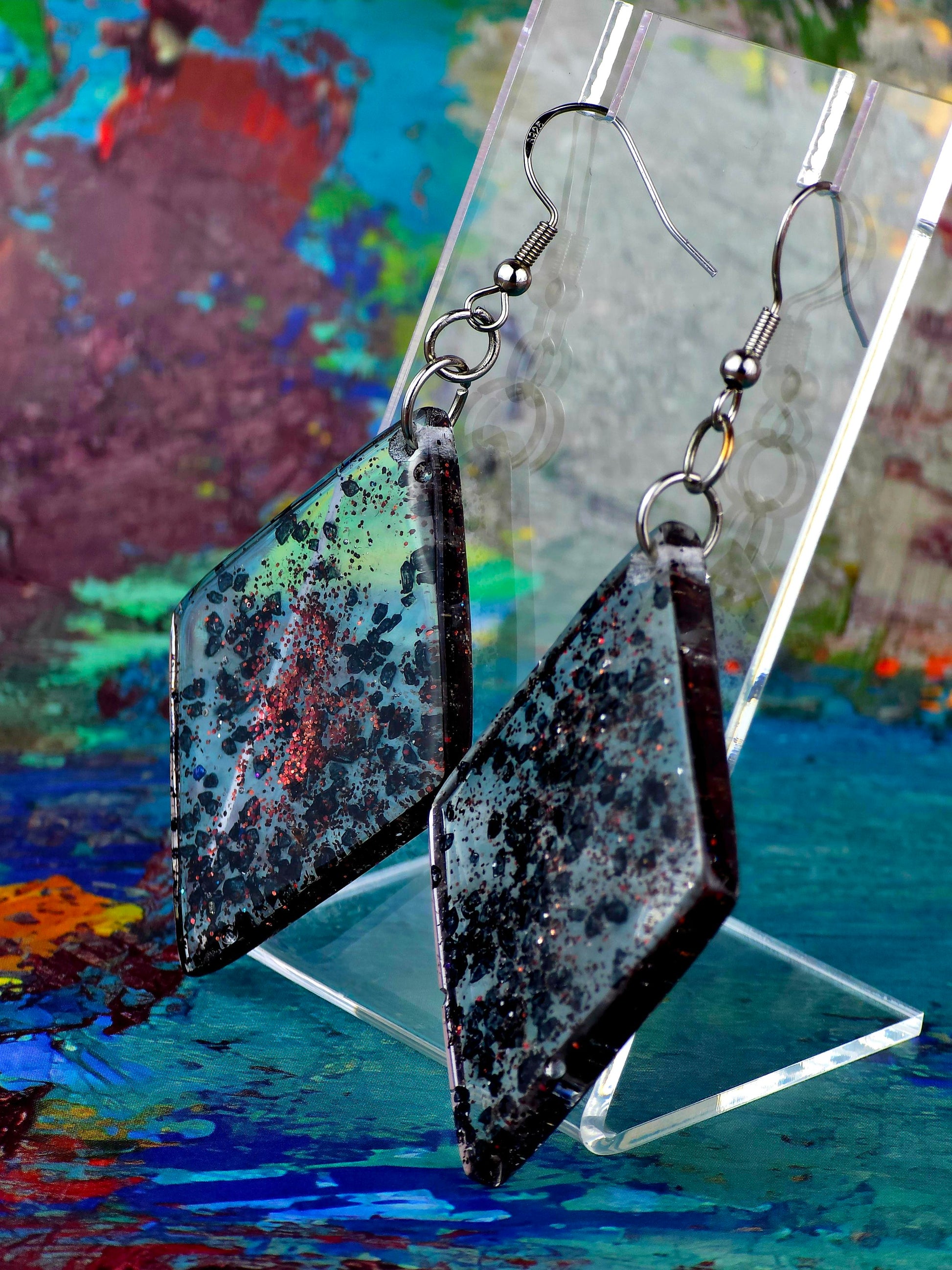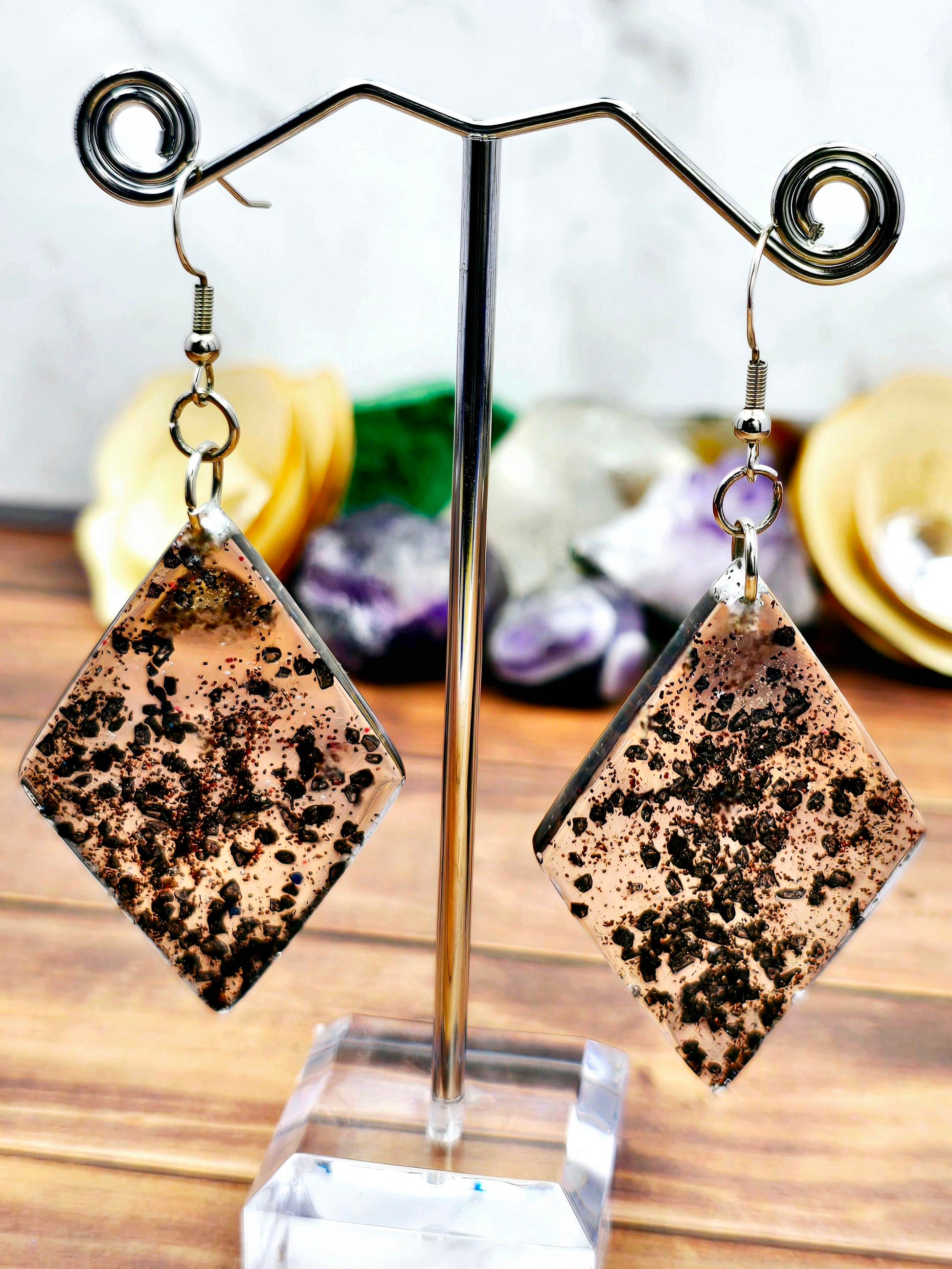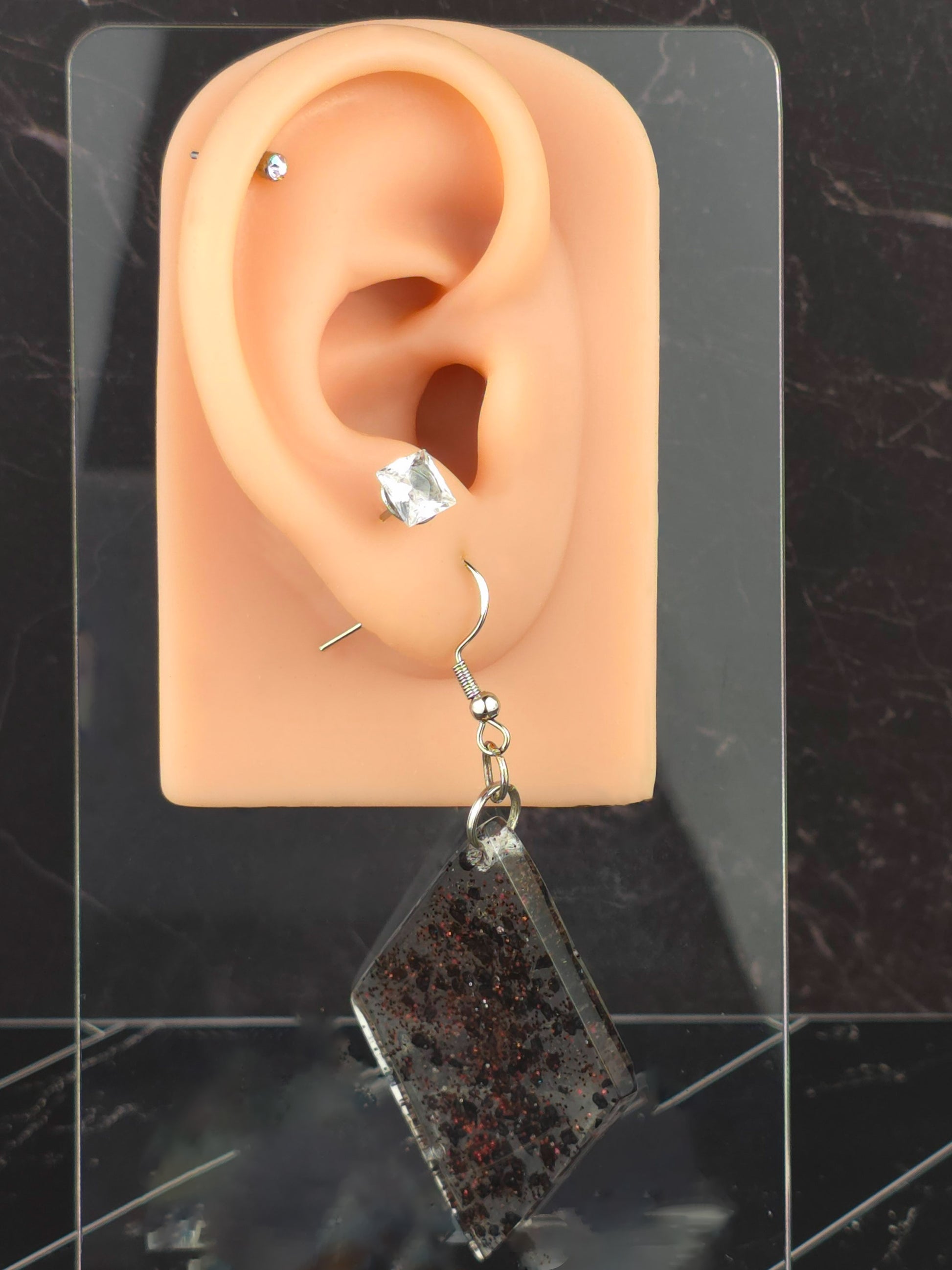 Find some elegance to add to your outfit with these stunning hook style earrings. Made with durable 304 stainless steel, these earrings feature a large diamond shaped pendant filled with clear epoxy resin and black rock flakes for a unique and eye-catching look. The earrings measure 8cm in total length, with a drop length of 6cm and a width of 3cm at the widest point of the pendant. The pendant itself measures 5cm x 3cm, making it a bold statement piece. Perfect for adding a touch of glamour to any outfit, these earrings are sure to turn heads wherever you go.