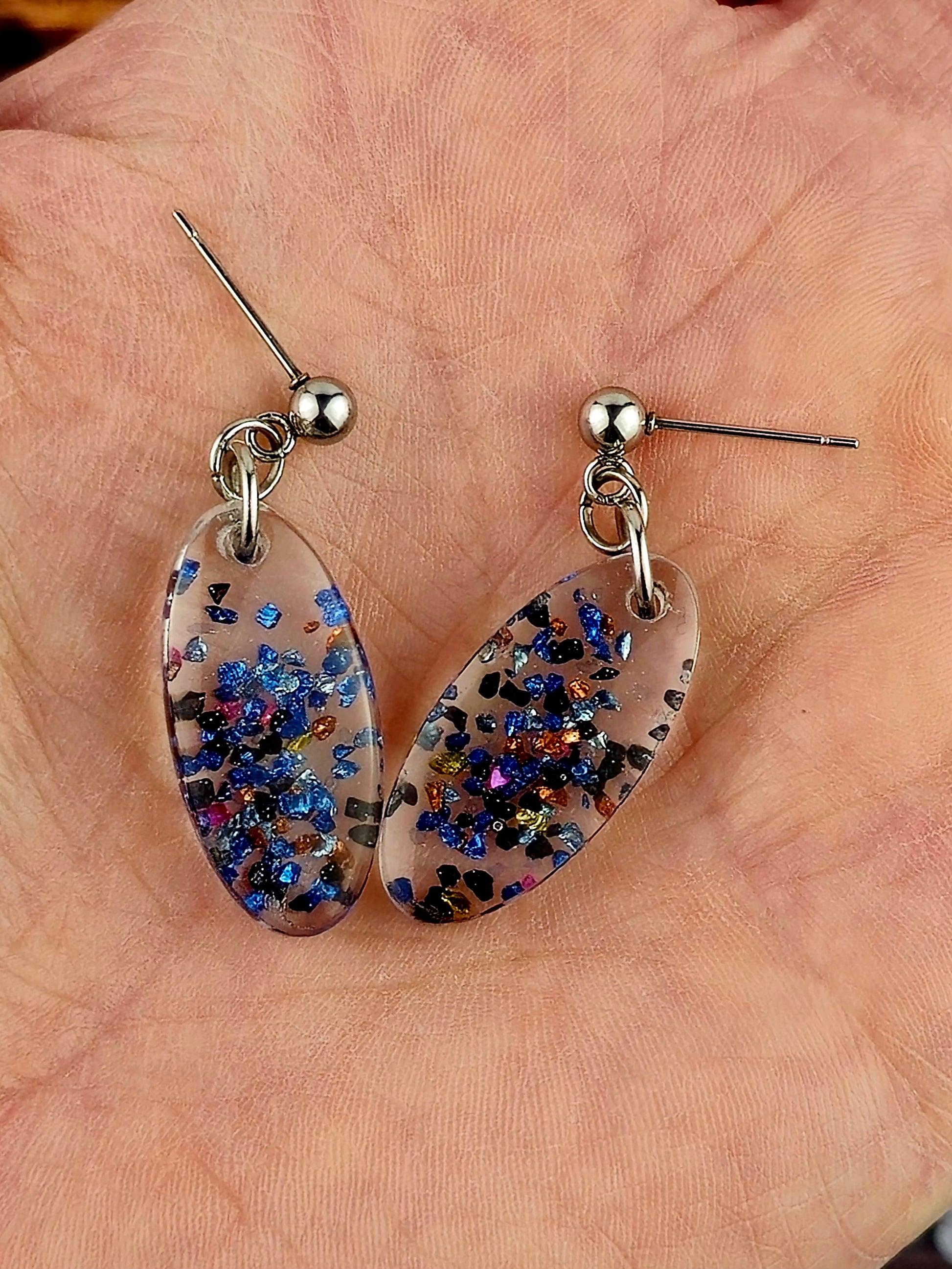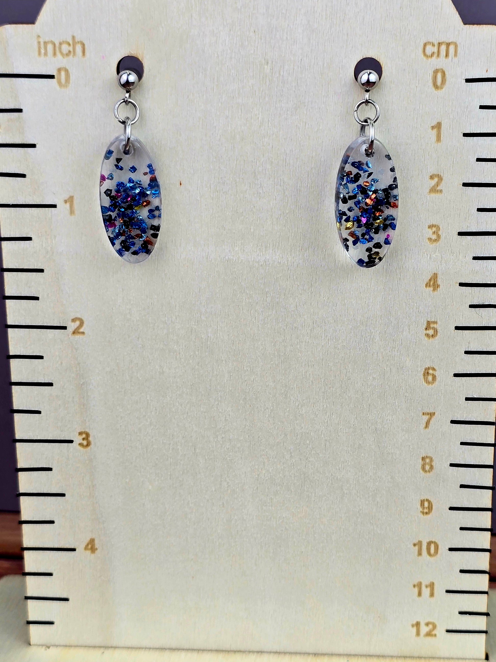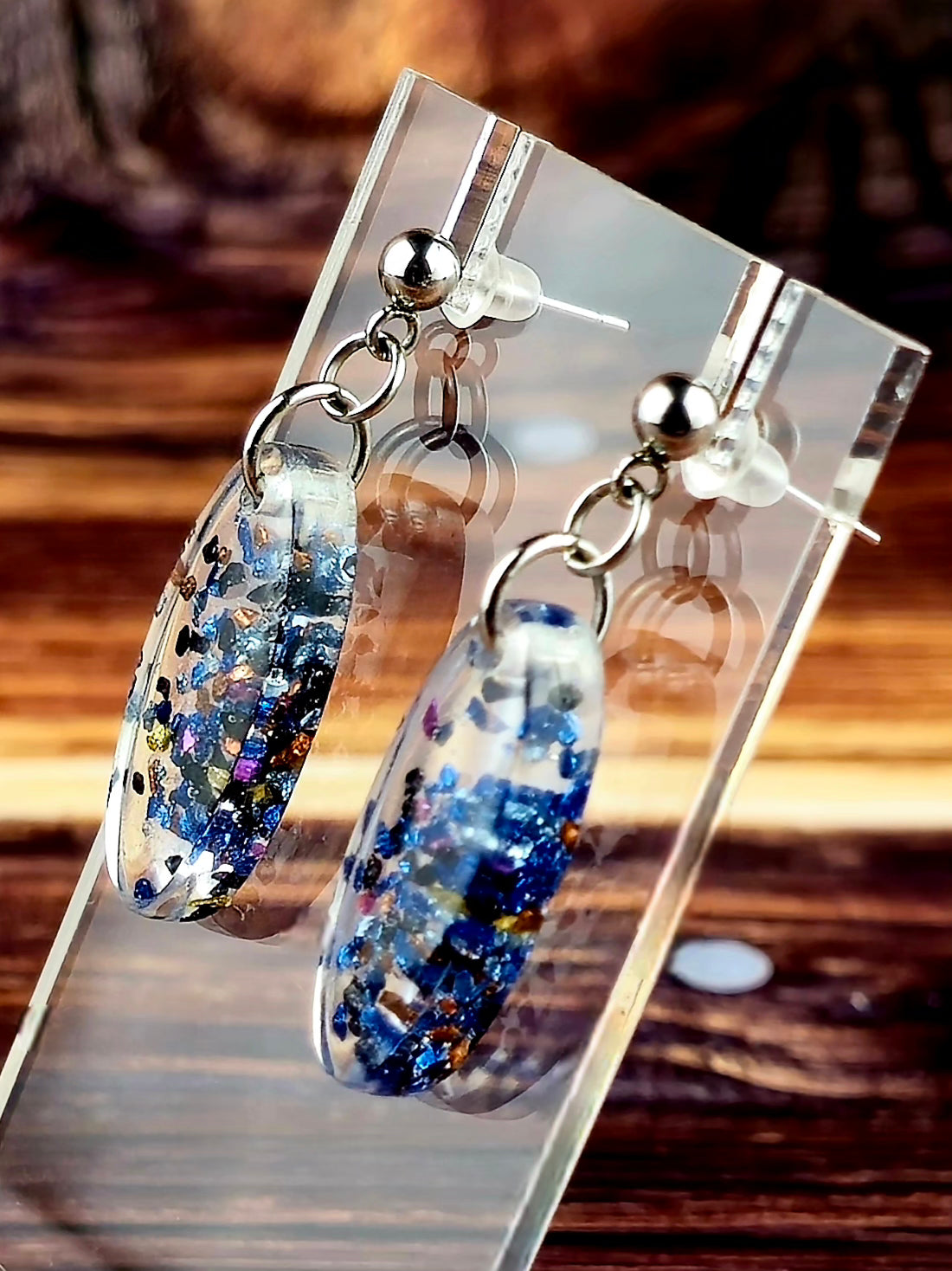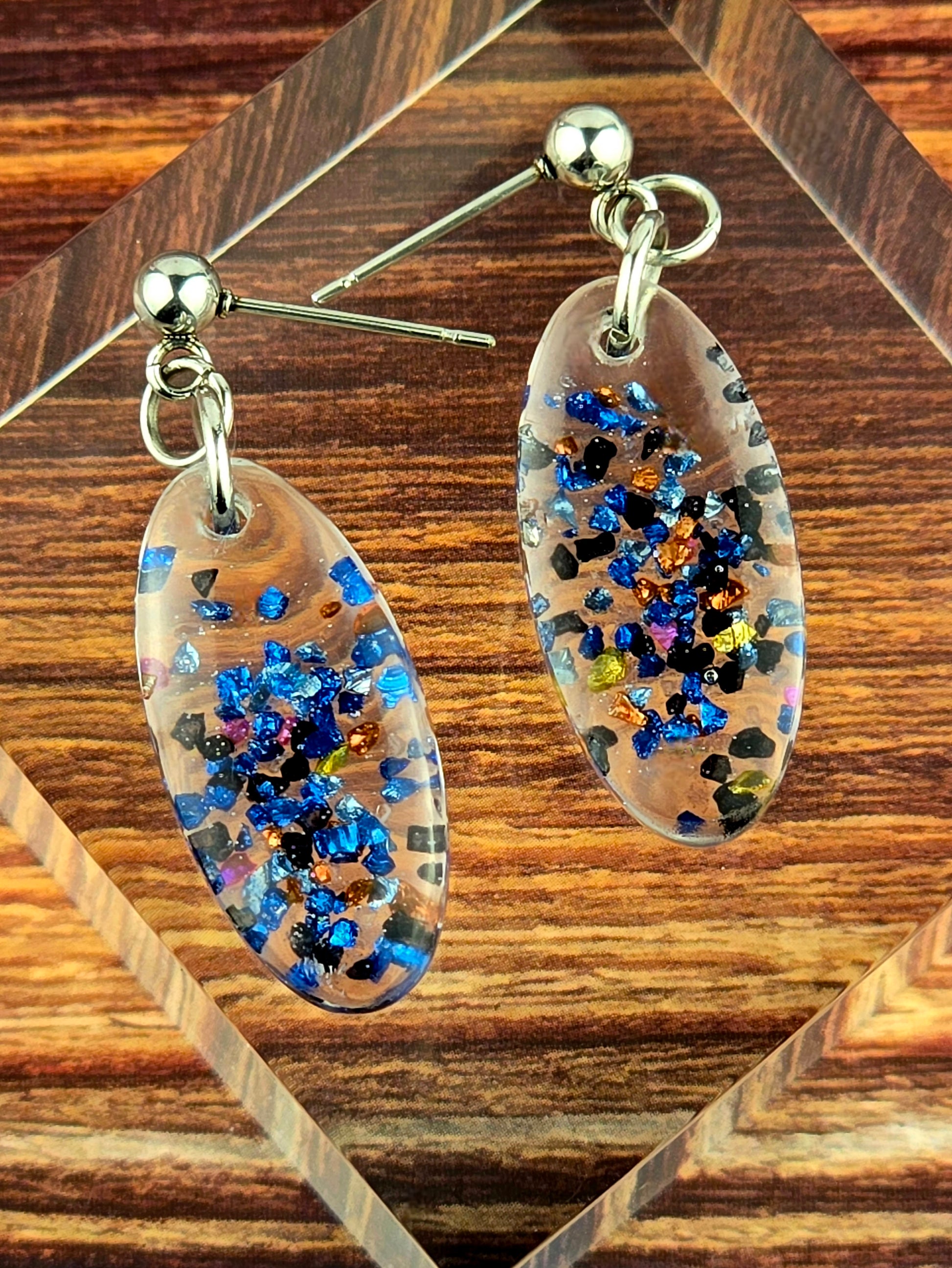 Add a touch of elegance and sparkle to your outfit with these stunning stainless steel ball post earrings. The earrings feature a unique oval epoxy resin pendant that is clear with a mesmerizing combination of blue and black glitter and rock flakes.
