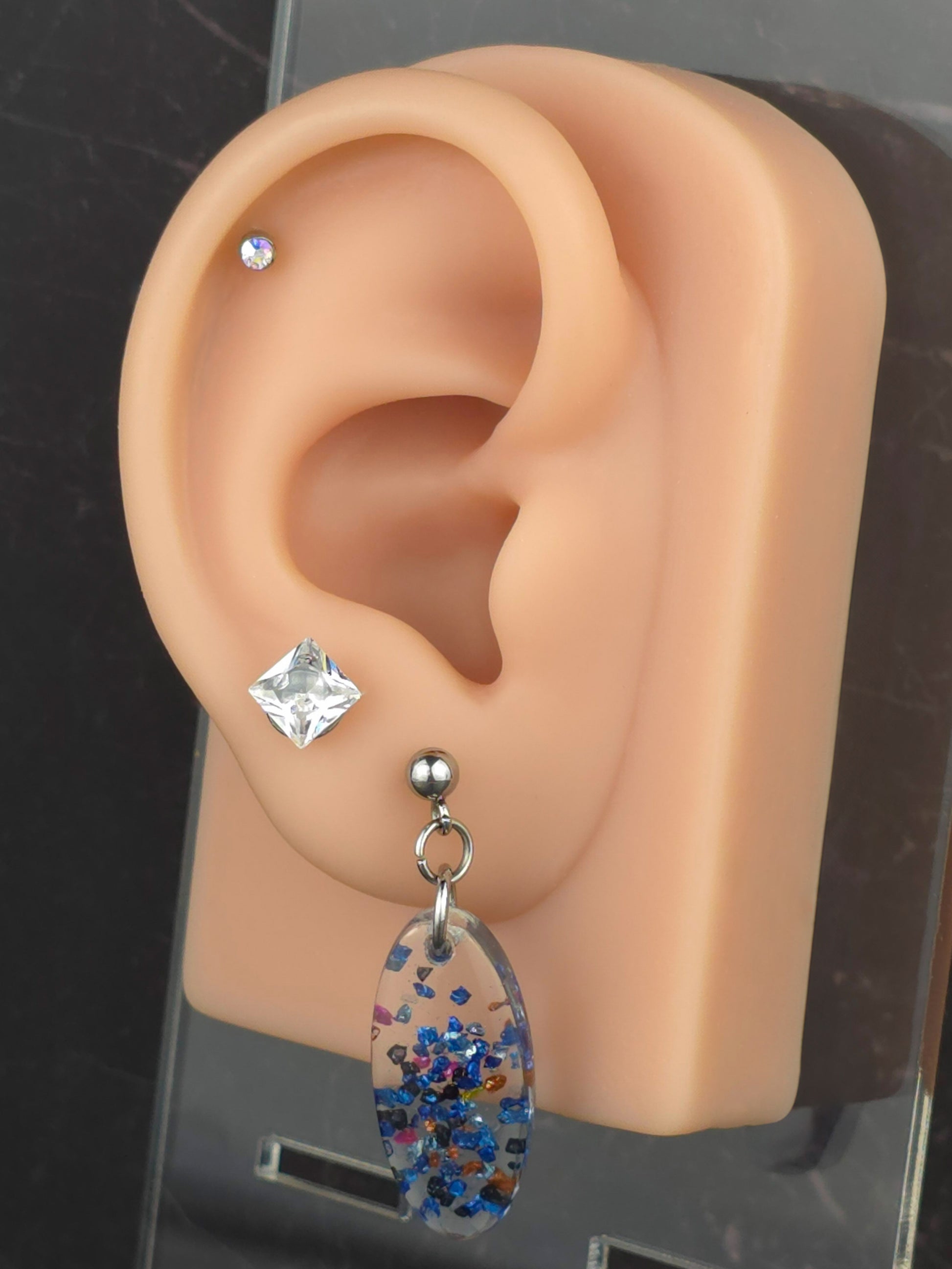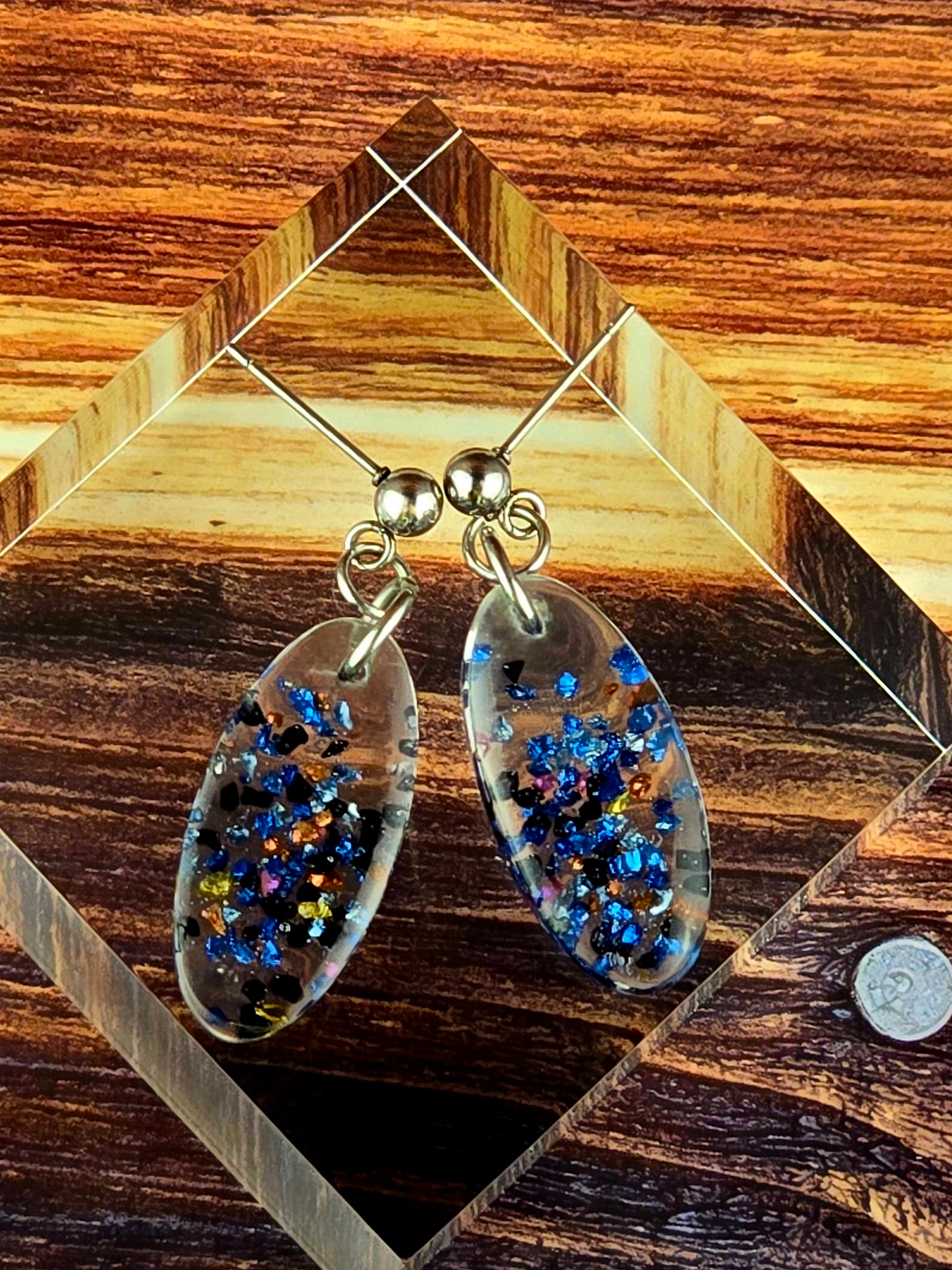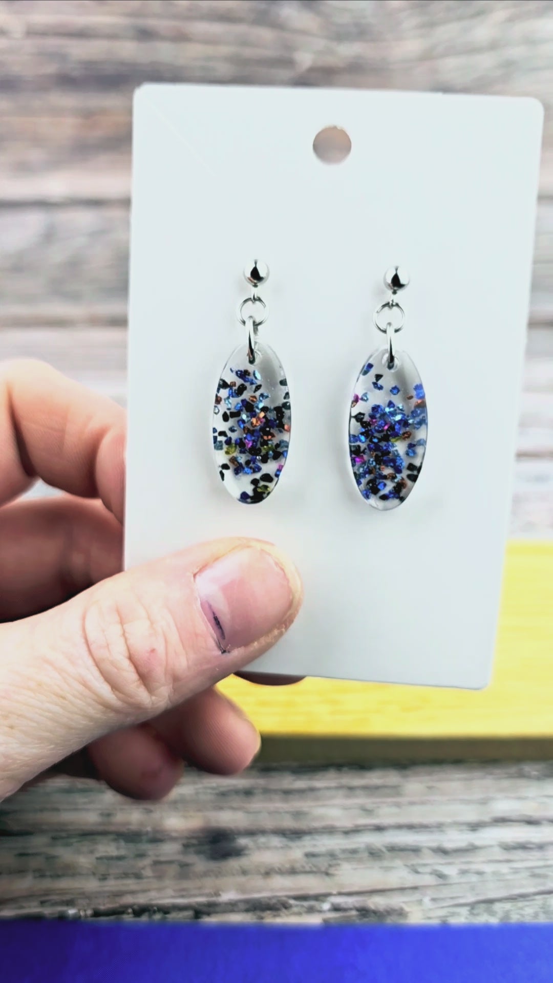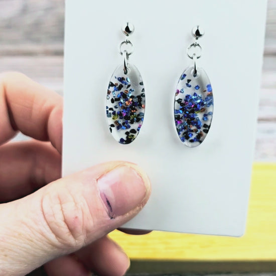 Add a touch of elegance and sparkle to your outfit with these stunning stainless steel ball post earrings. The earrings feature a unique oval epoxy resin pendant that is clear with a mesmerizing combination of blue and black glitter and rock flakes.