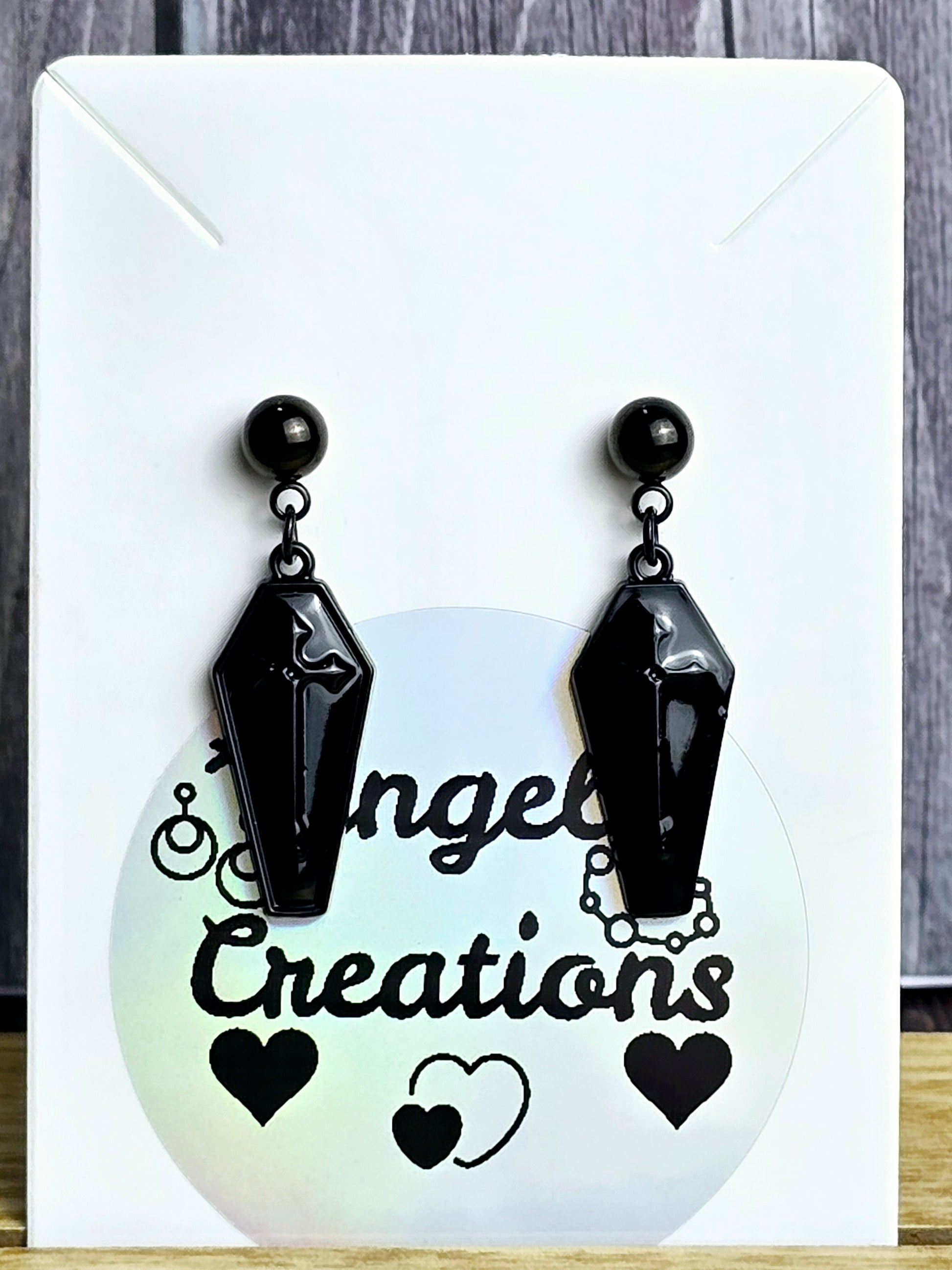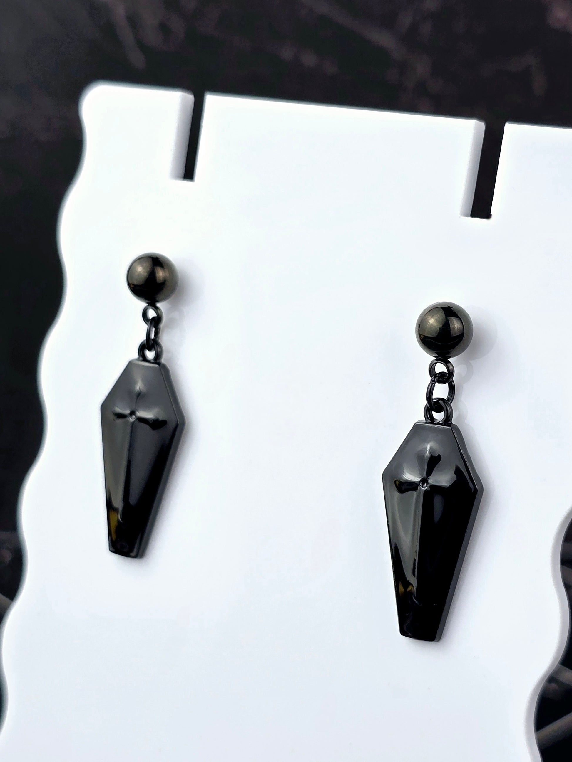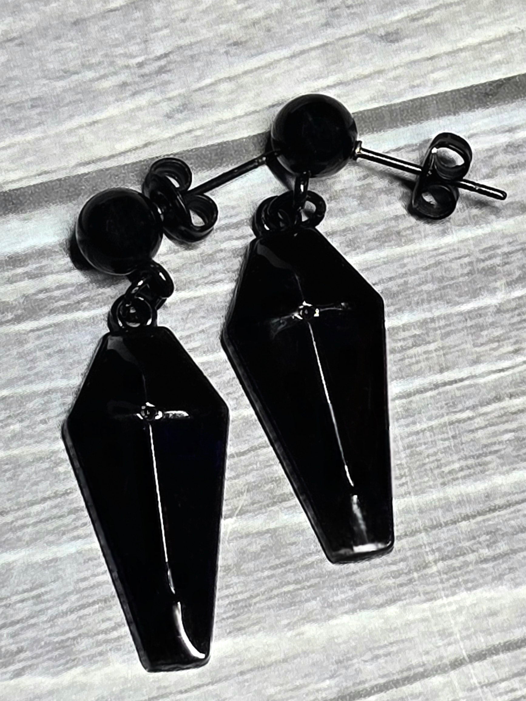 Add a touch of edgy style to your look with these black stainless steel ball post earrings featuring black enamel coated coffin charms. The earrings measure 3cm in length with a drop length of 2.5cm and are 1cm wide. They are secured with a 1.6mm ball post and 0.8mm pin and loop closure, and come with both butterfly and silicone earring backs for added comfort and security. Perfect for adding a dark and mysterious vibe to any outfit.
