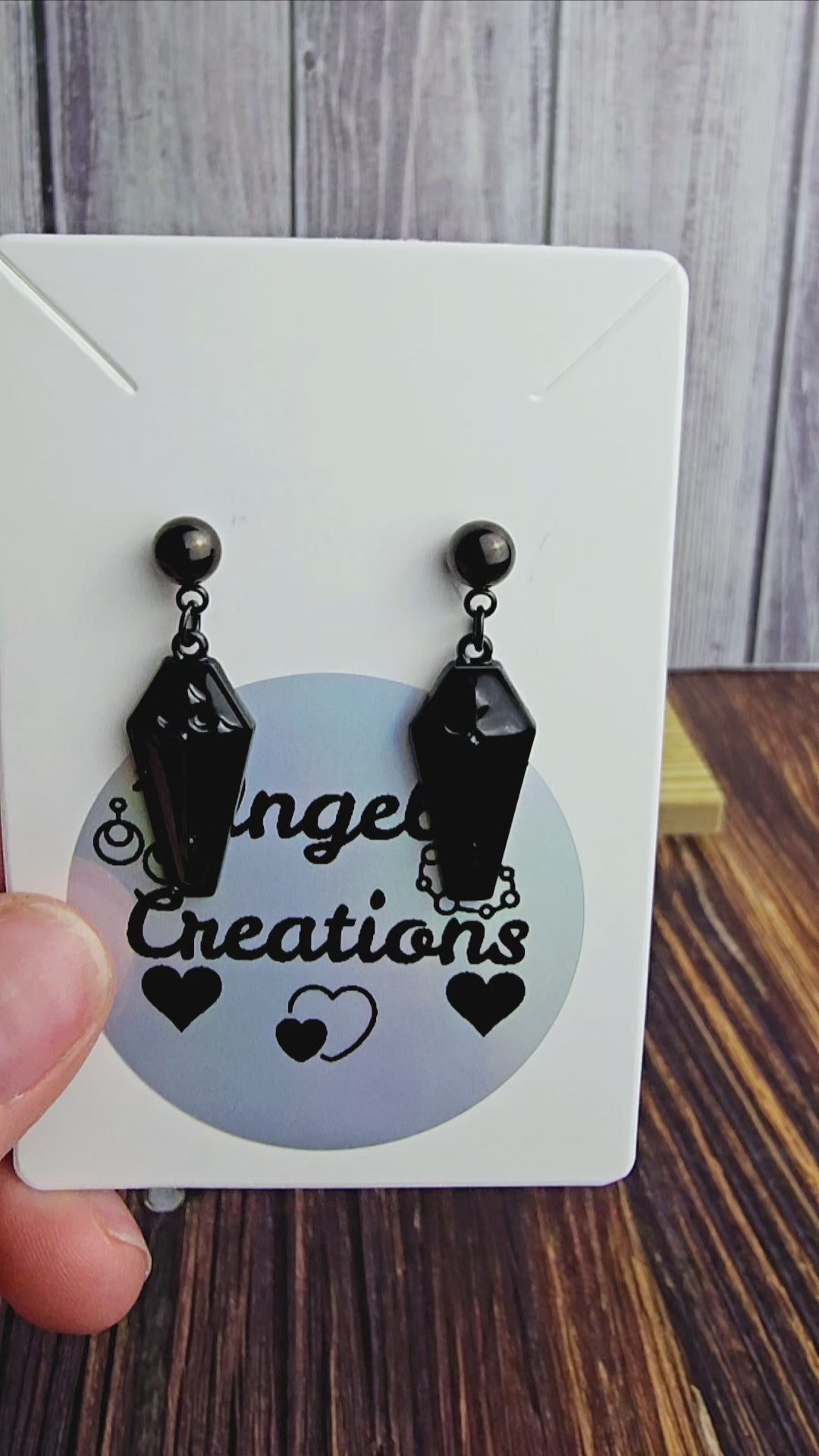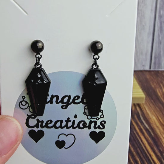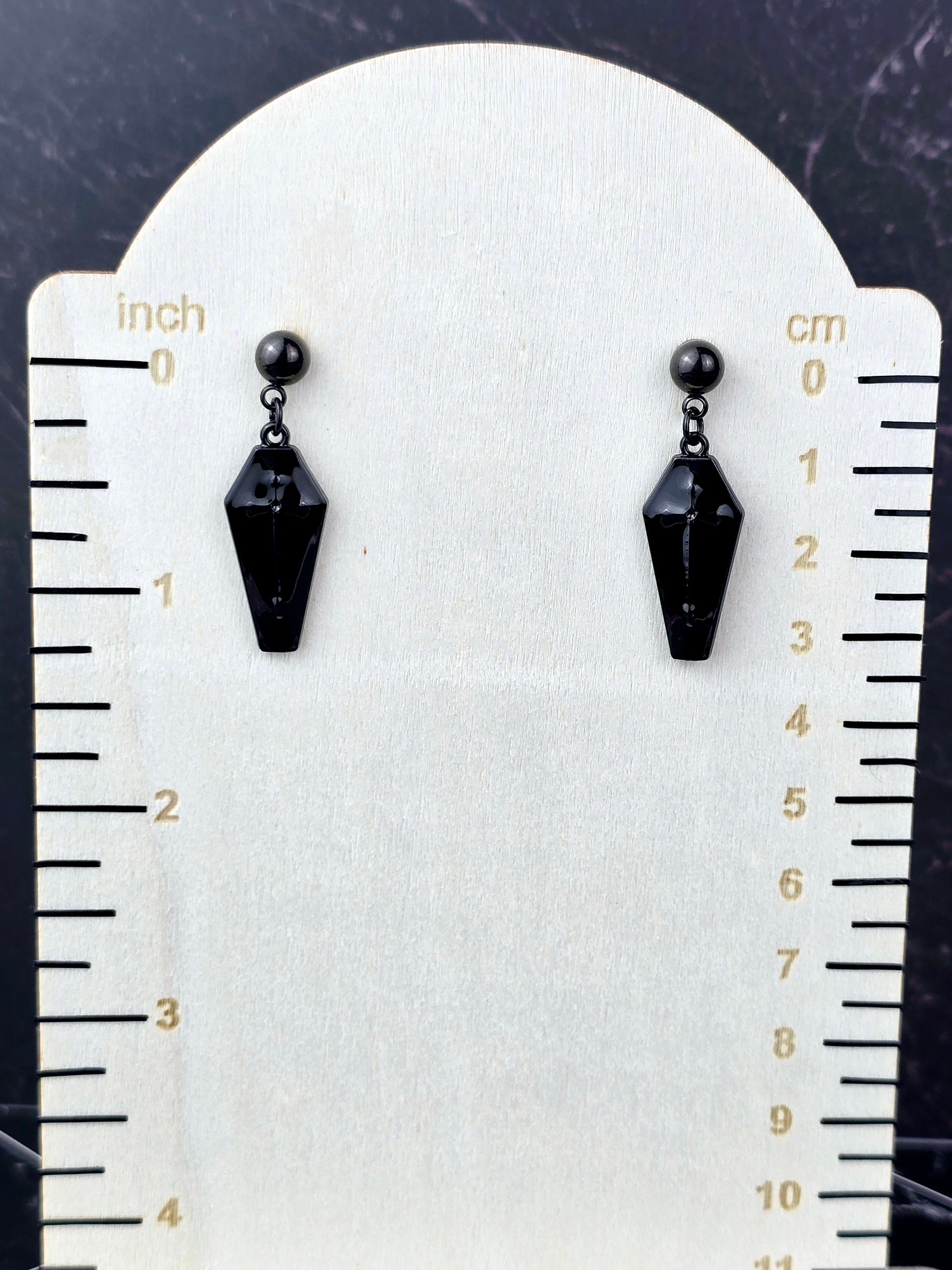 Add a touch of edgy style to your look with these black stainless steel ball post earrings featuring black enamel coated coffin charms. The earrings measure 3cm in length with a drop length of 2.5cm and are 1cm wide. They are secured with a 1.6mm ball post and 0.8mm pin and loop closure, and come with both butterfly and silicone earring backs for added comfort and security. Perfect for adding a dark and mysterious vibe to any outfit.