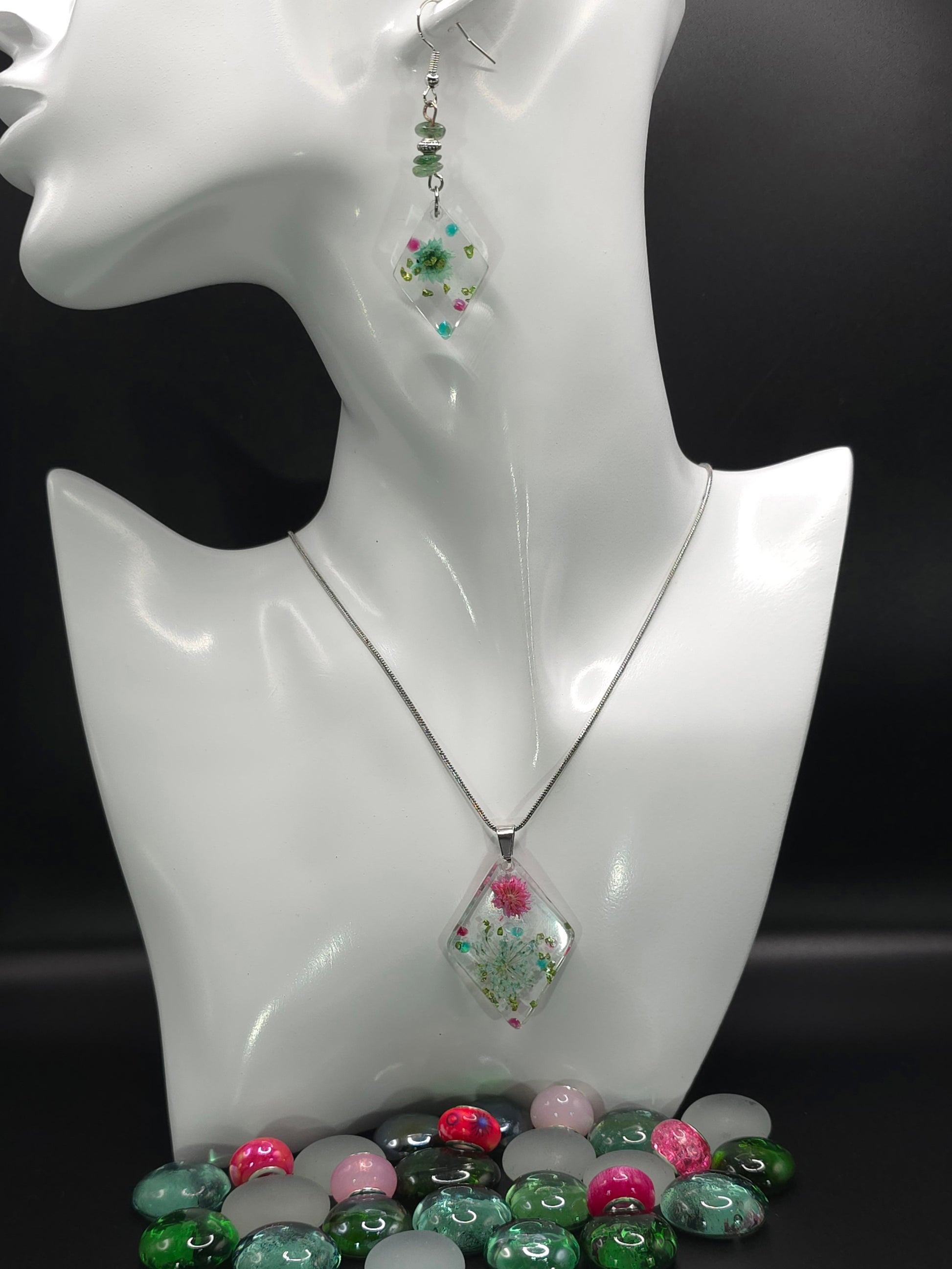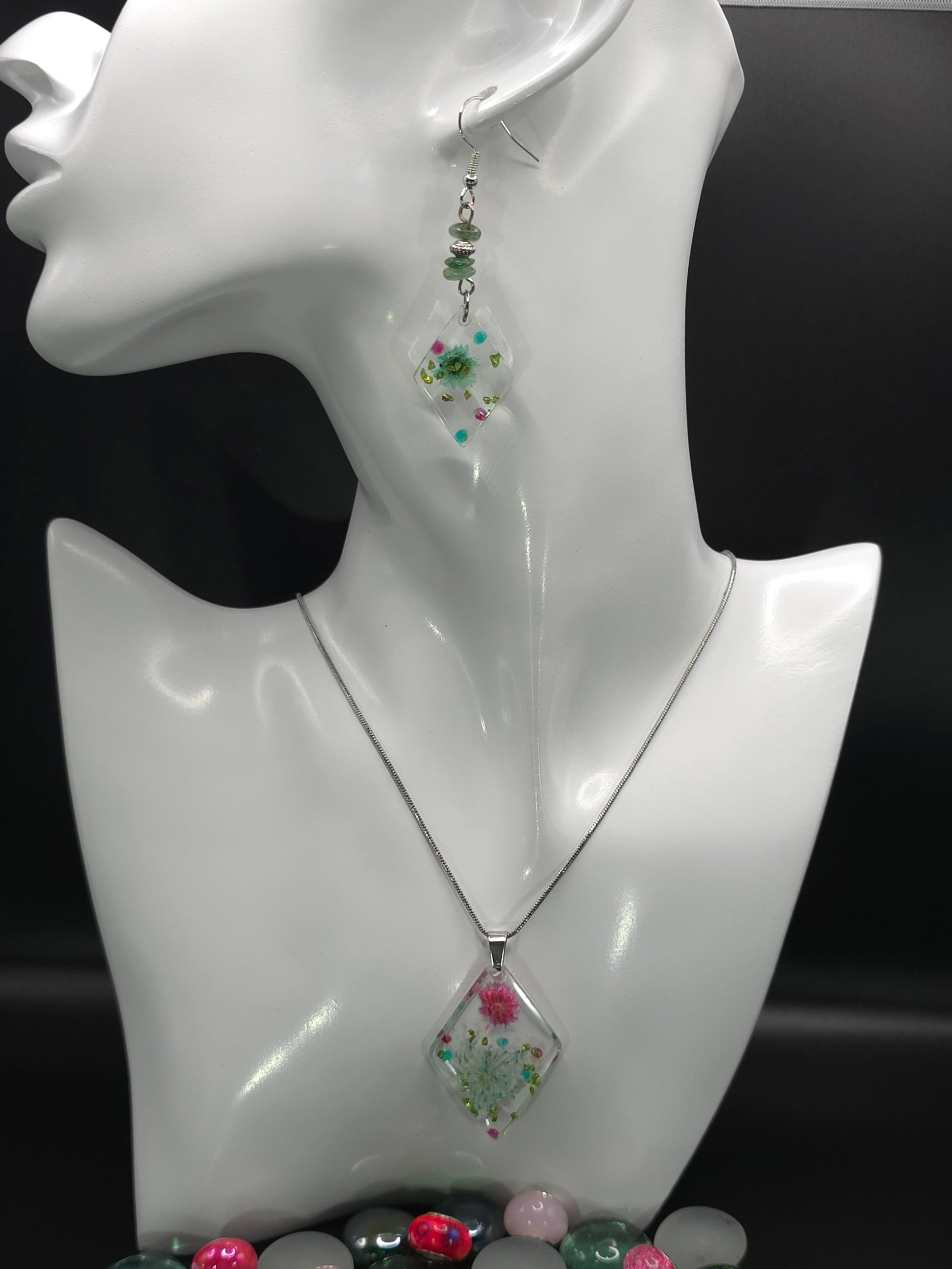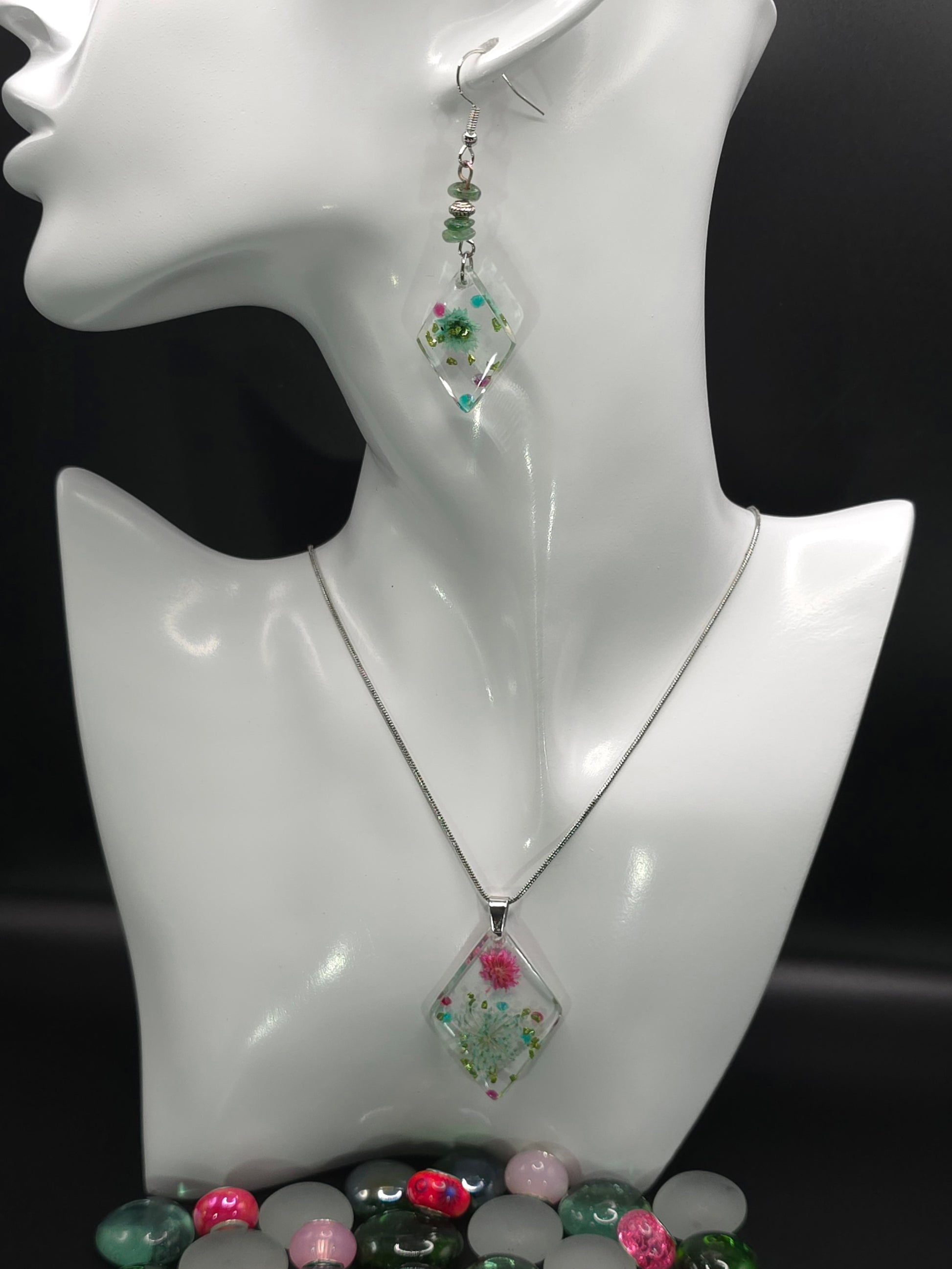Stand out from the crowd with our stunning and beautiful flower set. The stainless steel snake chain necklace and earring hooks ensure durability and longevity. The resin charm features a vibrant pink flower and eye-catching blueish green gems. Elevate your style with this unique and elegant accessory. The necklace in this set is 47cm long, with a drop length of 27.5cm (including resin pendant). Resin necklace pendant is 4.5cm long by 3cm wide (at the widest point of pendant). The earrings in this set are 6cm long, with a drop length of 4.5cm. Resin Earring pendants are 3cm long by 2cm wide (at widest point of pendant).