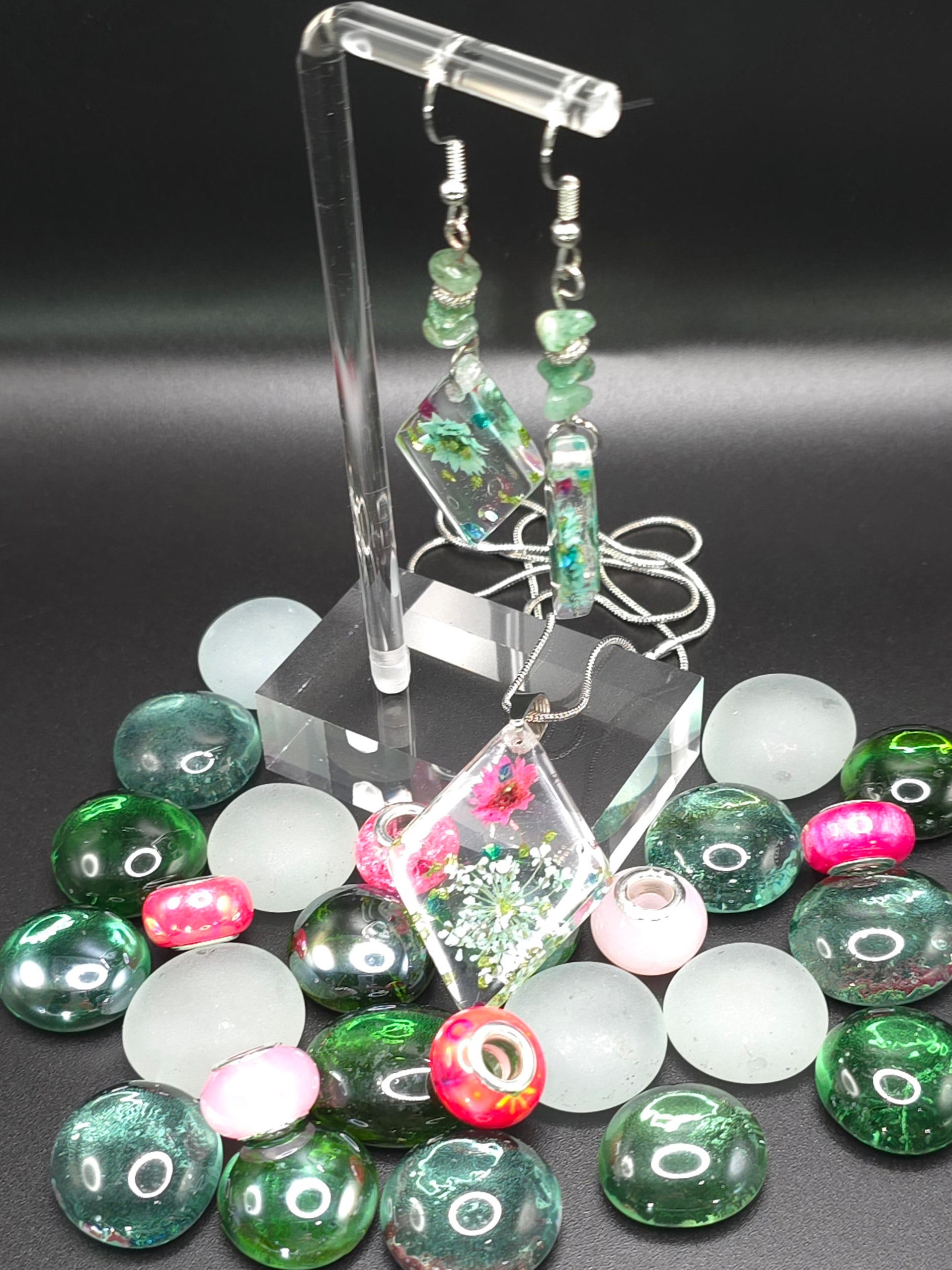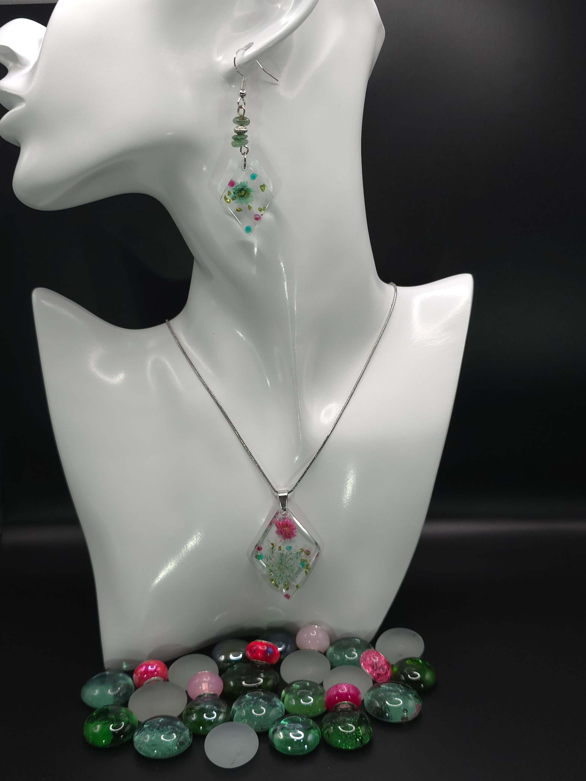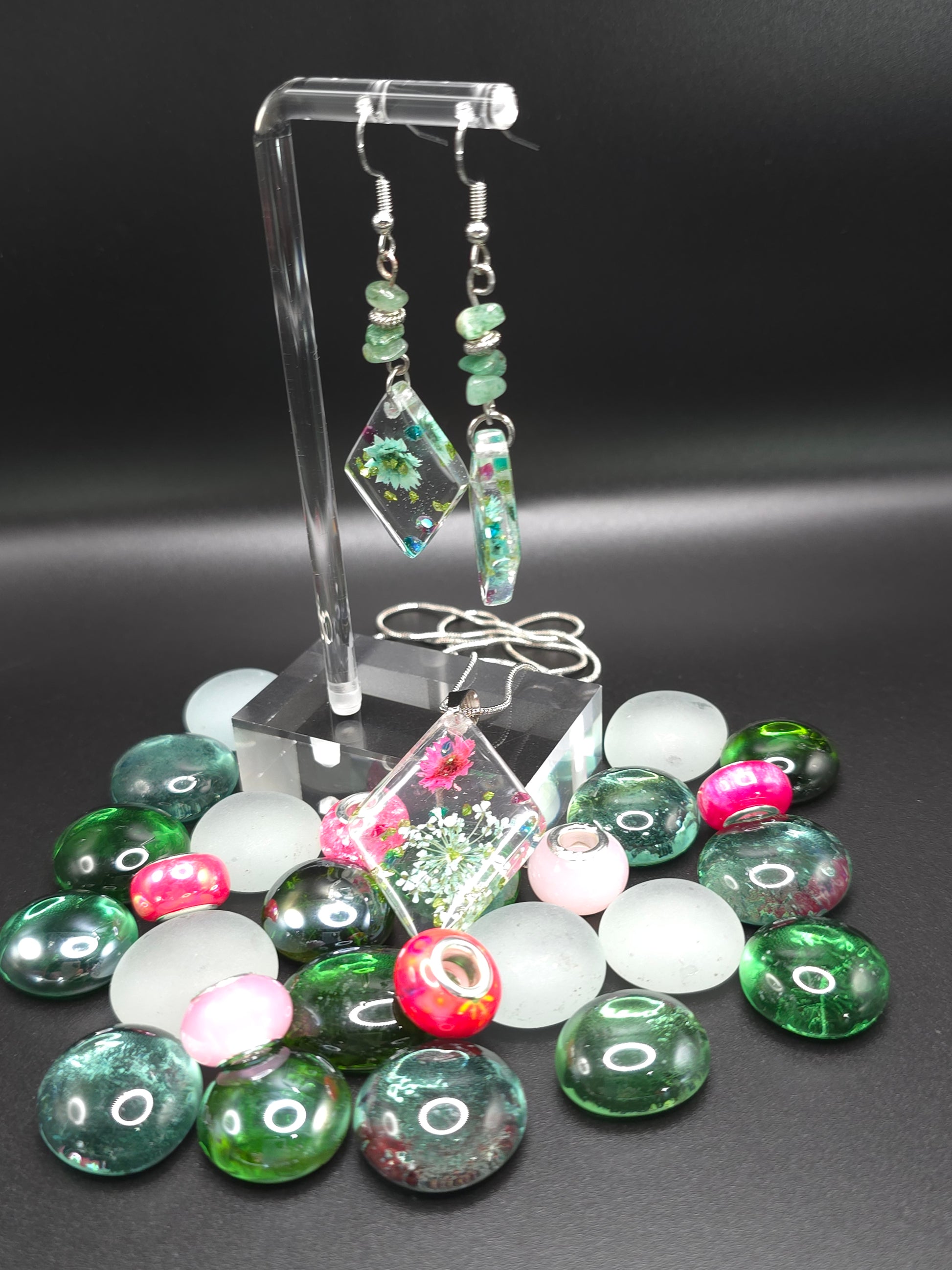 Stand out from the crowd with our stunning and beautiful flower set. The stainless steel snake chain necklace and earring hooks ensure durability and longevity. The resin charm features a vibrant pink flower and eye-catching blueish green gems. Elevate your style with this unique and elegant accessory. The necklace in this set is 47cm long, with a drop length of 27.5cm (including resin pendant). Resin necklace pendant is 4.5cm long by 3cm wide (at the widest point of pendant). The earrings in this set are 6cm long, with a drop length of 4.5cm. Resin Earring pendants are 3cm long by 2cm wide (at widest point of pendant).