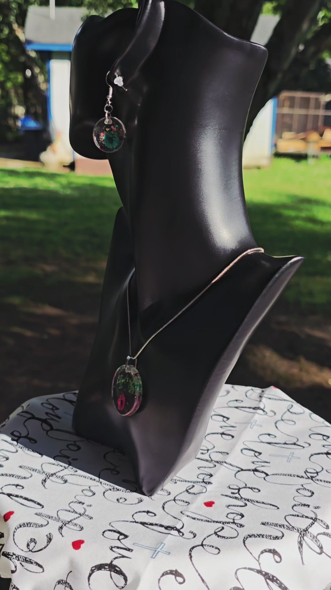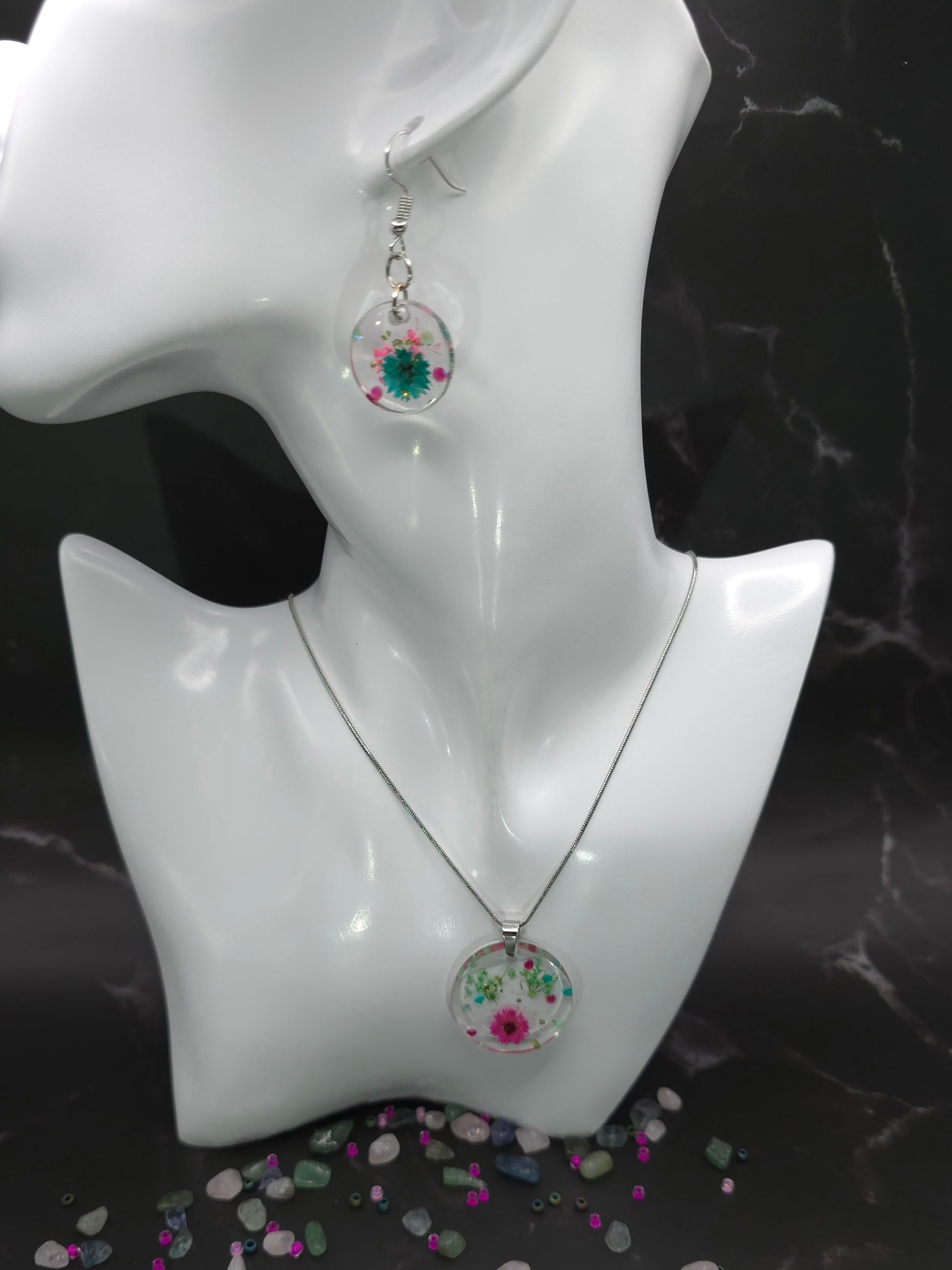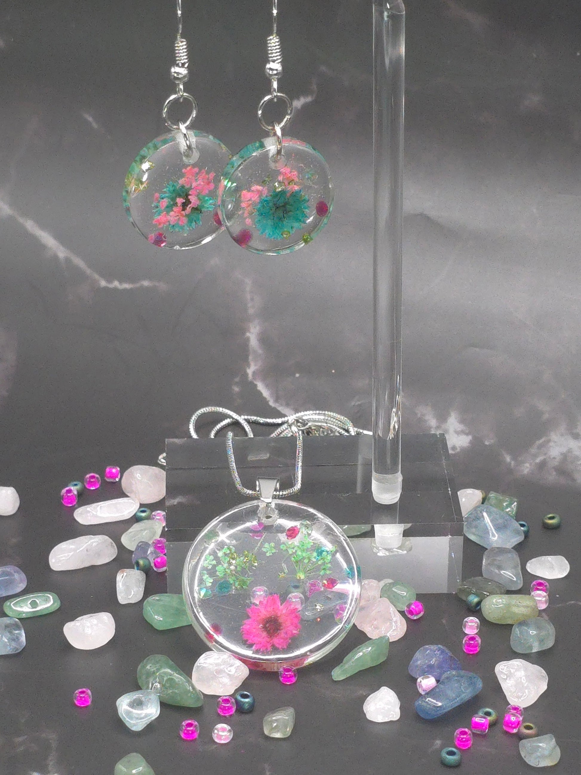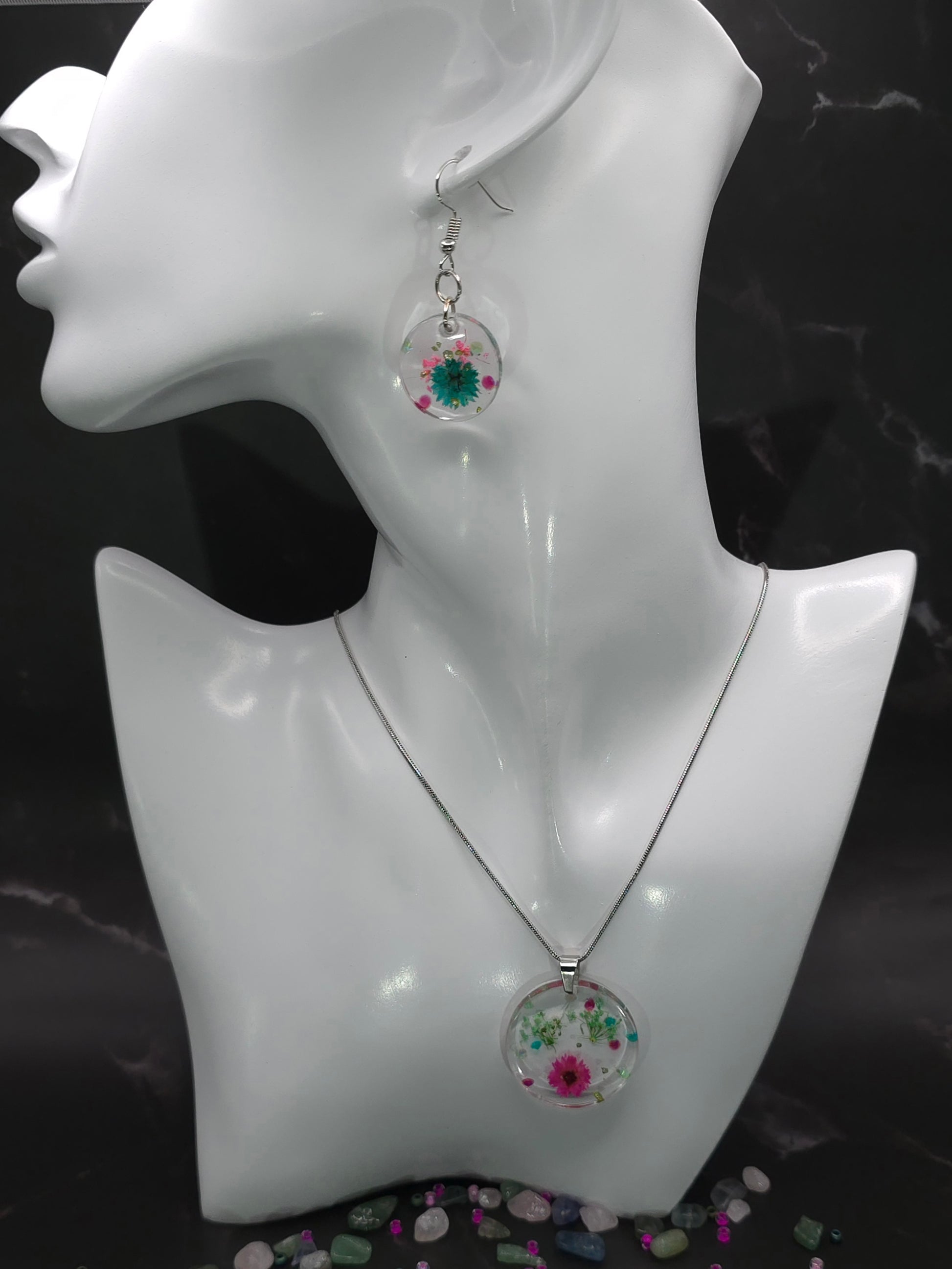 This gorgeous necklace and earring set features real dried flowers encased clear epxoy resin. Each pendant is circular in shape and has accents placed expertly in order to showcase the flowers inside. The earring showcase a single green flower, while the necklace pendant features a single pink flower encased in premium epoxy resin. Made with stainless steel hooks and jumperings. The necklace is a stainless steel snake chain with lobster clasp. The necklace in this set is 47cm long, with a drop length of 26.5cm (including the pendant). Necklace pendent is 3cm long by 3cm wide (at widest point of pendant). The earrings are 4cm long, with a drop length of 2.5cm. Resin pendants in this set are 2cm long by 2cm wide (at widest point of pendant).