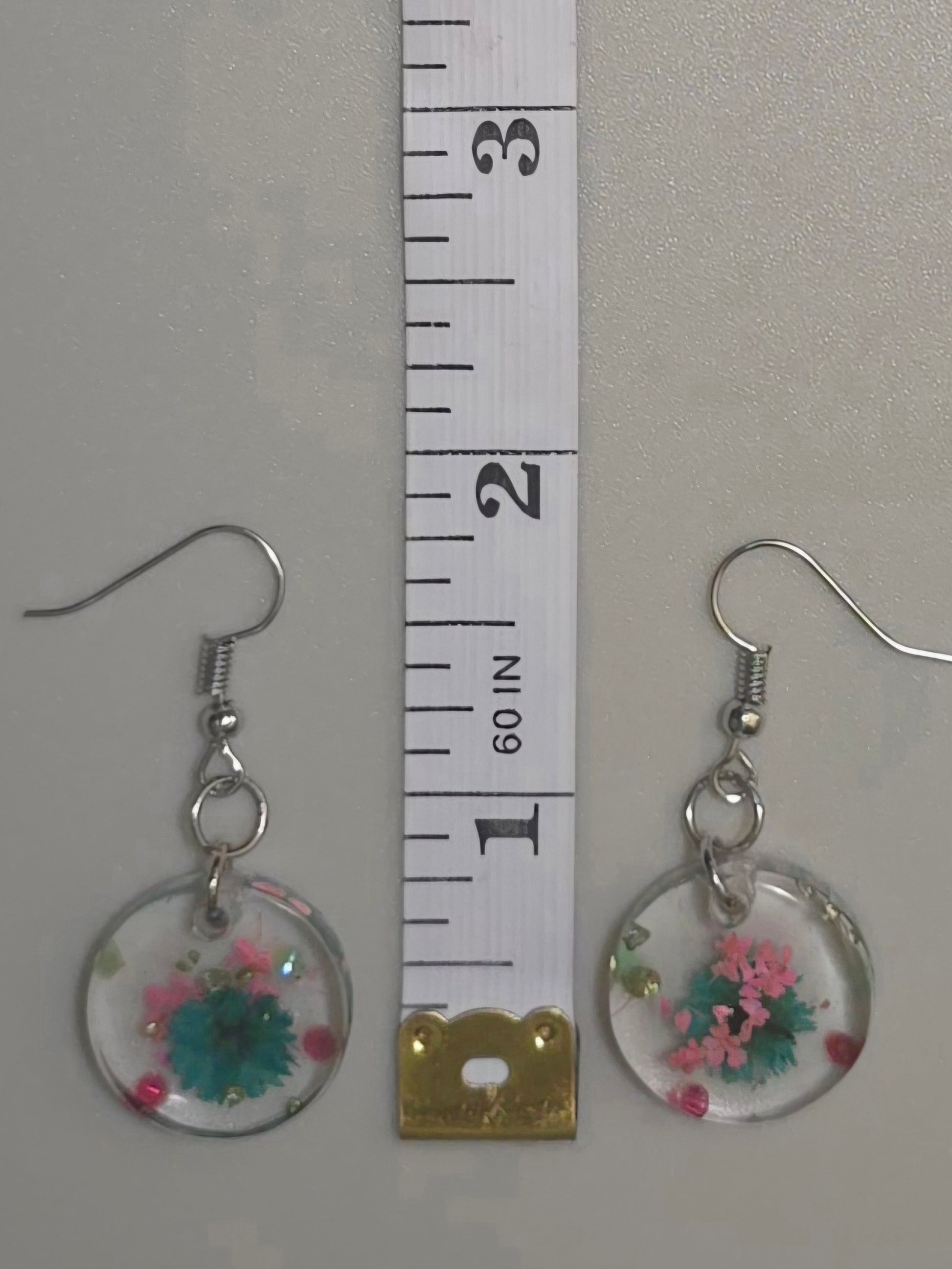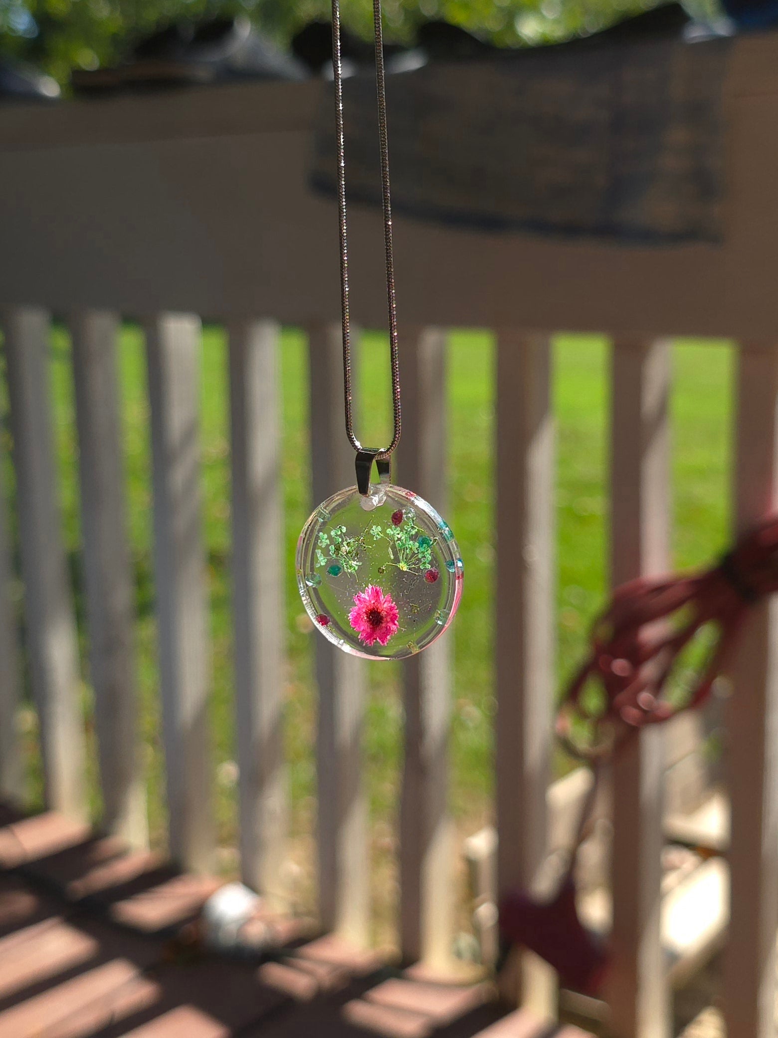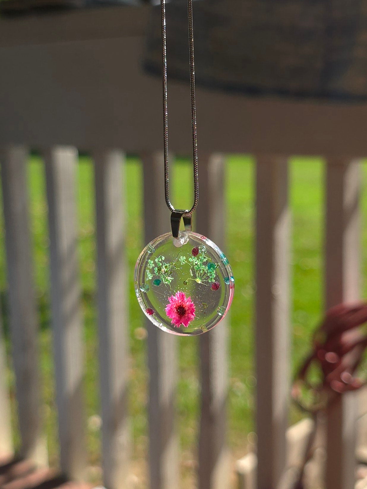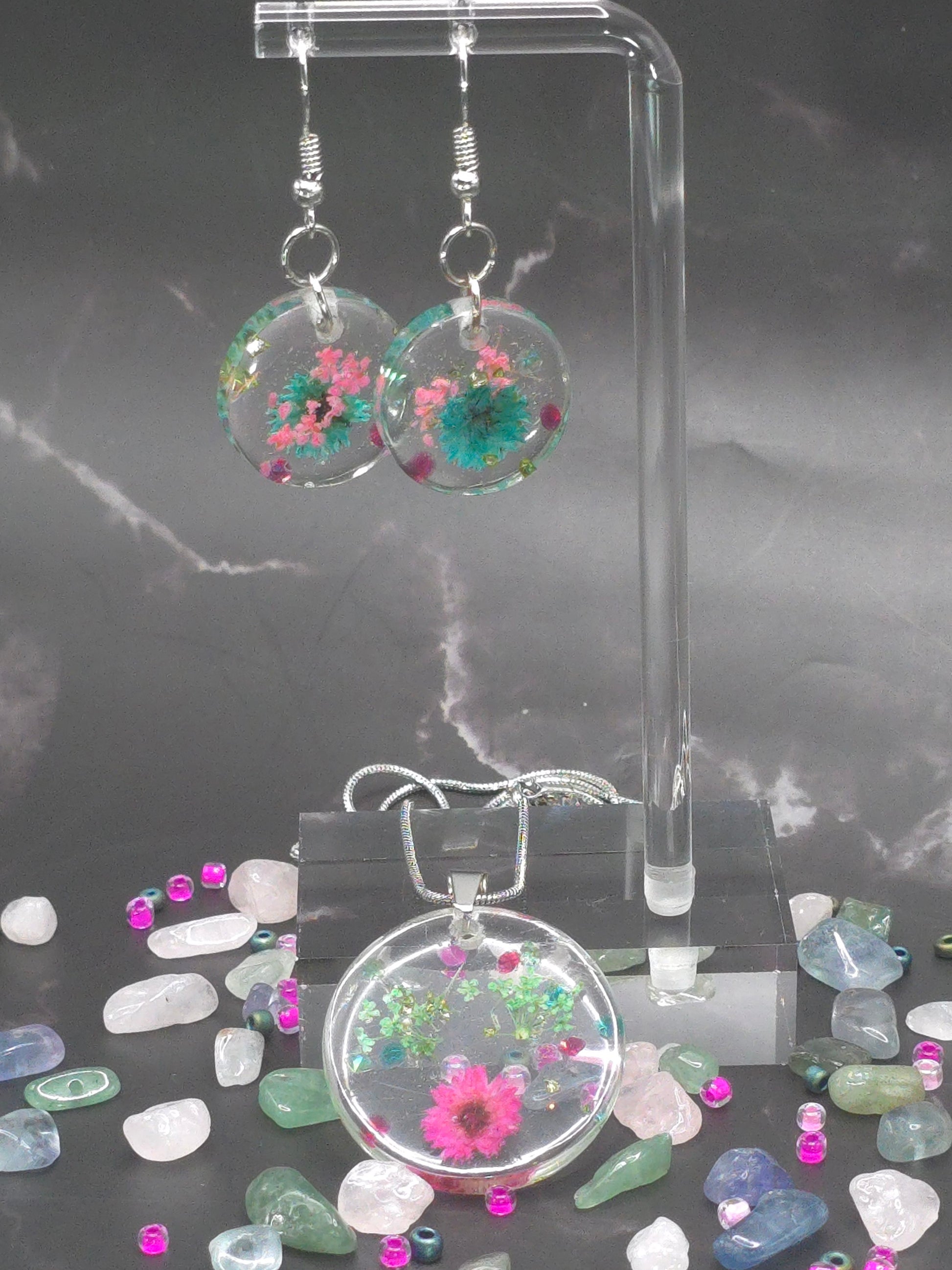 This gorgeous necklace and earring set features real dried flowers encased clear epxoy resin. Each pendant is circular in shape and has accents placed expertly in order to showcase the flowers inside. The earring showcase a single green flower, while the necklace pendant features a single pink flower encased in premium epoxy resin. Made with stainless steel hooks and jumperings. The necklace is a stainless steel snake chain with lobster clasp. The necklace in this set is 47cm long, with a drop length of 26.5cm (including the pendant). Necklace pendent is 3cm long by 3cm wide (at widest point of pendant). The earrings are 4cm long, with a drop length of 2.5cm. Resin pendants in this set are 2cm long by 2cm wide (at widest point of pendant).