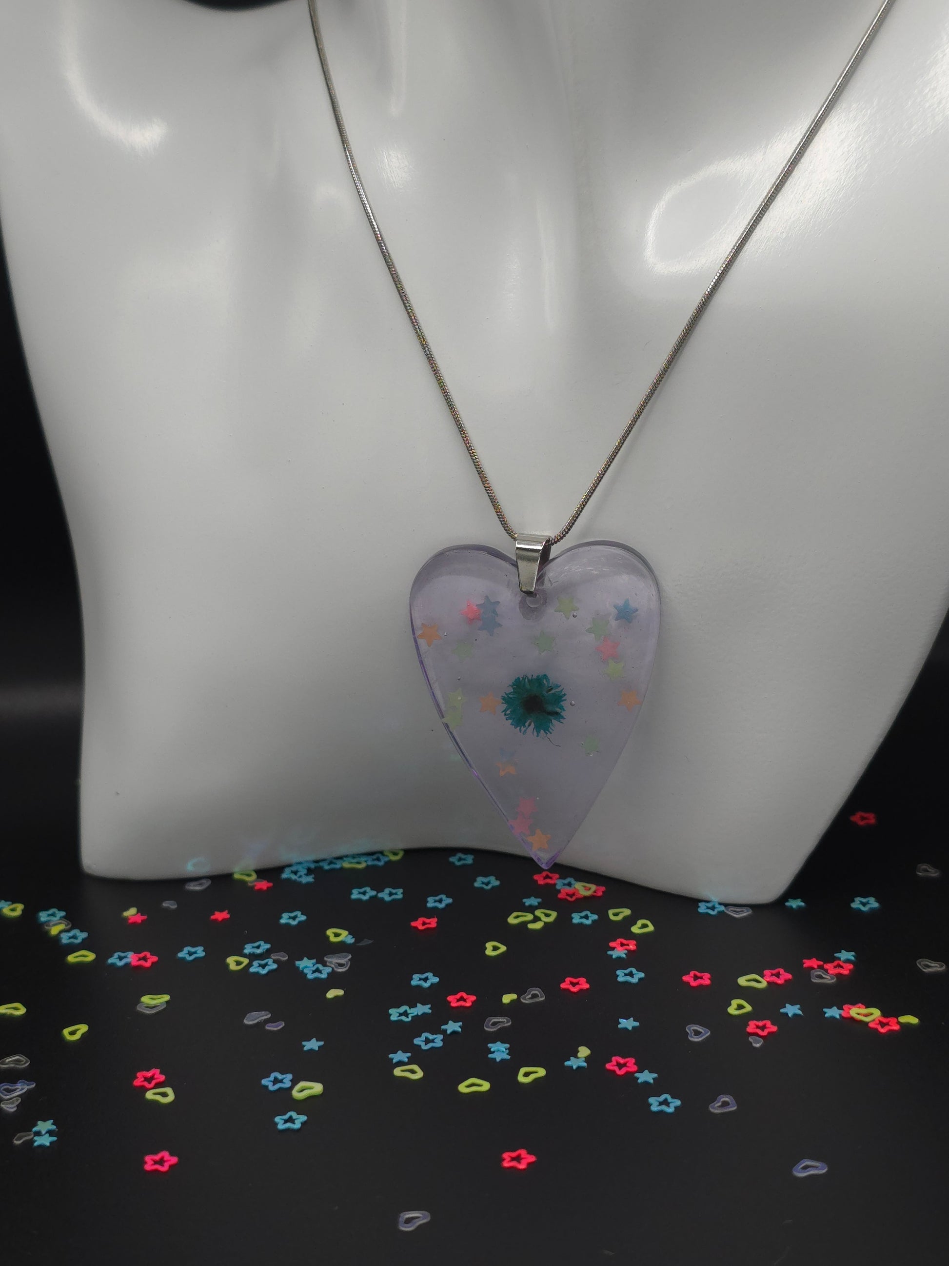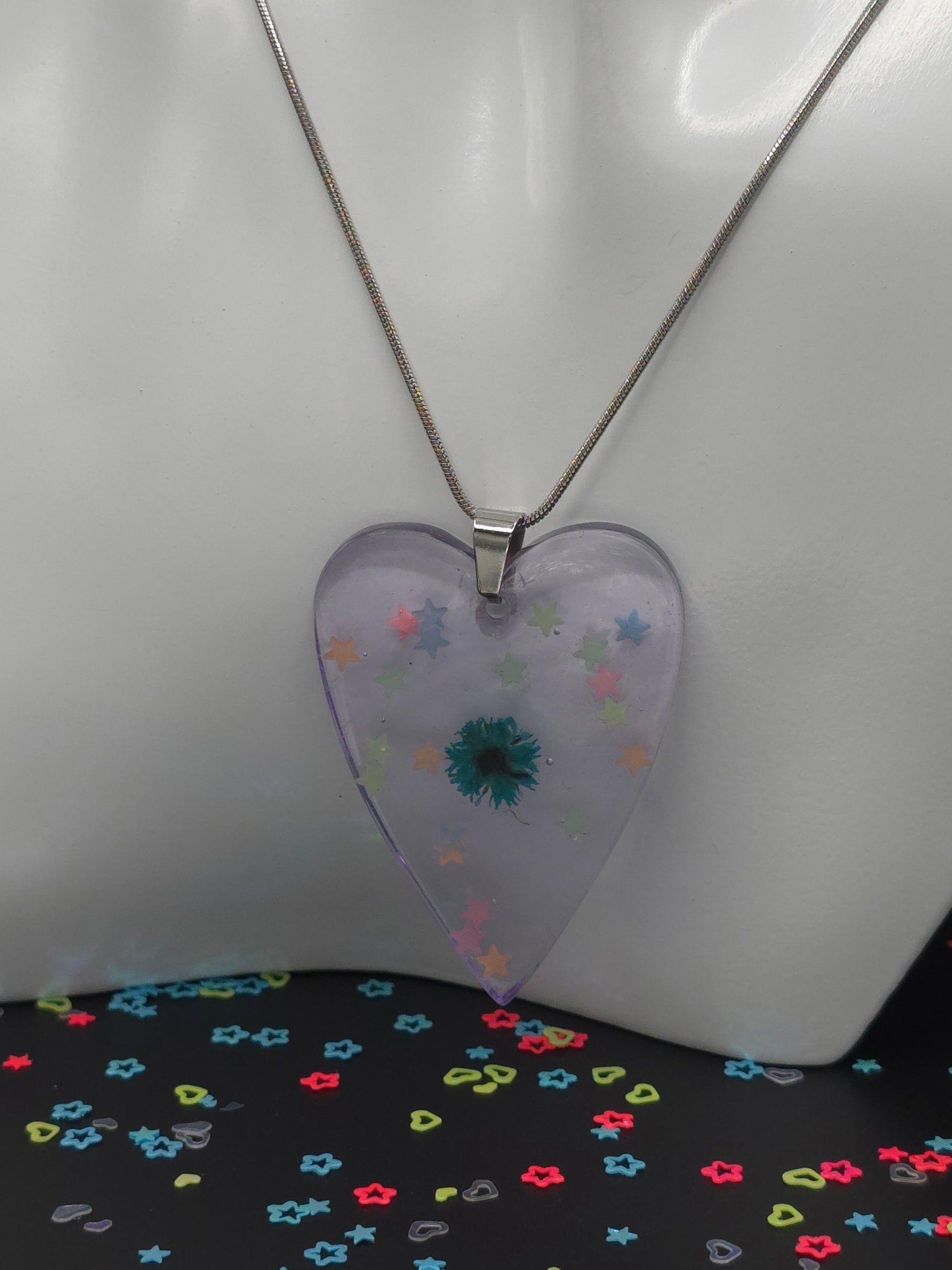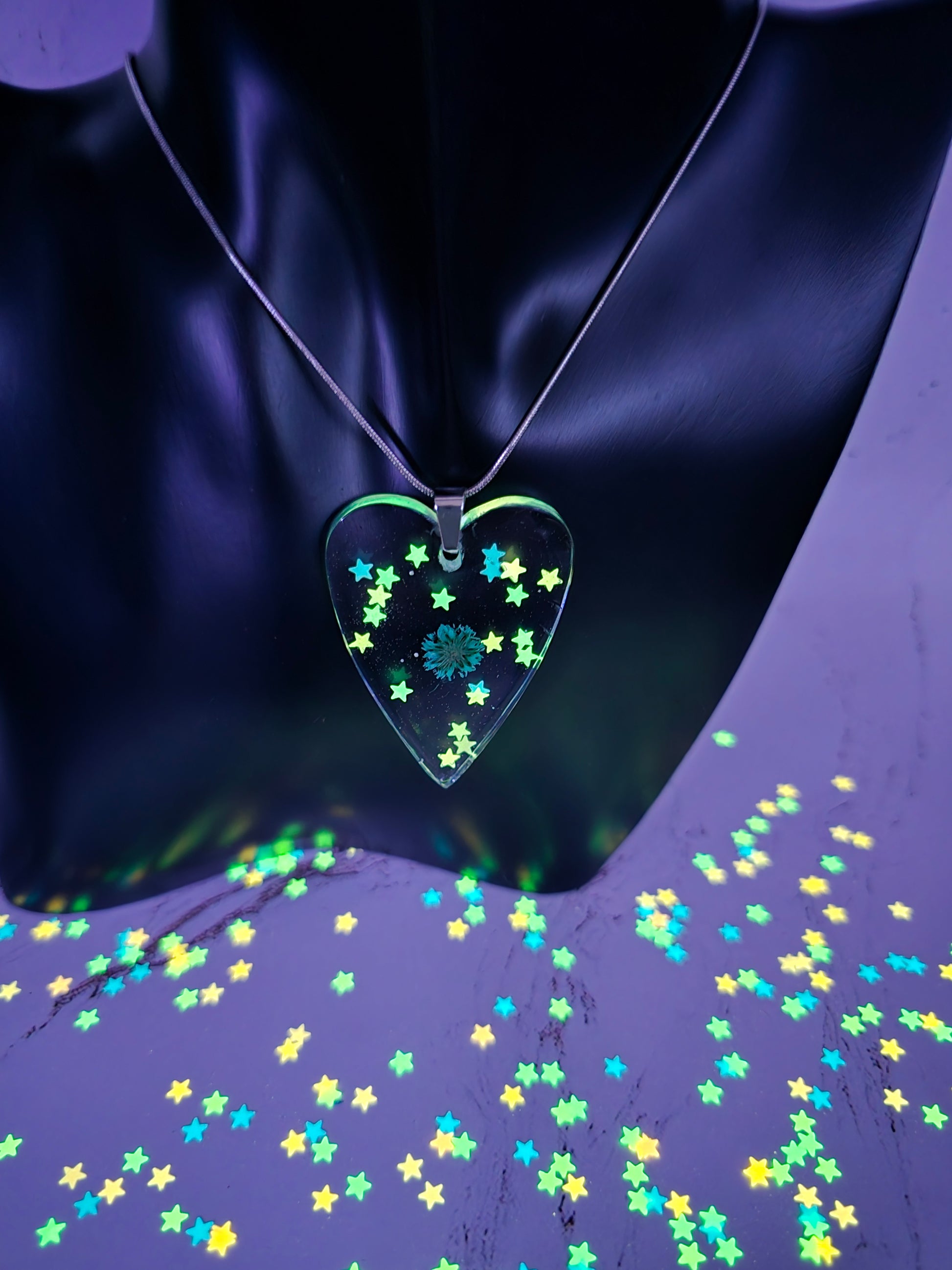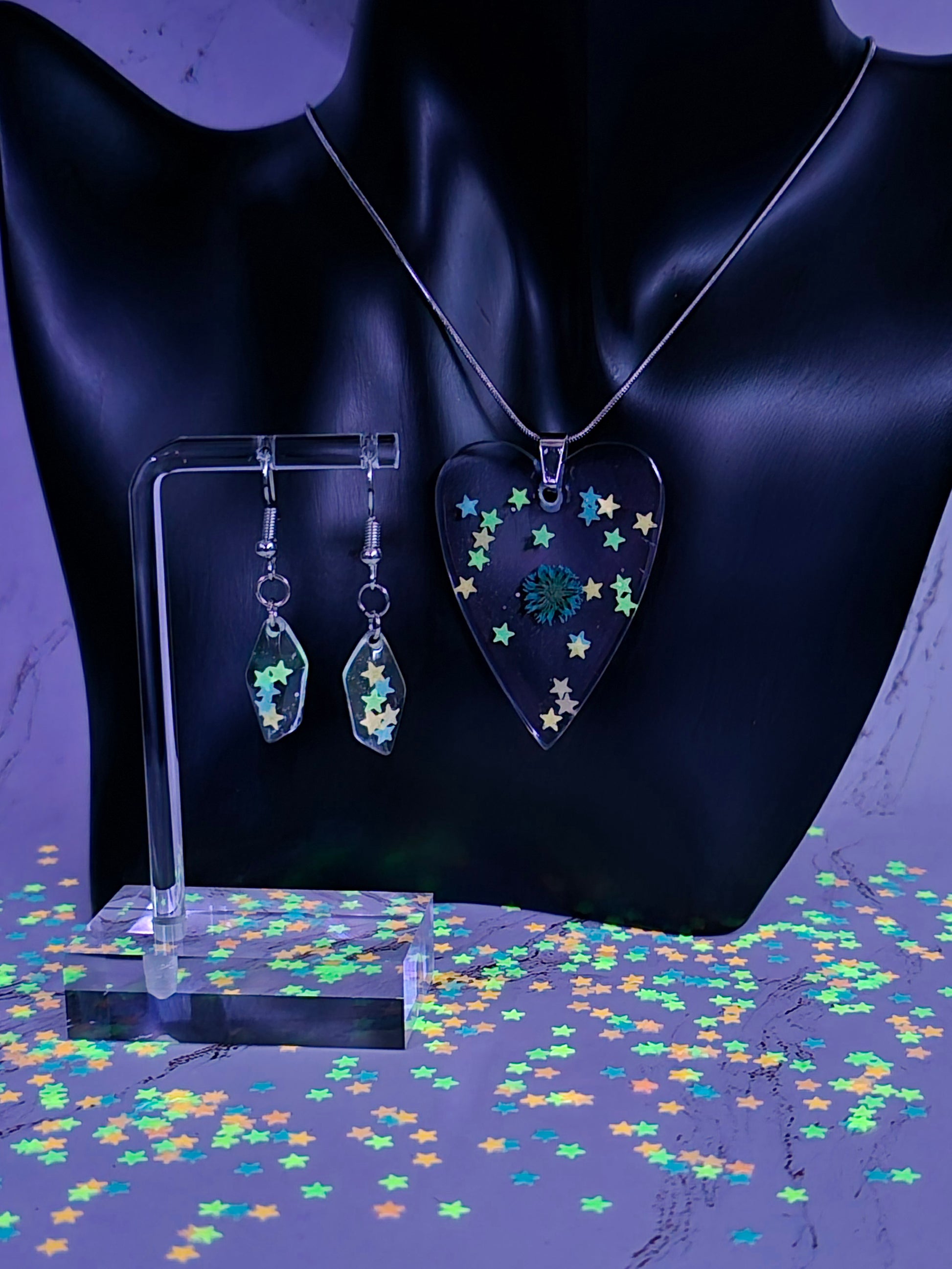 Introducing our Fun Glow-in-the-Dark Set! Perfect for Halloween, this necklace and earring set features a stainless-steel snake chain with a heart-shaped resin charm containing a blueish dried flower and colorful glow in the dark stars. The corky-shaped resin earrings also include glow in the dark stars and are made with stainless steel hooks and jump rings. Shine in the dark with this unique, playful set. The heart shaped resin pendant necklace is 47cm long, with a drop length of 25cm (including resin pendant). The heart shaped resin pendent is 5.5cm long by 4cm wide (at the widest point of pendant).The earrings in this set are 3.5cm long, with a drop length of 2.5cm. The earrings pendants are 2cm long by 1cm wide (at the widest point of pendant).