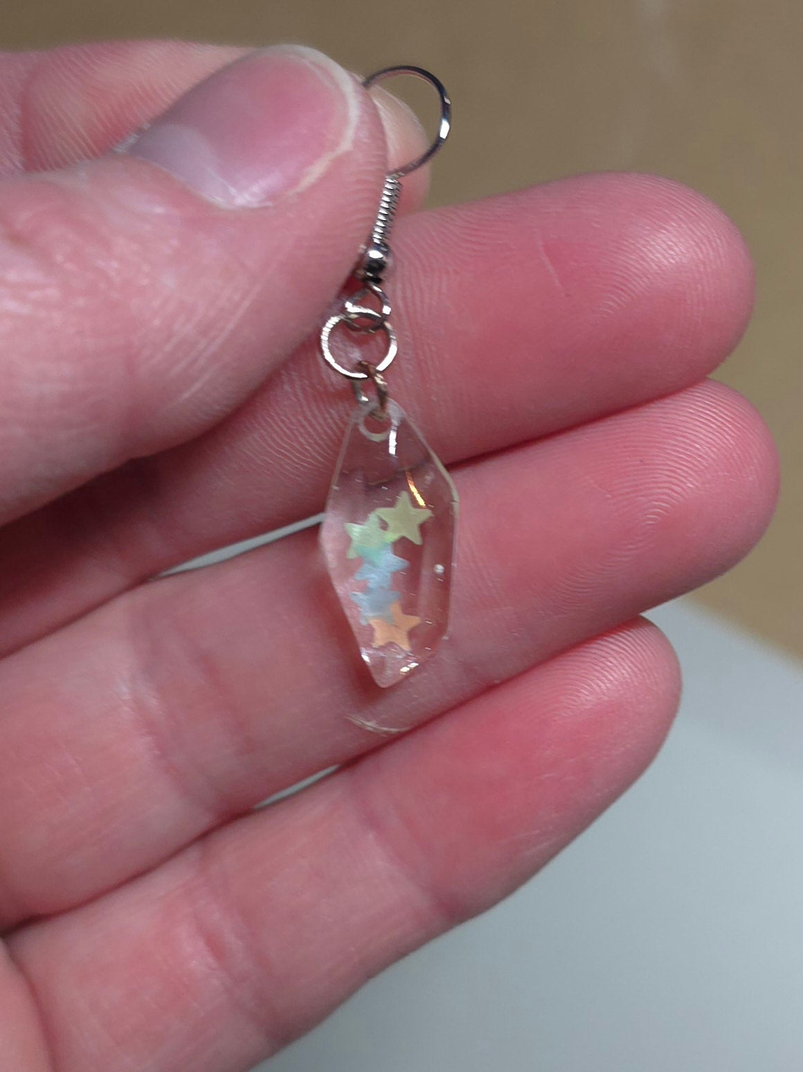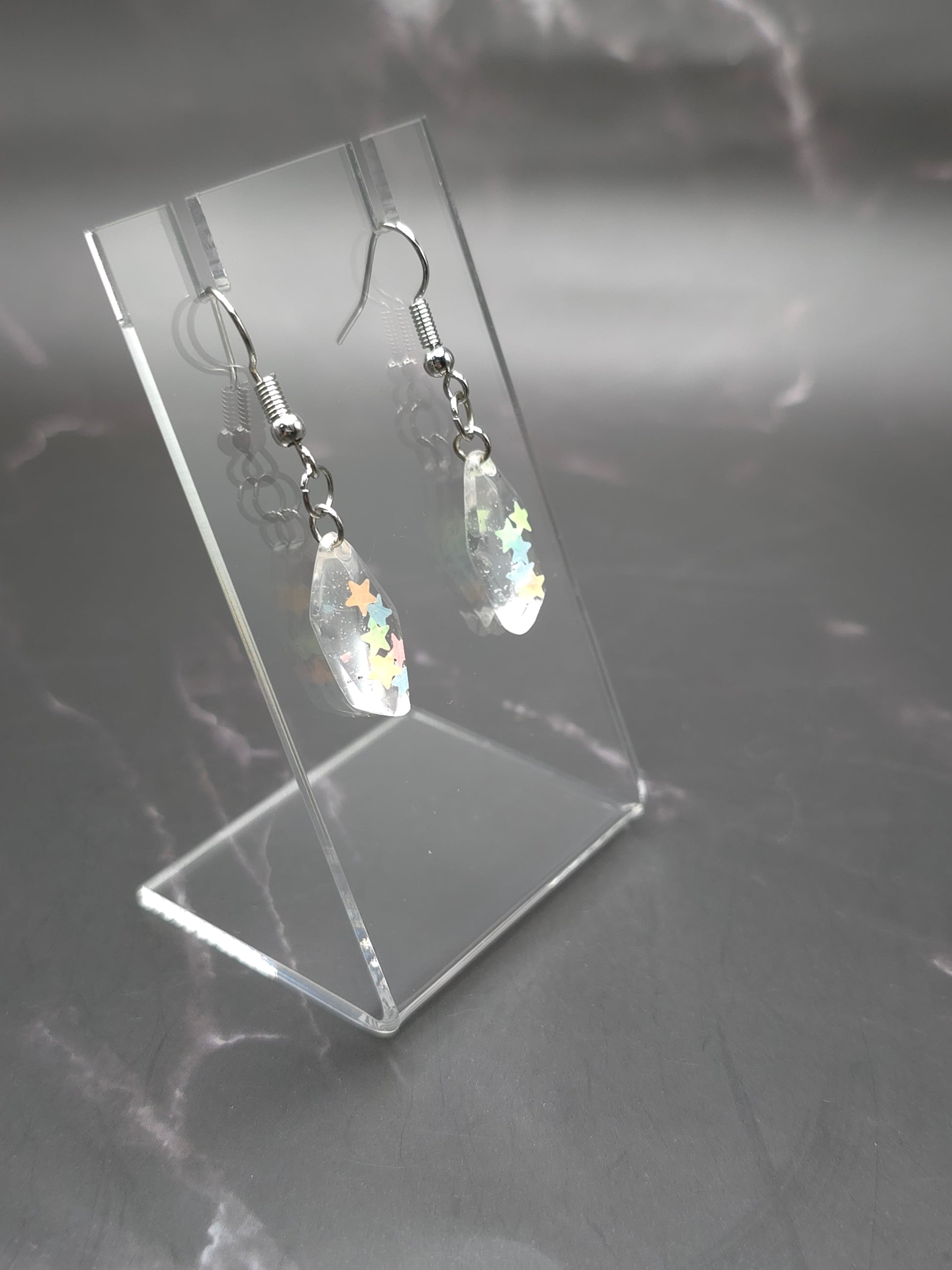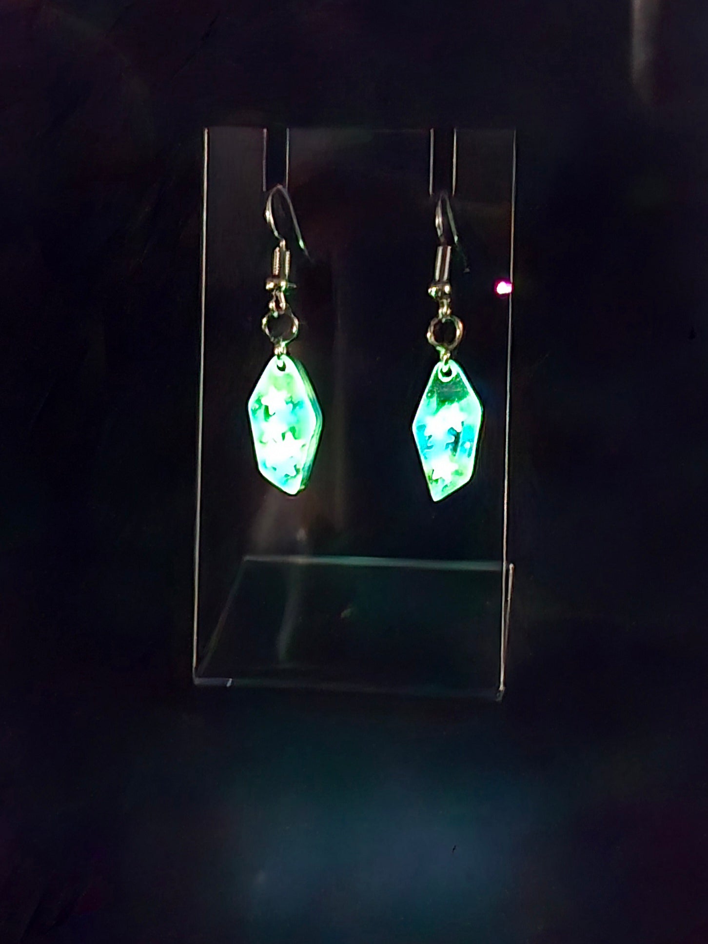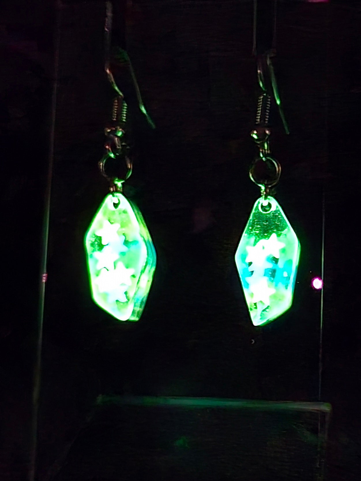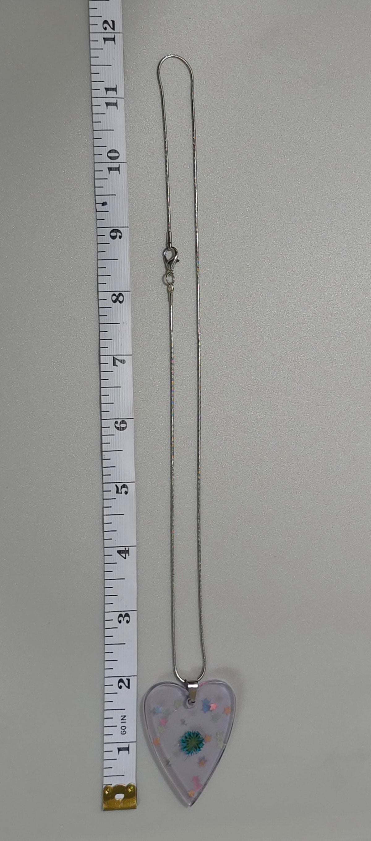 Introducing our Fun Glow-in-the-Dark Set! Perfect for Halloween, this necklace and earring set features a stainless-steel snake chain with a heart-shaped resin charm containing a blueish dried flower and colorful glow in the dark stars. The corky-shaped resin earrings also include glow in the dark stars and are made with stainless steel hooks and jump rings. Shine in the dark with this unique, playful set. The heart shaped resin pendant necklace is 47cm long, with a drop length of 25cm (including resin pendant). The heart shaped resin pendent is 5.5cm long by 4cm wide (at the widest point of pendant).The earrings in this set are 3.5cm long, with a drop length of 2.5cm. The earrings pendants are 2cm long by 1cm wide (at the widest point of pendant).