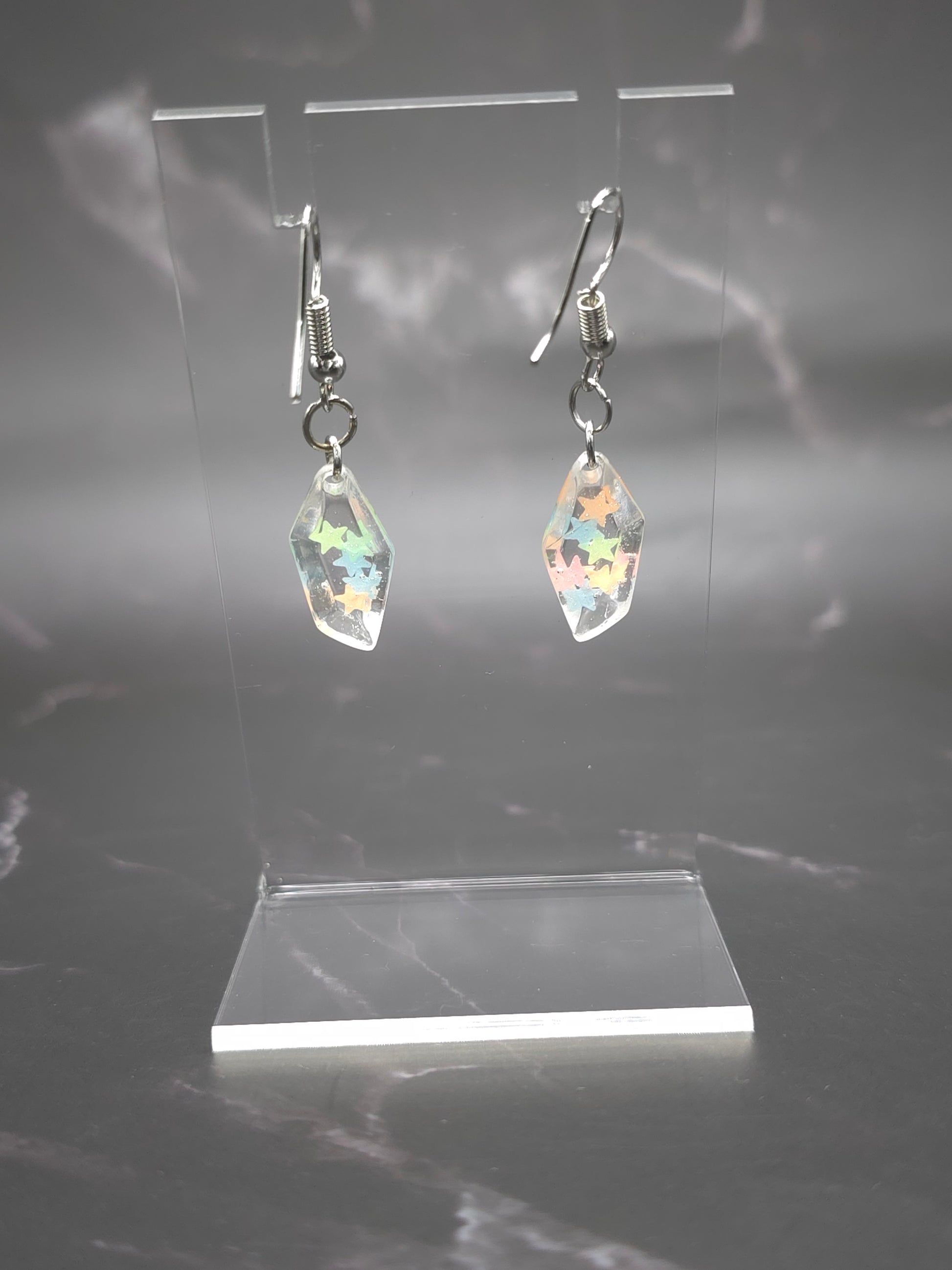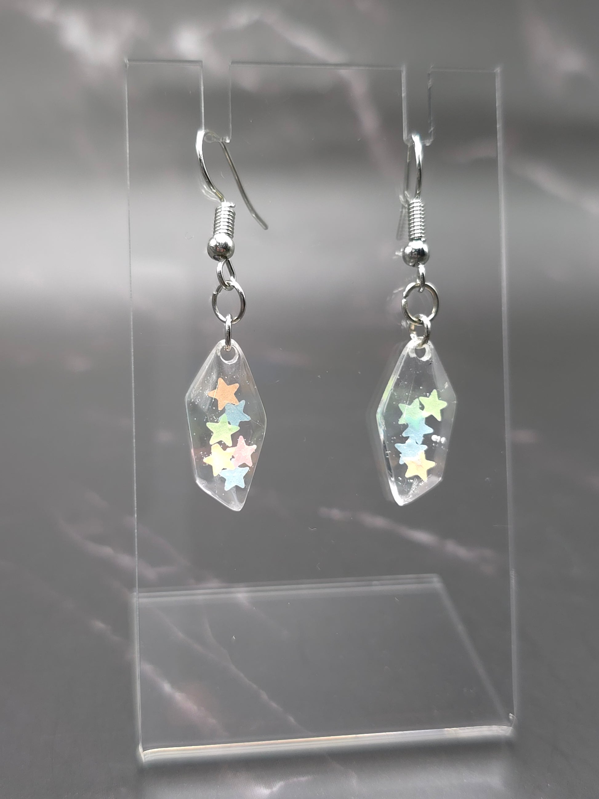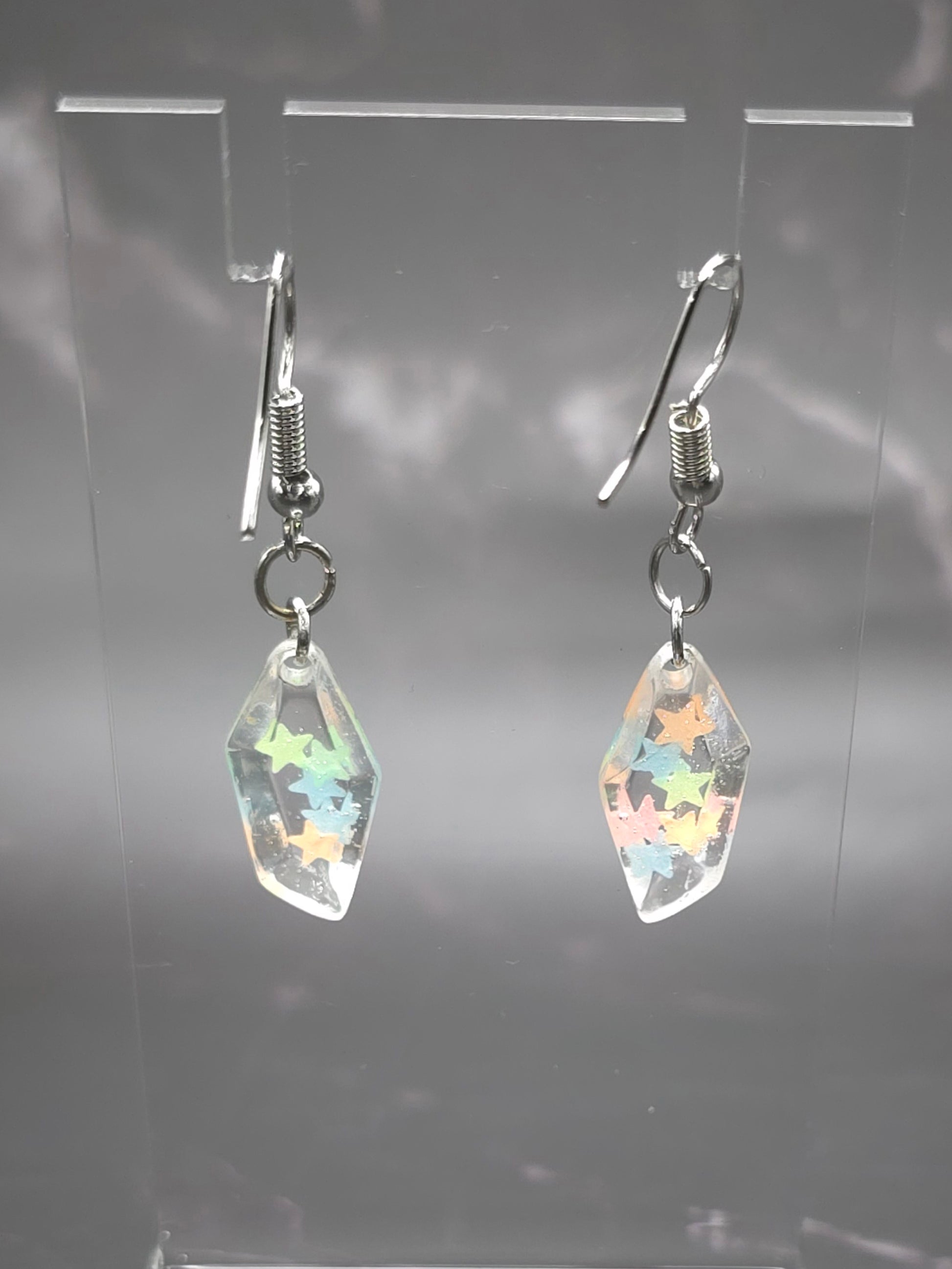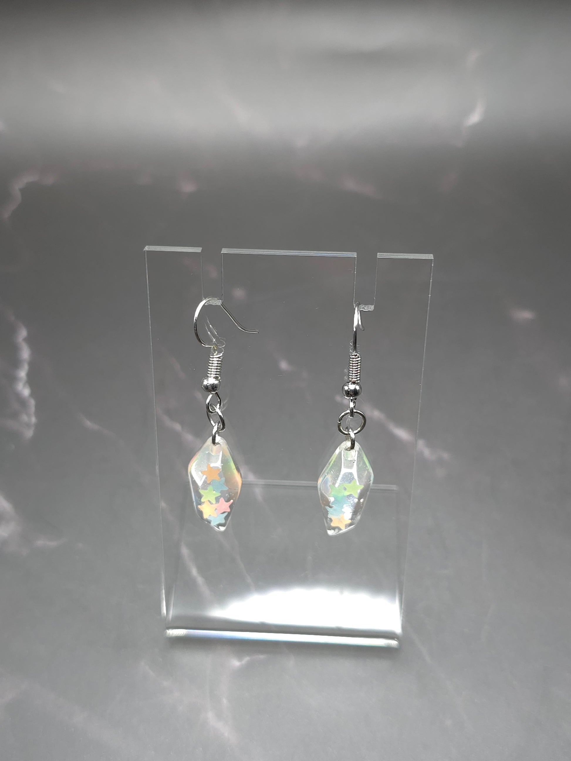 Introducing our Fun Glow-in-the-Dark Set! Perfect for Halloween, this necklace and earring set features a stainless-steel snake chain with a heart-shaped resin charm containing a blueish dried flower and colorful glow in the dark stars. The corky-shaped resin earrings also include glow in the dark stars and are made with stainless steel hooks and jump rings. Shine in the dark with this unique, playful set. The heart shaped resin pendant necklace is 47cm long, with a drop length of 25cm (including resin pendant). The heart shaped resin pendent is 5.5cm long by 4cm wide (at the widest point of pendant).The earrings in this set are 3.5cm long, with a drop length of 2.5cm. The earrings pendants are 2cm long by 1cm wide (at the widest point of pendant).