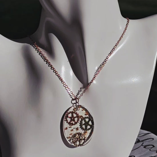 The Gears Up Resin Necklace is a steam punk's dream accessory. The unique oval charm encases 3 gears in clear resin, creating a stunning visual effect. The hypoallergenic, rose gold colored chain adds a touch of elegance. Experience this beautiful blend of technology and style.
