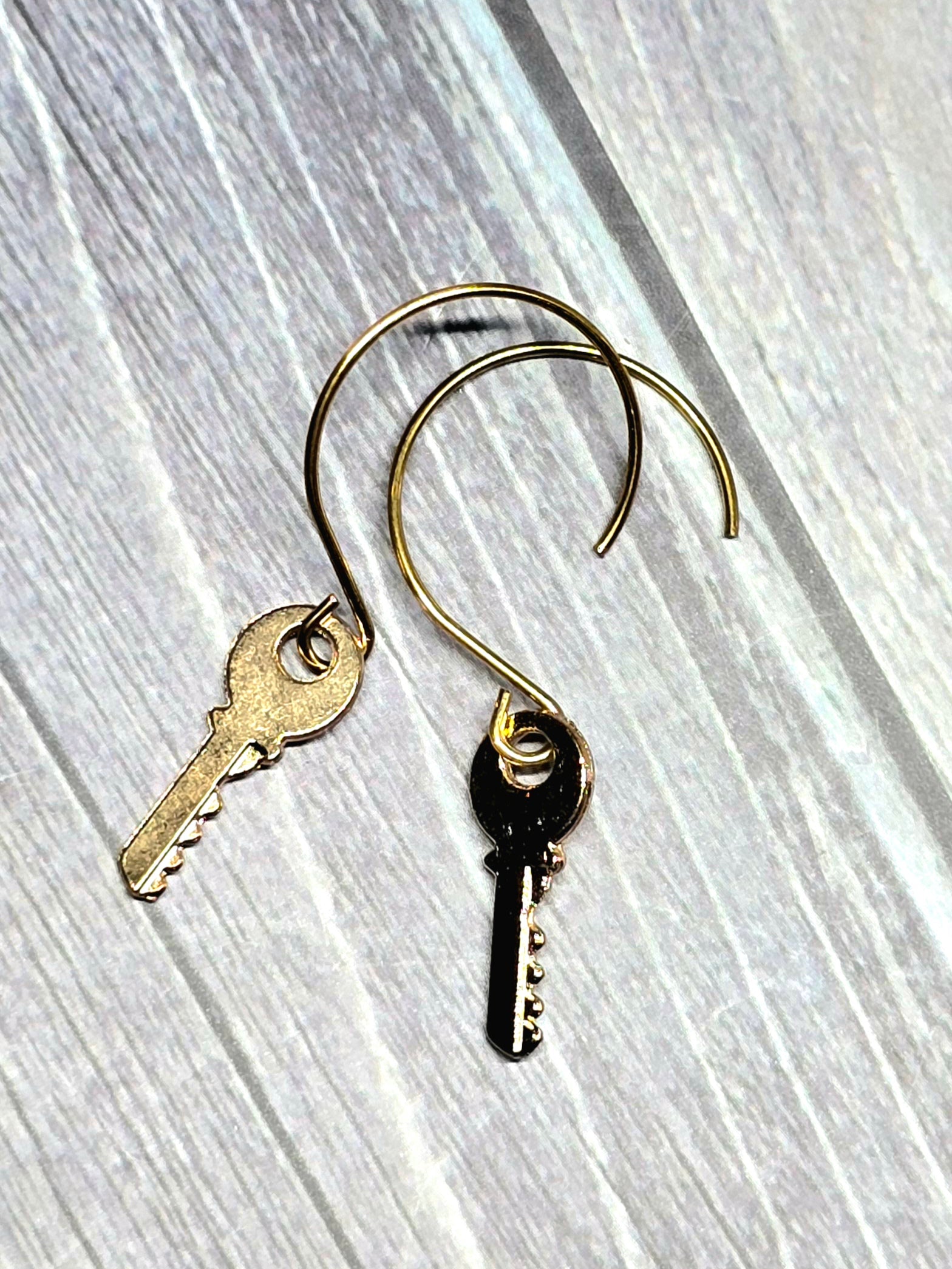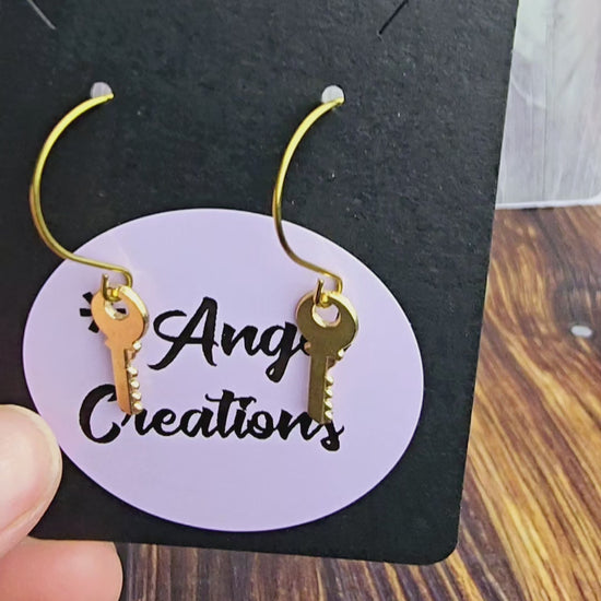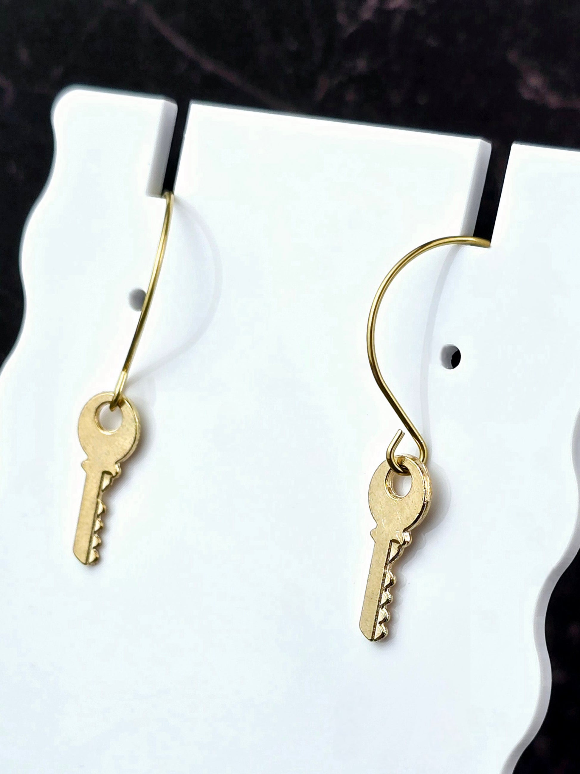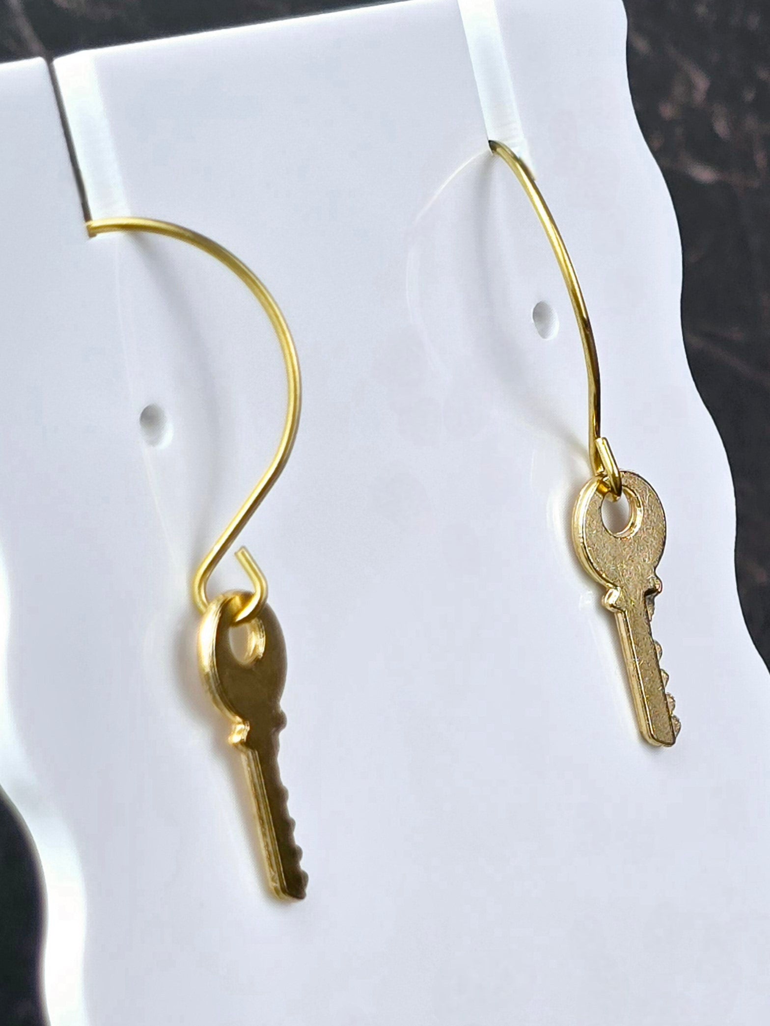 Show your elegance with these stunning gold stainless steel wire hoop earrings. The hoops measure 2.5mm in diameter and feature a secure .10mm ear pin for comfortable wear. Dangling from the hoops are charming metal alloy gold key charms, adding a unique and stylish element to the design. These earrings have a total length of 4cm, with a drop length of 2cm and a width of 0.5cm, making them the perfect accessory for any occasion. Elevate your look with these chic and versatile earrings that are sure to make a statement.