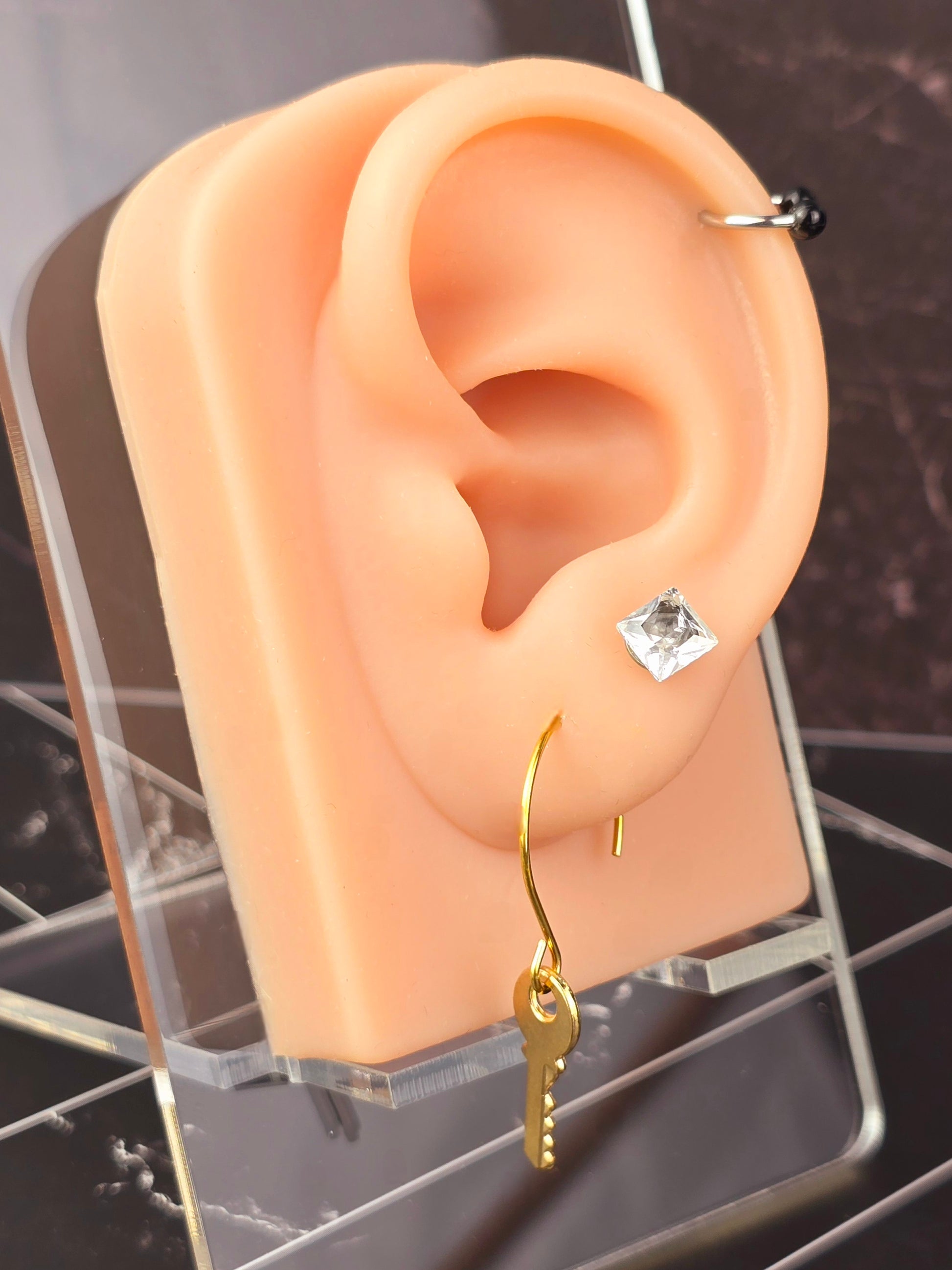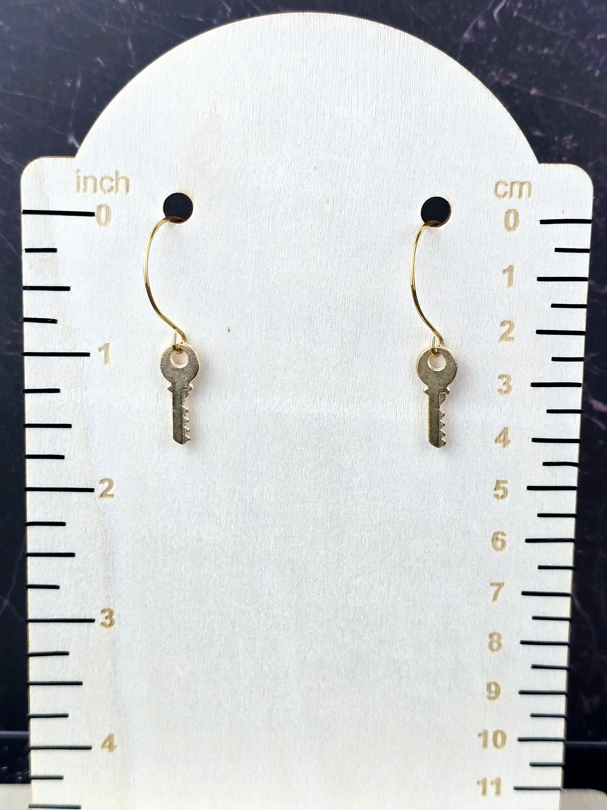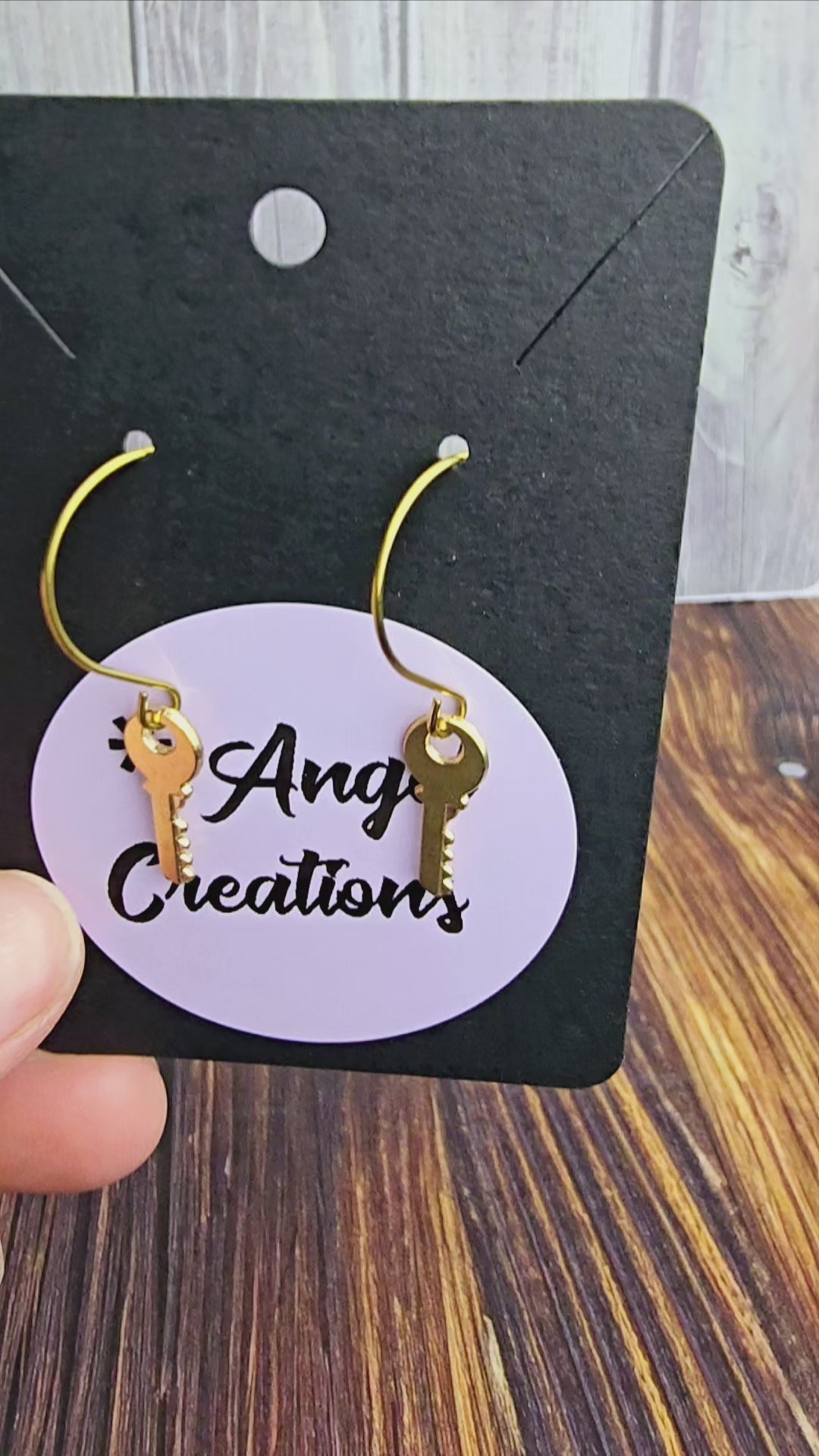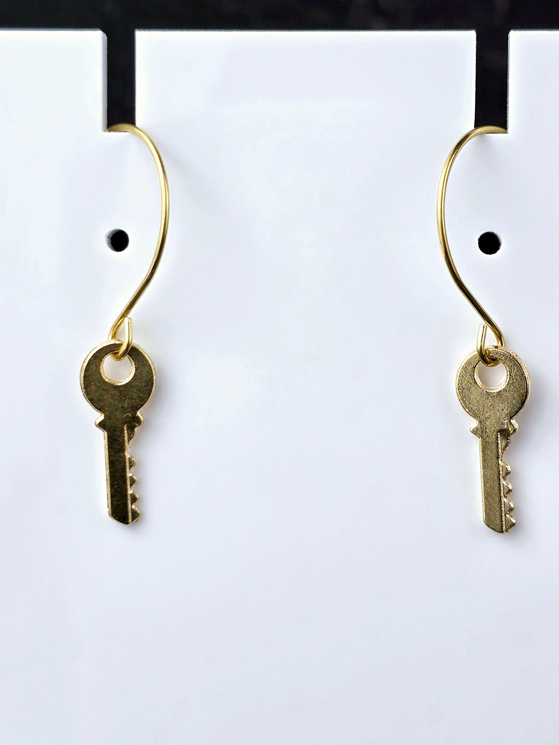 Show your elegance with these stunning gold stainless steel wire hoop earrings. The hoops measure 2.5mm in diameter and feature a secure .10mm ear pin for comfortable wear. Dangling from the hoops are charming metal alloy gold key charms, adding a unique and stylish element to the design. These earrings have a total length of 4cm, with a drop length of 2cm and a width of 0.5cm, making them the perfect accessory for any occasion. Elevate your look with these chic and versatile earrings that are sure to make a statement.