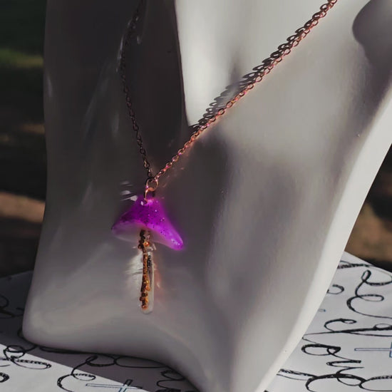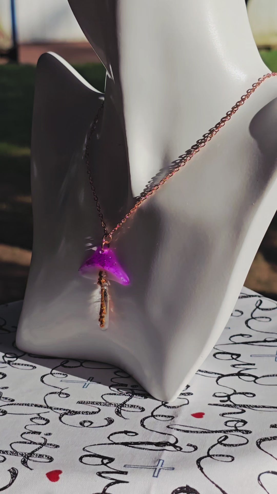 Enhance your outfit with our Purple Cap Resin Necklace. The purple mushroom cap with stunning glitter creates a unique design, while the clear resin stem with gold flakes adds a touch of elegance. The rose gold colored necklace chain is hypoallergenic, making it safe and stylish to wear. This necklace is 46.5cm long, with a drop length of 27.5cm (including resin pendant). The resin pendant is 4.5cm long by 3cm wide (at widest point of pendant).