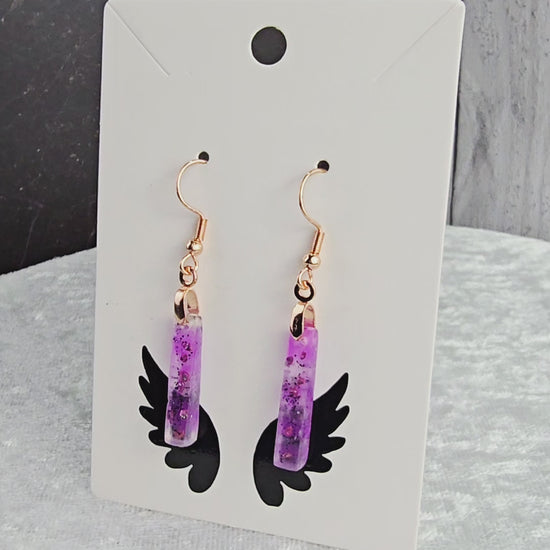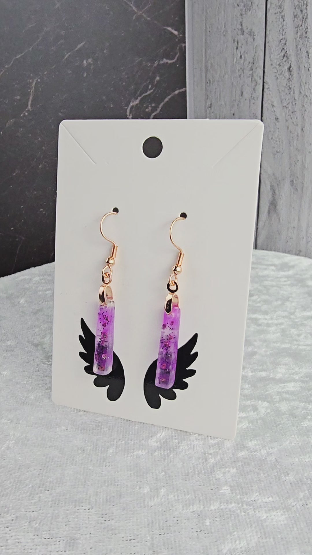 Add a touch of elegance and sophistication to your outfit with these stunning rose gold colored stainless steel earrings. The small elongated rectangle shape resin pendant features a beautiful combination of purple and white layered together with glitter, creating a unique and eye-catching design.
