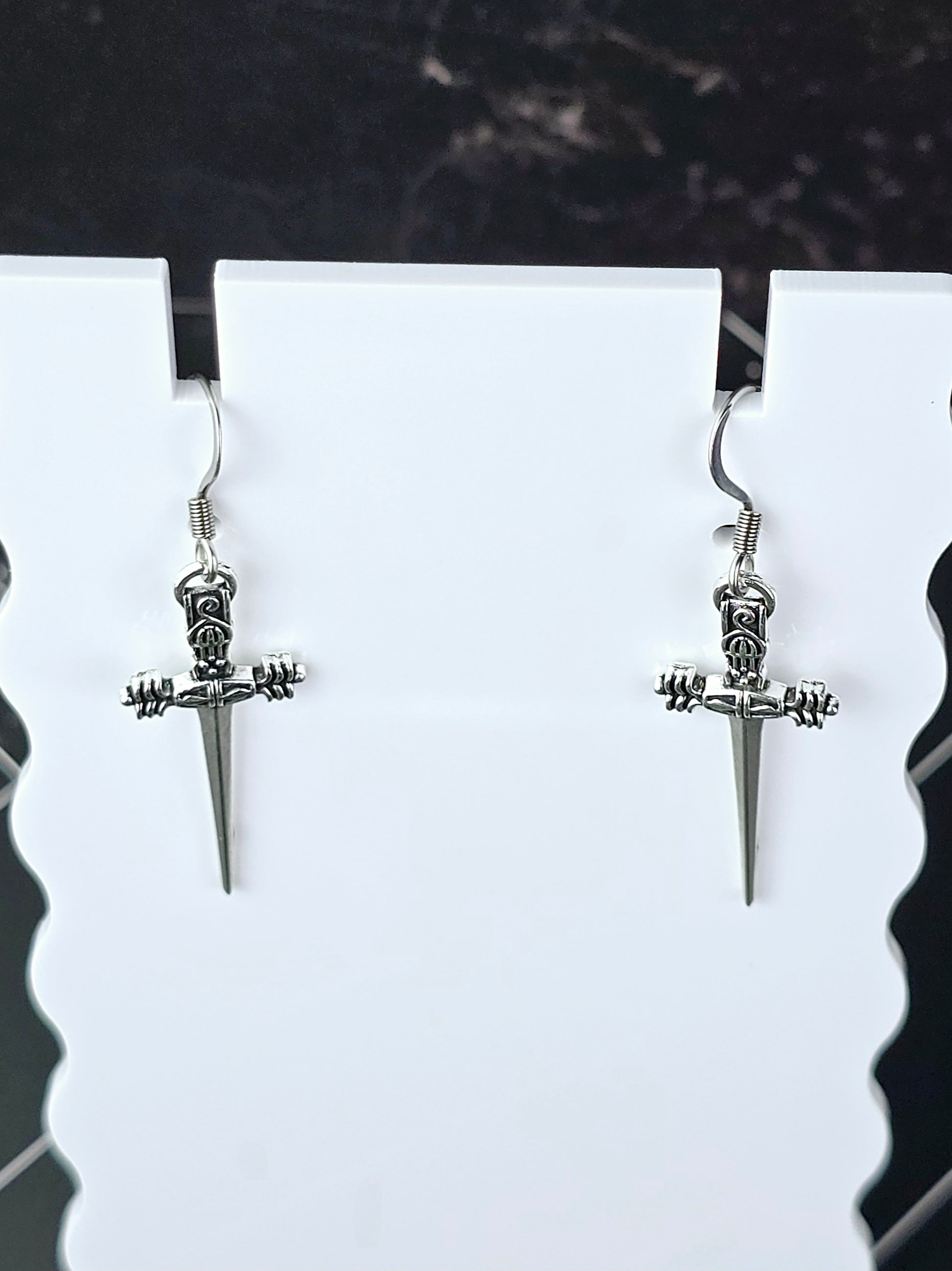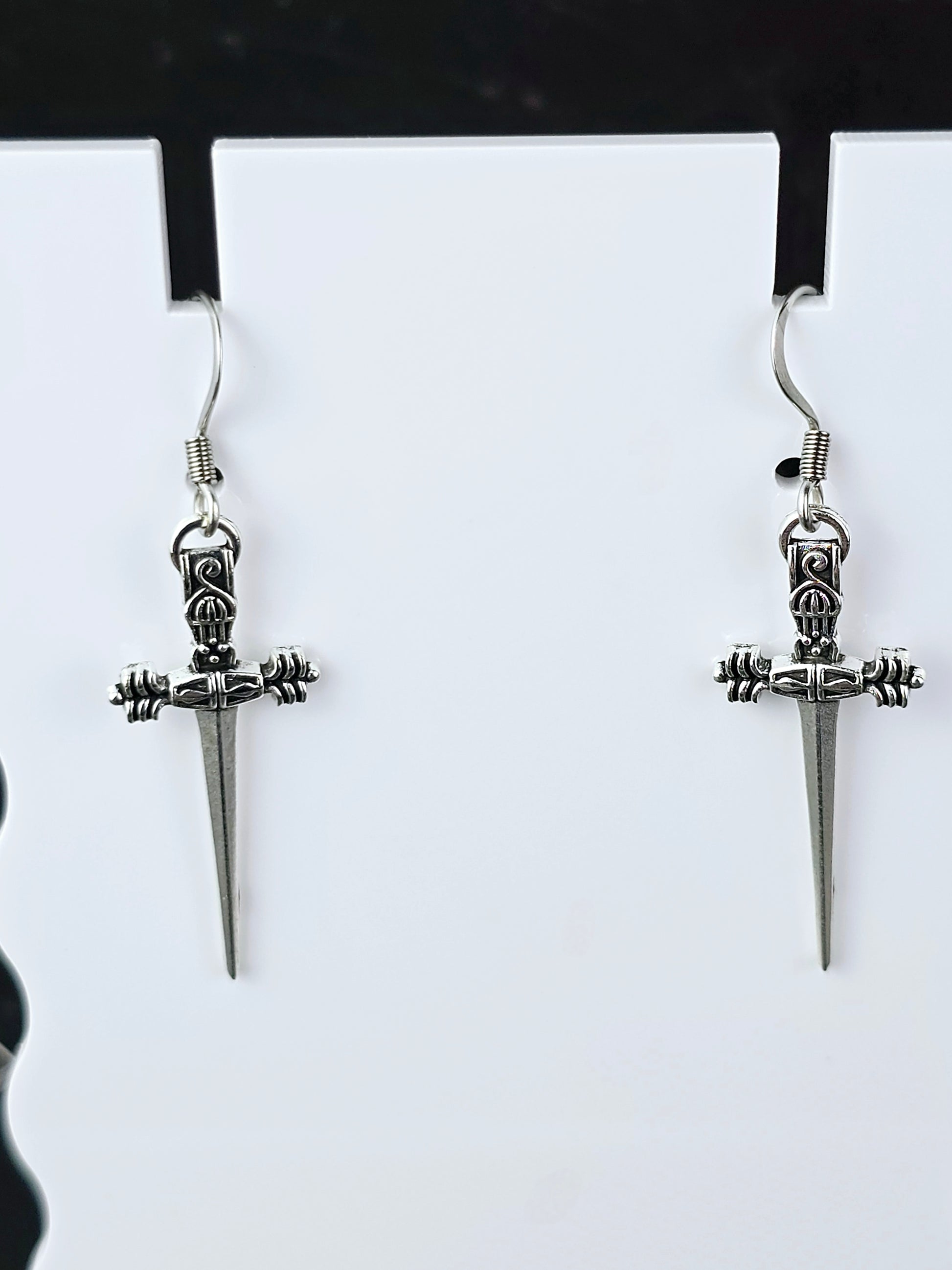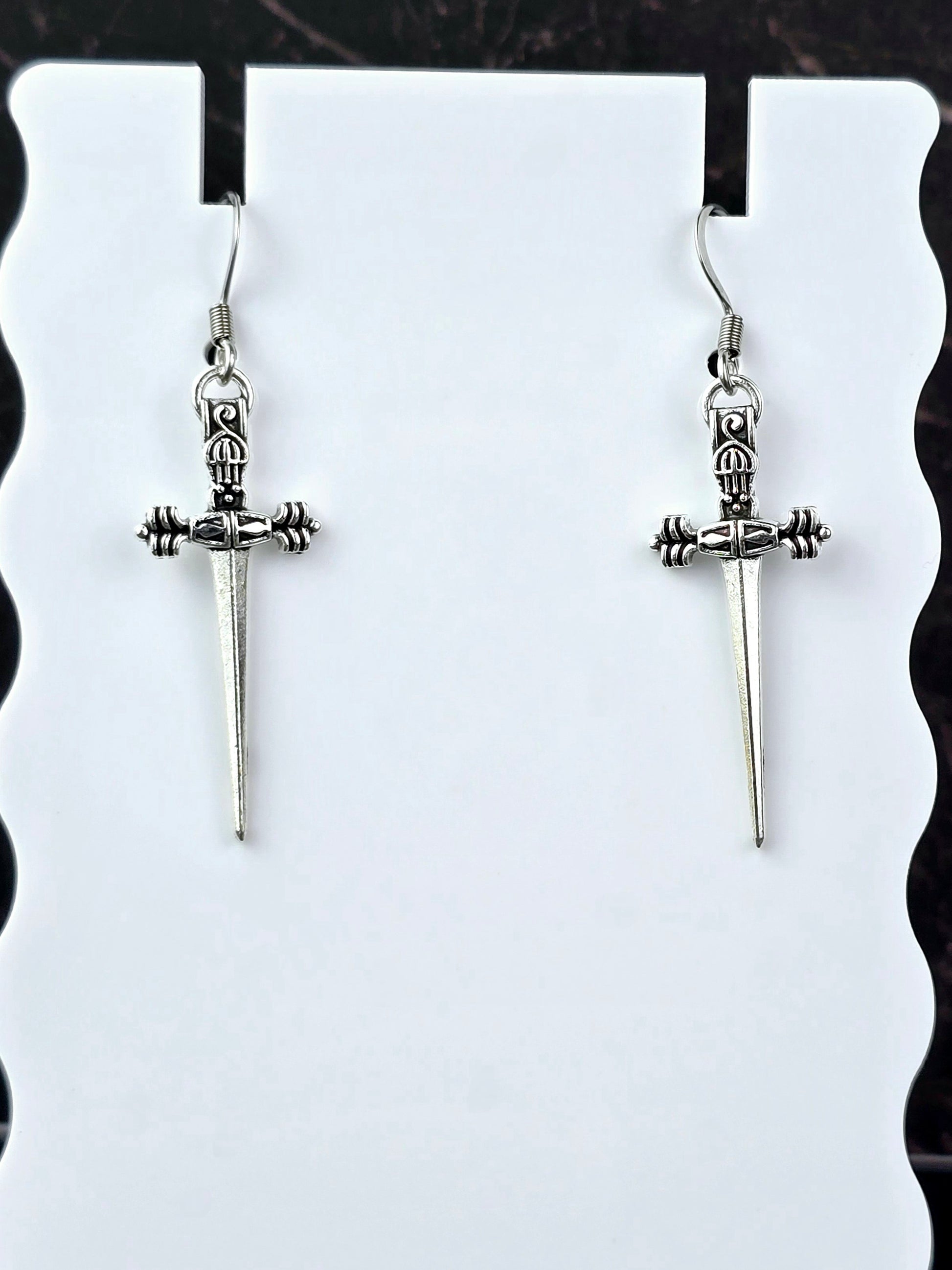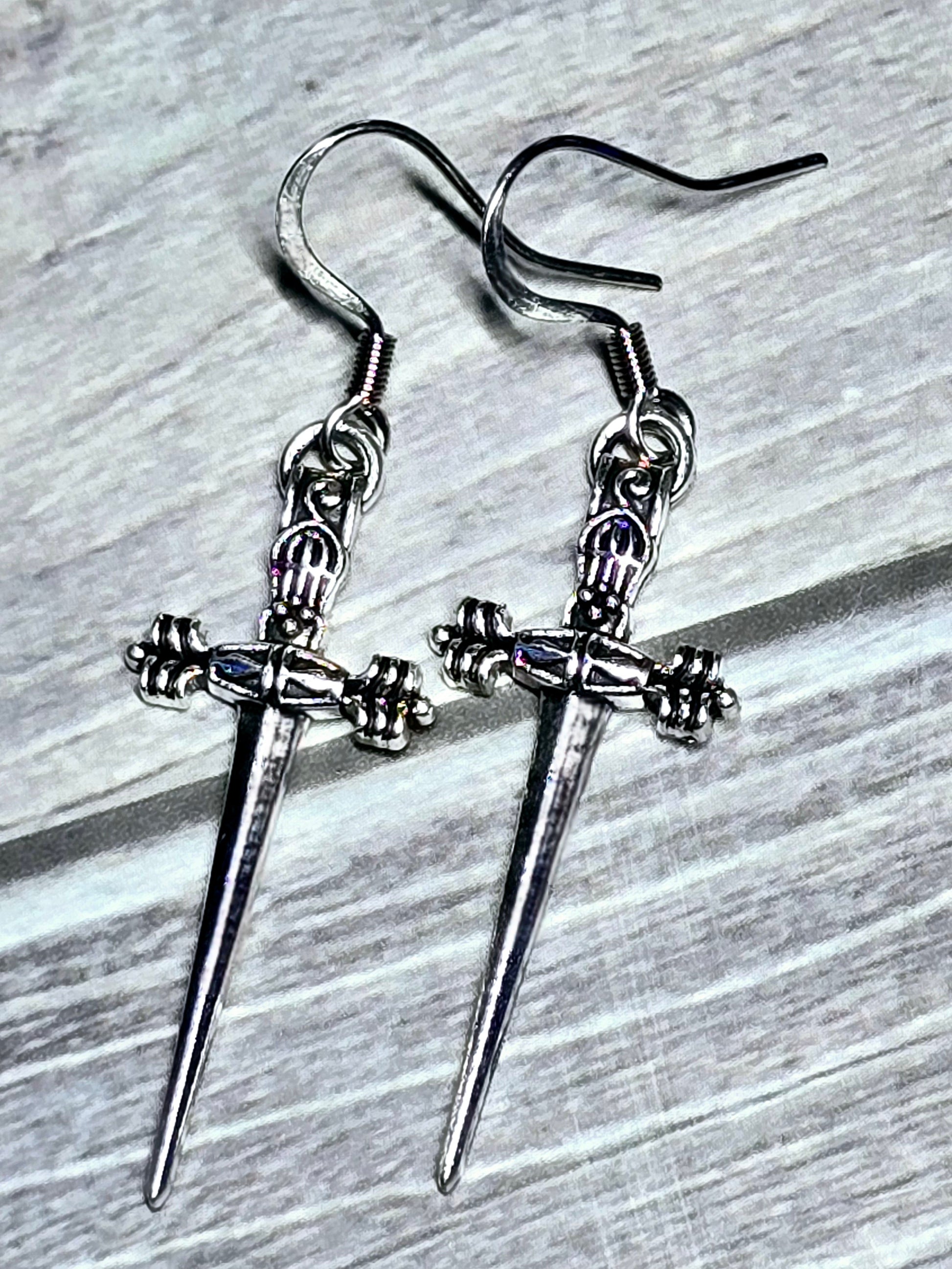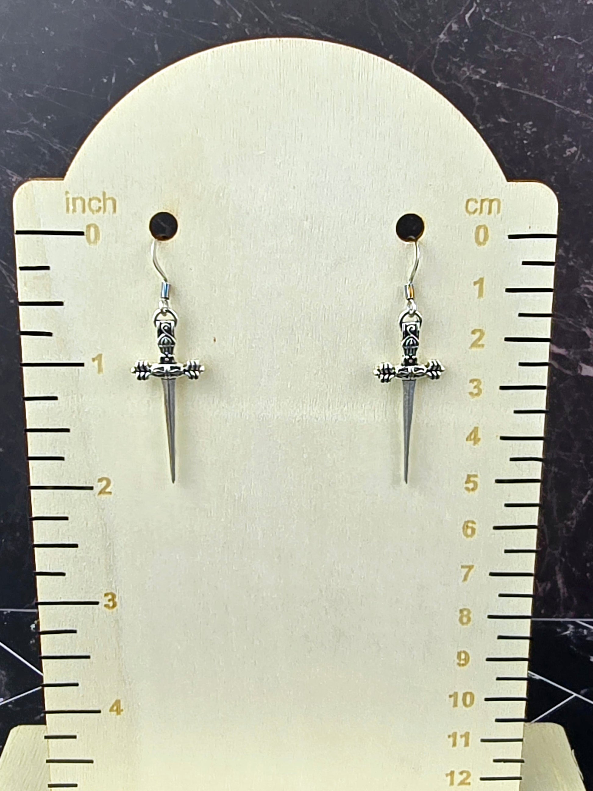 Add a touch of edgy style to your look with these unique silver stainless steel wire fishhook earrings featuring metal alloy knife charms. These earrings measure 4.75cm in length with a drop length of 3.5cm and are 1cm wide. Perfect for adding a bold statement to any outfit, these earrings are sure to turn heads.