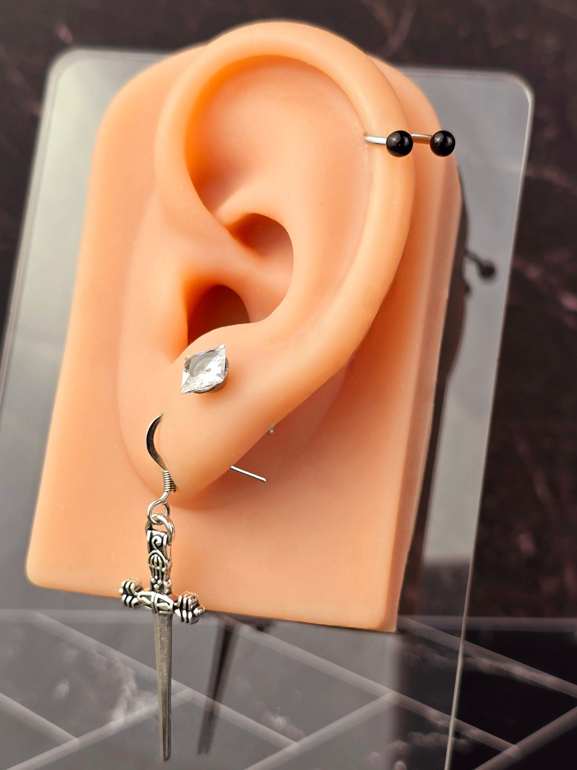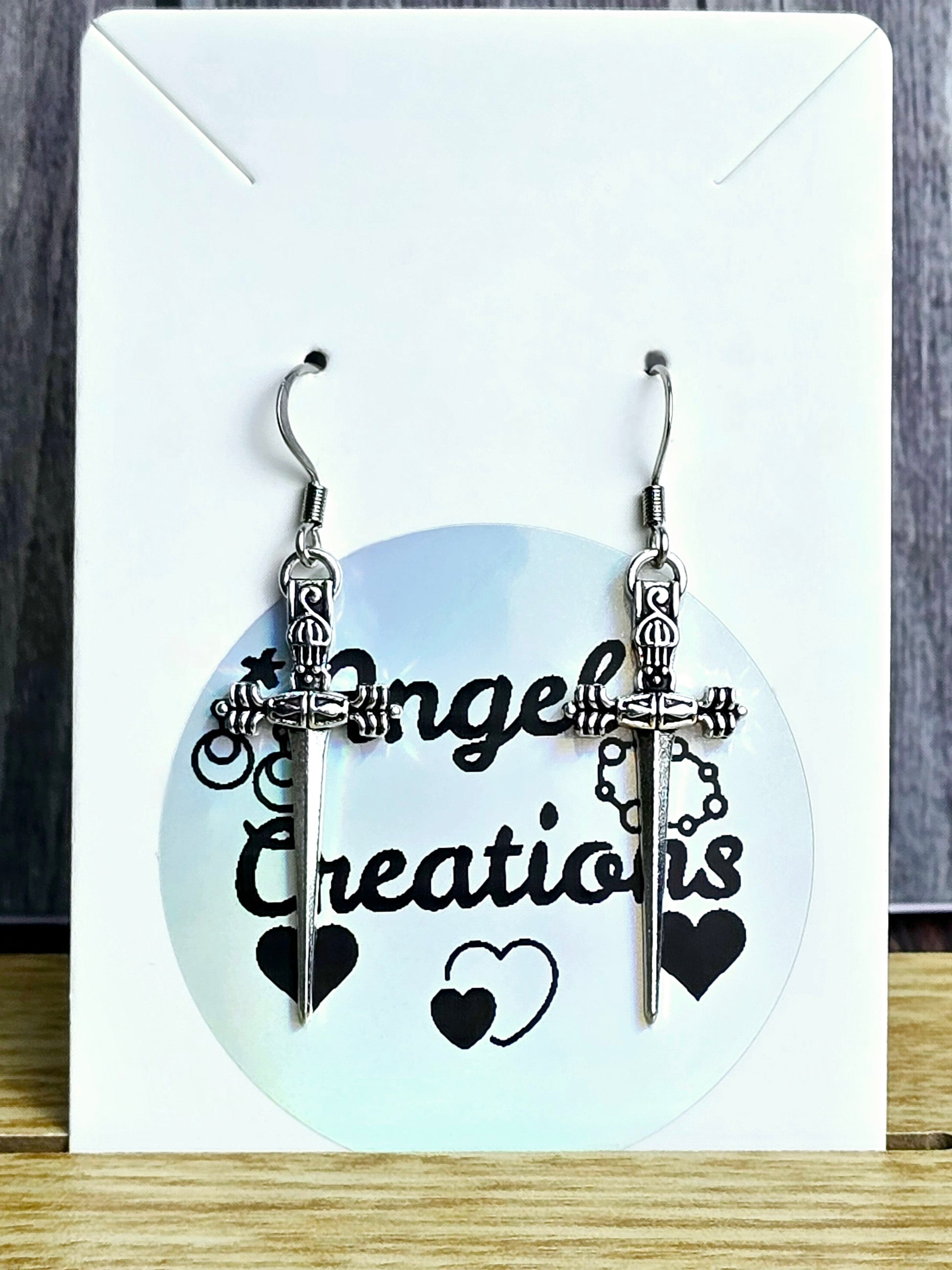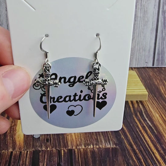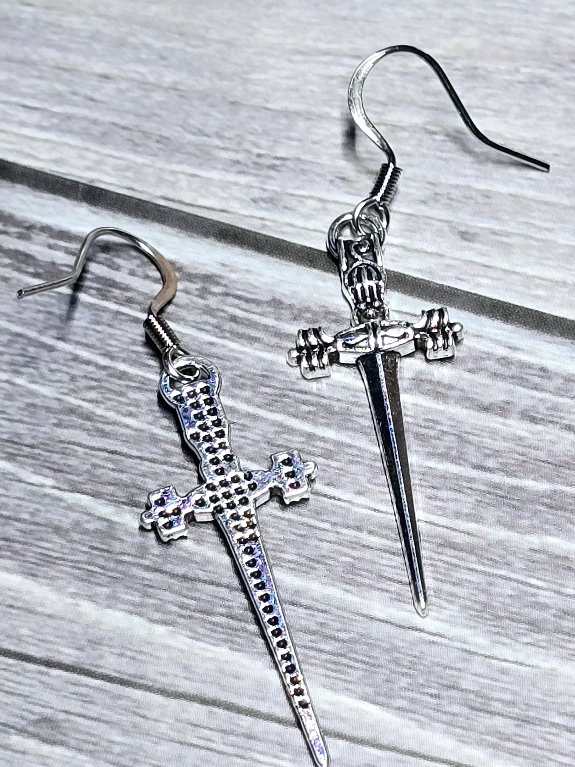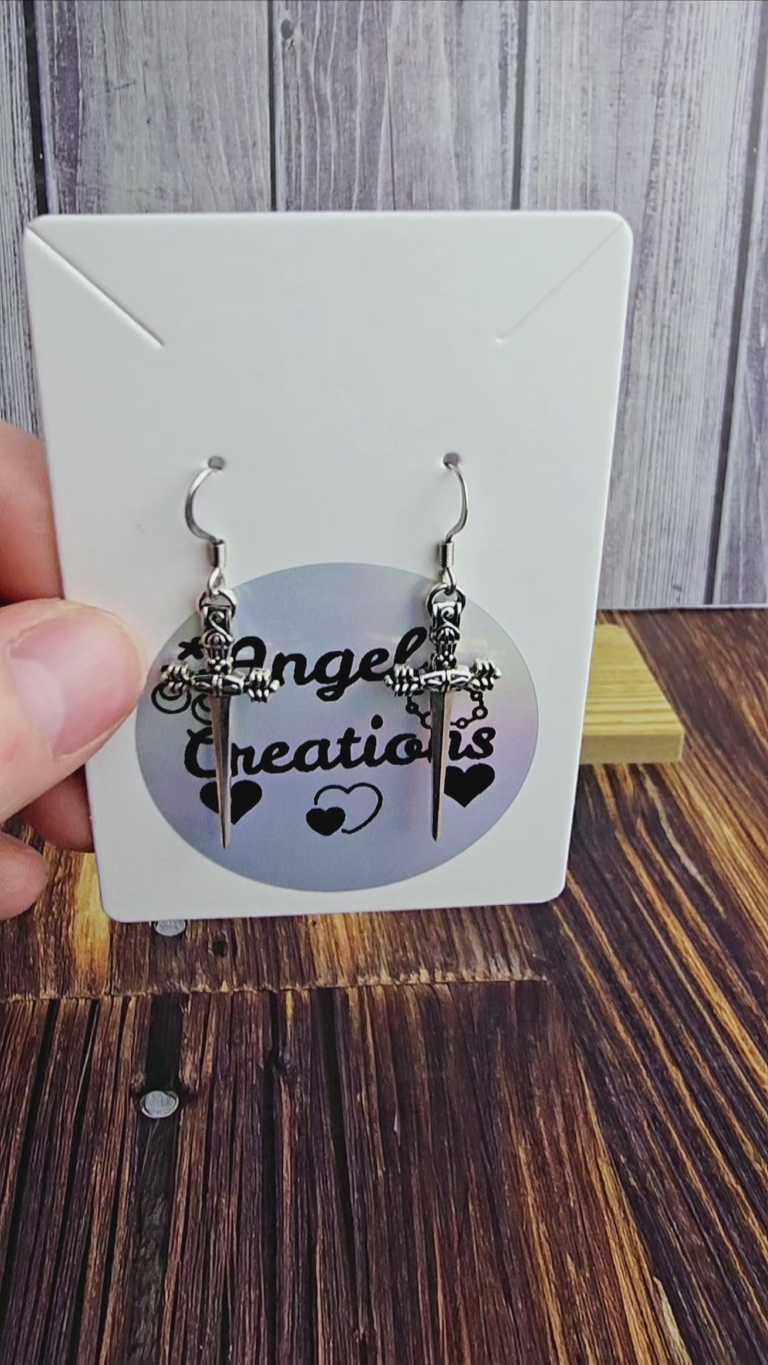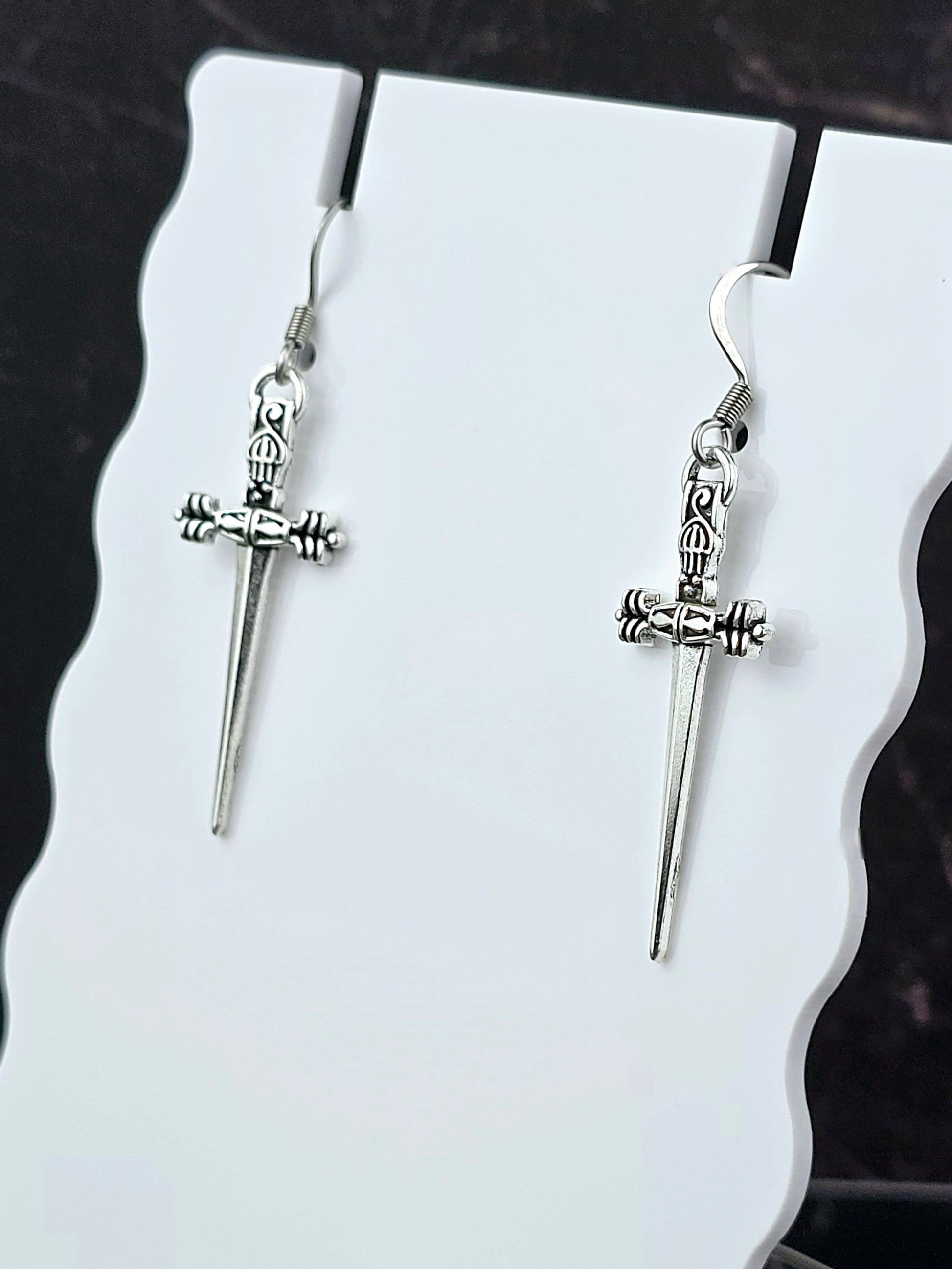 Add a touch of edgy style to your look with these unique silver stainless steel wire fishhook earrings featuring metal alloy knife charms. These earrings measure 4.75cm in length with a drop length of 3.5cm and are 1cm wide. Perfect for adding a bold statement to any outfit, these earrings are sure to turn heads.