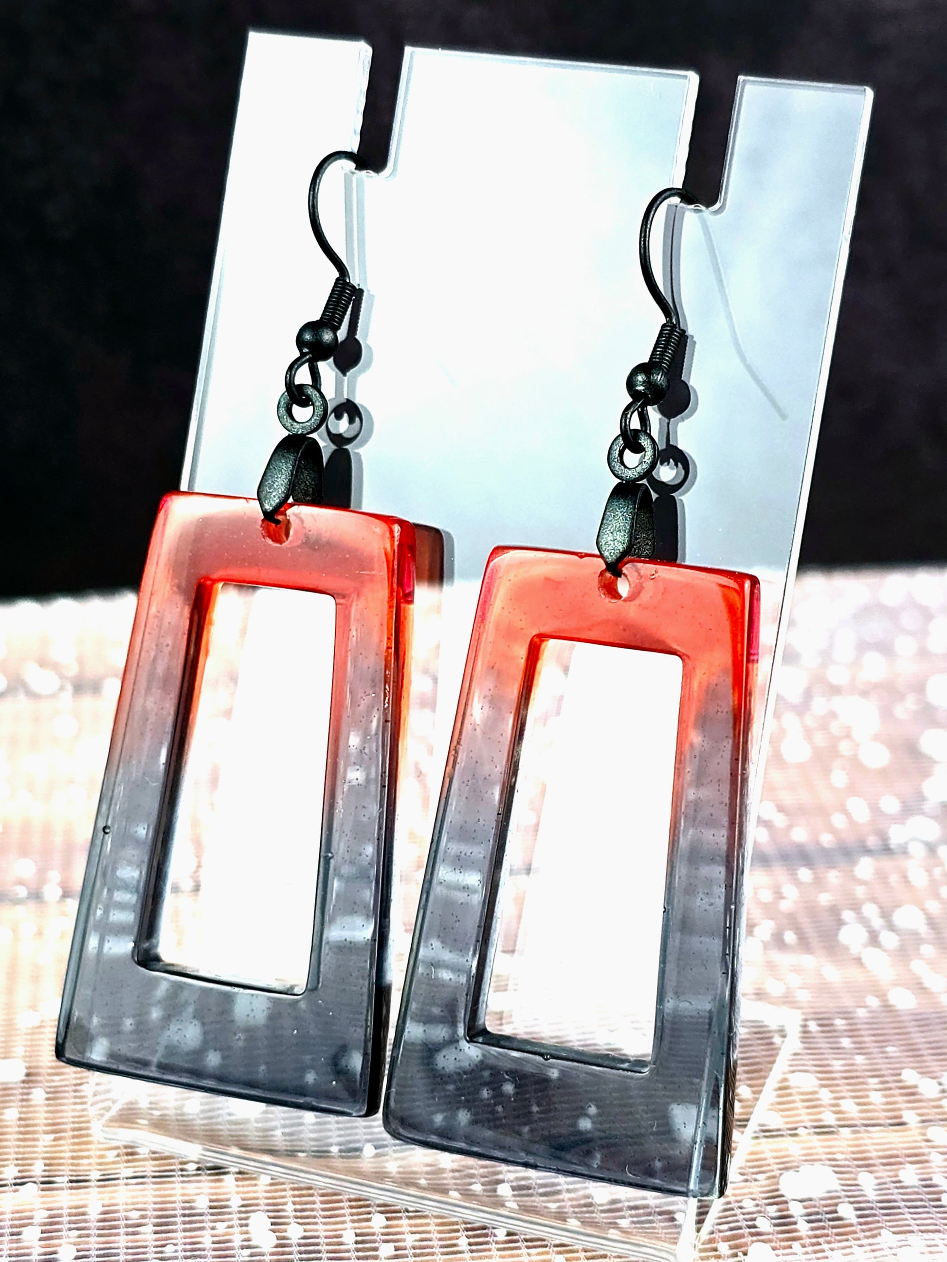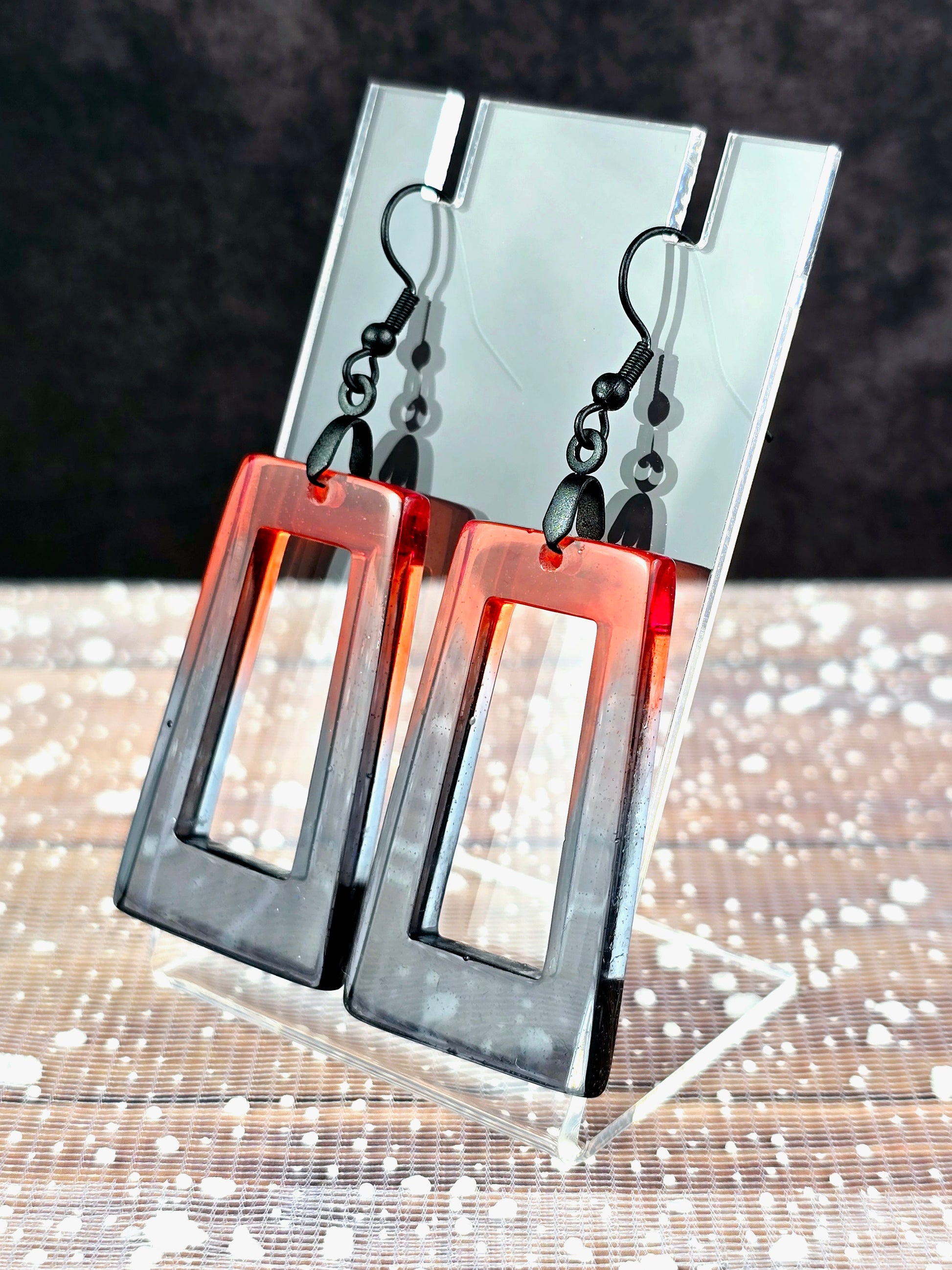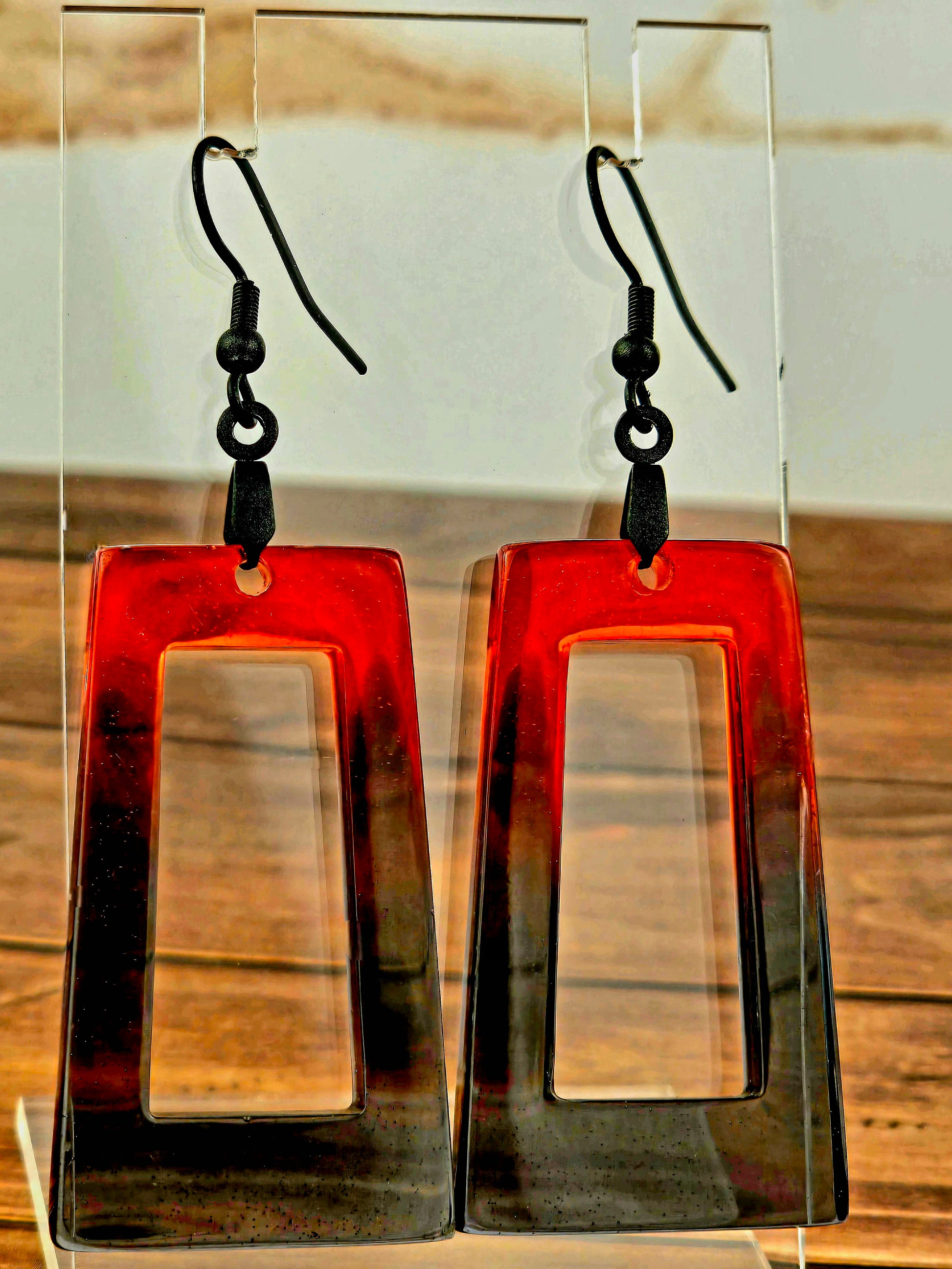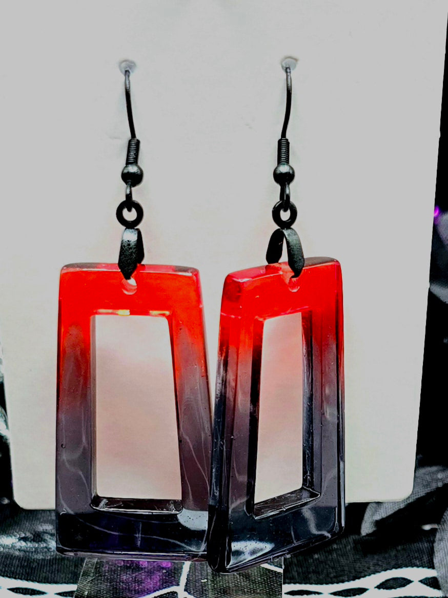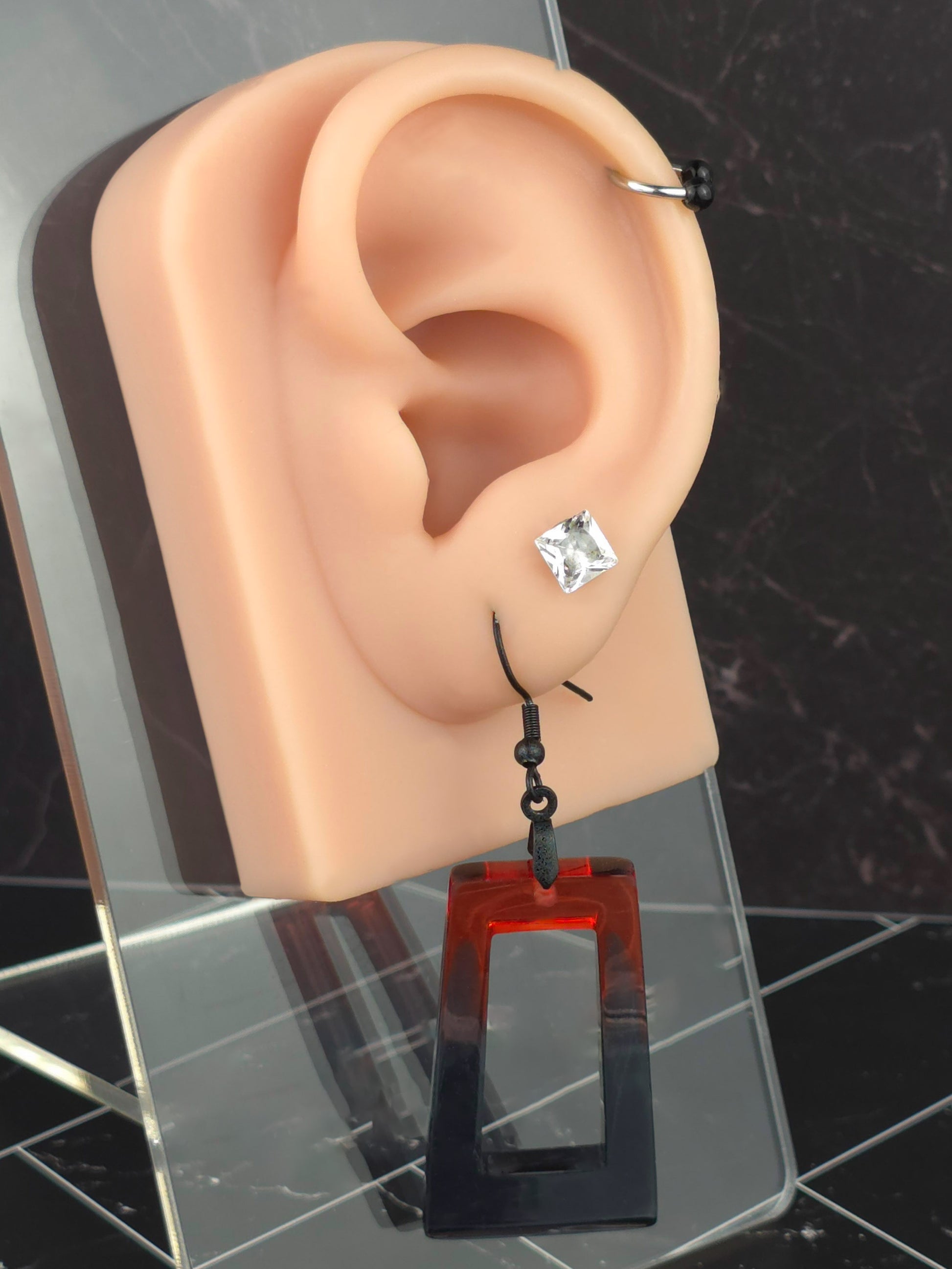 Add a bit of modern elegance to your outfit with these sleek black and red rectangular epoxy resin hoop pendants. The pendants are made of high-quality resin in a striking black and red color combination, creating a bold and eye-catching look. The earrings feature black stainless steel hook style earrings that are 7cm long with a drop length of 5.25cm. The pendant itself measures 4.25cm long by 2.5cm wide, making it the perfect statement piece for any occasion. Elevate your style with these unique and stylish earrings that are sure to turn heads wherever you go.