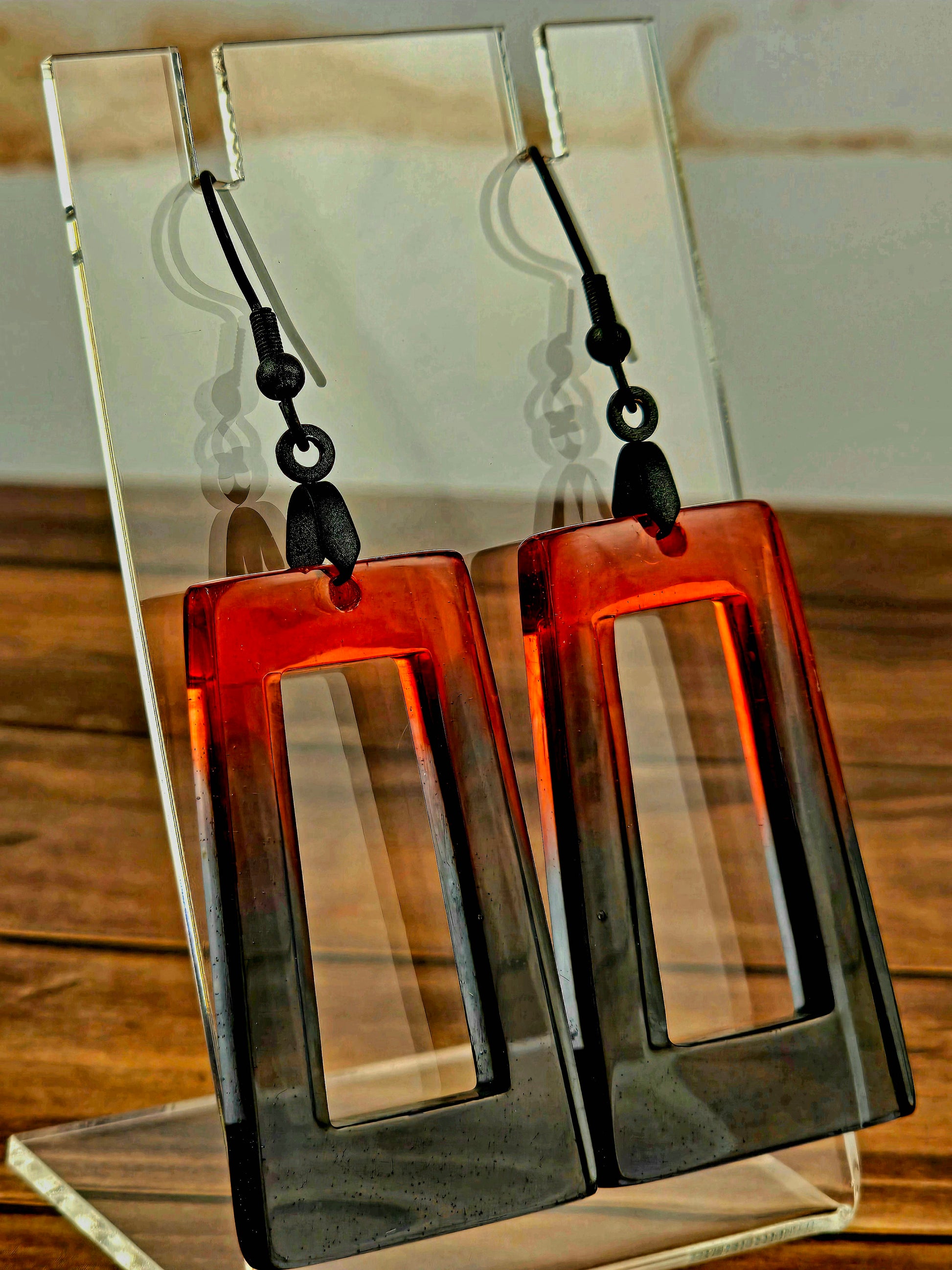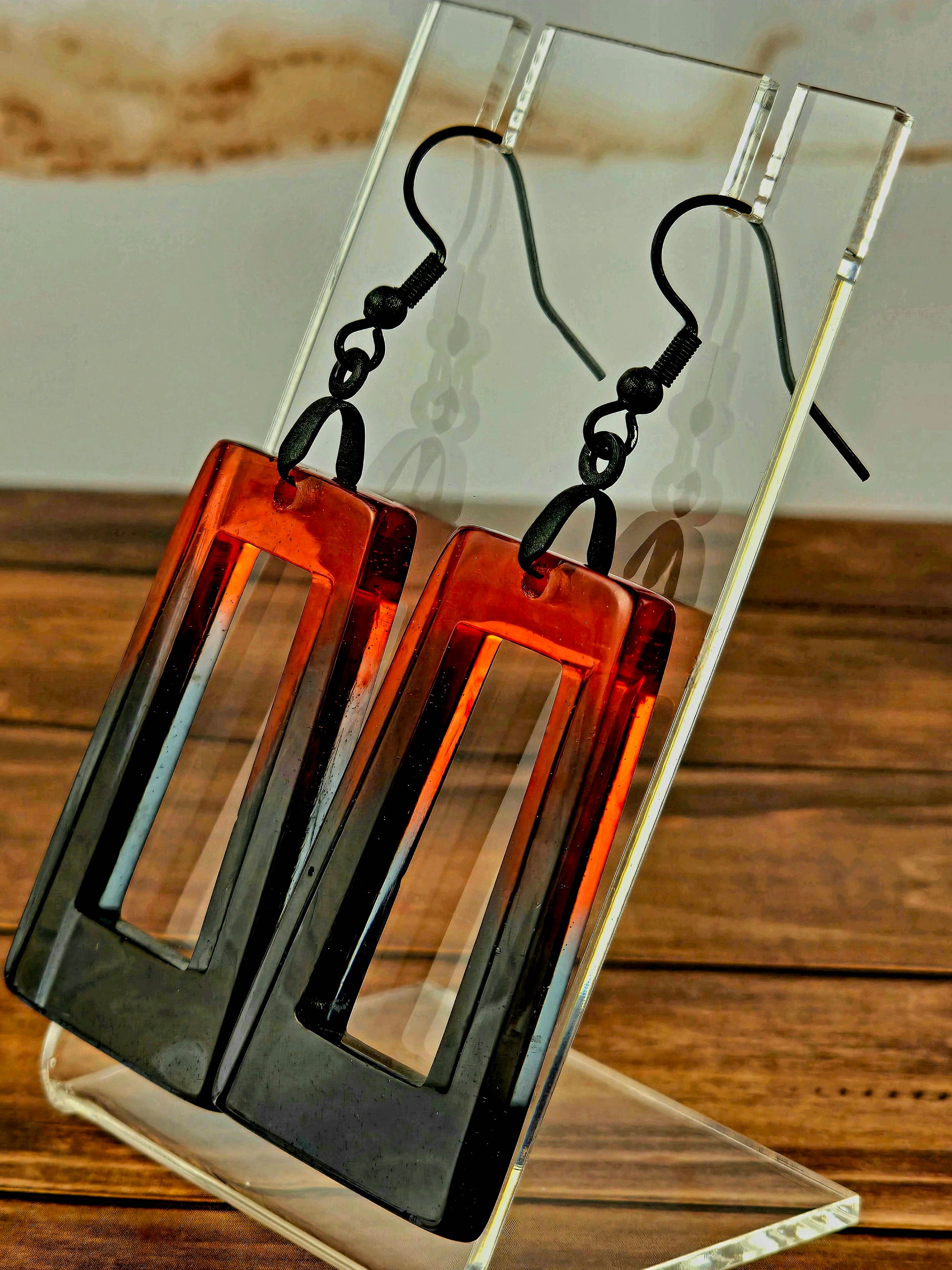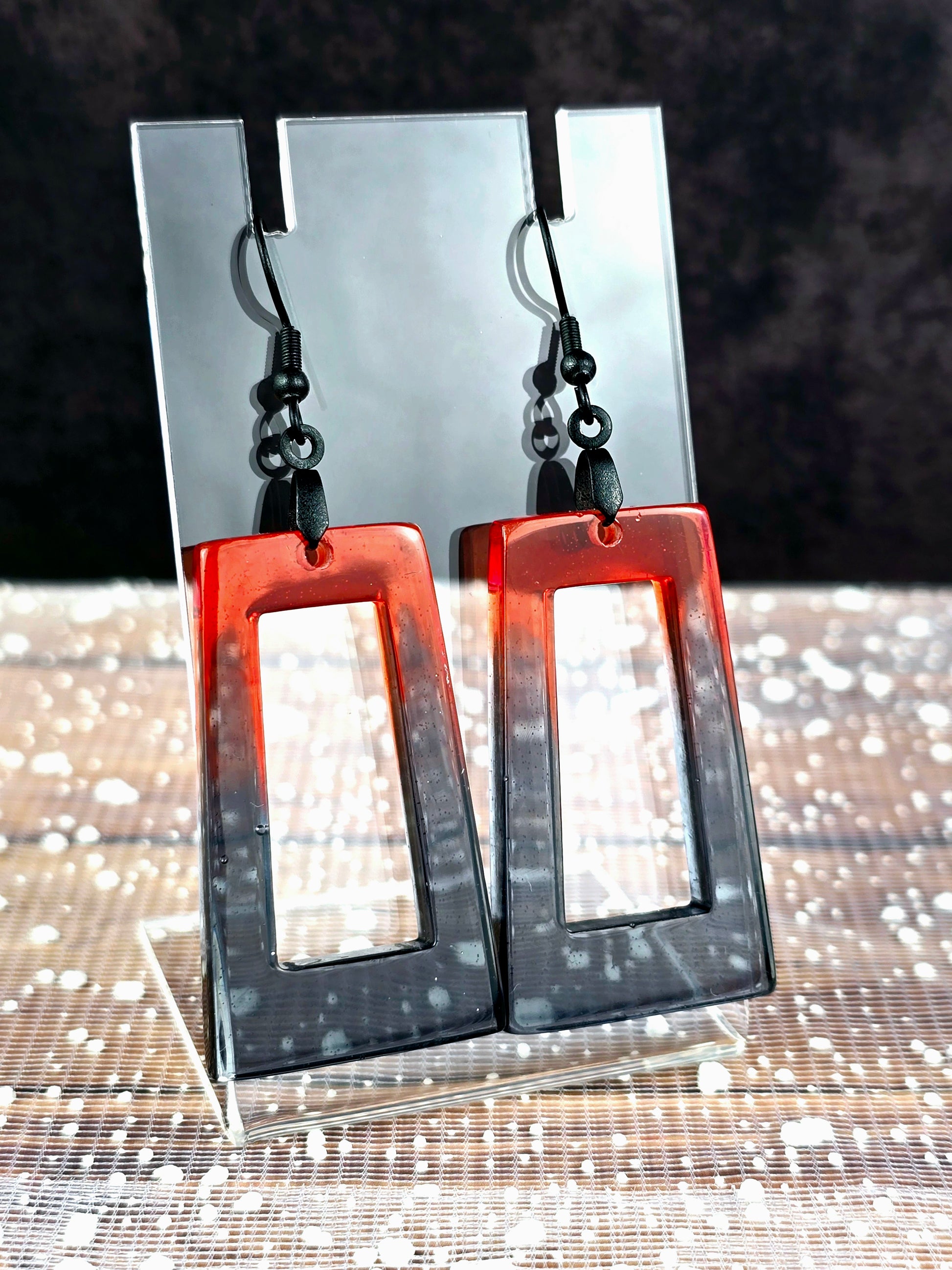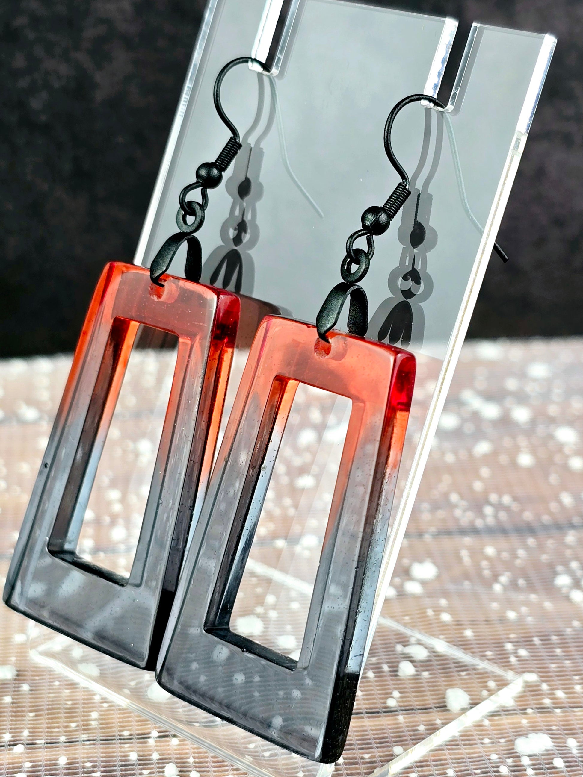 Add a bit of modern elegance to your outfit with these sleek black and red rectangular epoxy resin hoop pendants. The pendants are made of high-quality resin in a striking black and red color combination, creating a bold and eye-catching look. The earrings feature black stainless steel hook style earrings that are 7cm long with a drop length of 5.25cm. The pendant itself measures 4.25cm long by 2.5cm wide, making it the perfect statement piece for any occasion. Elevate your style with these unique and stylish earrings that are sure to turn heads wherever you go.