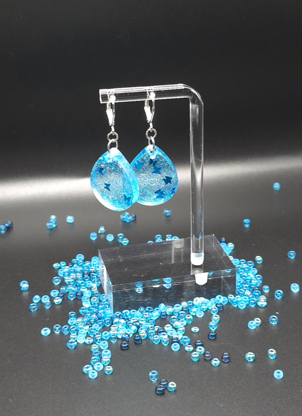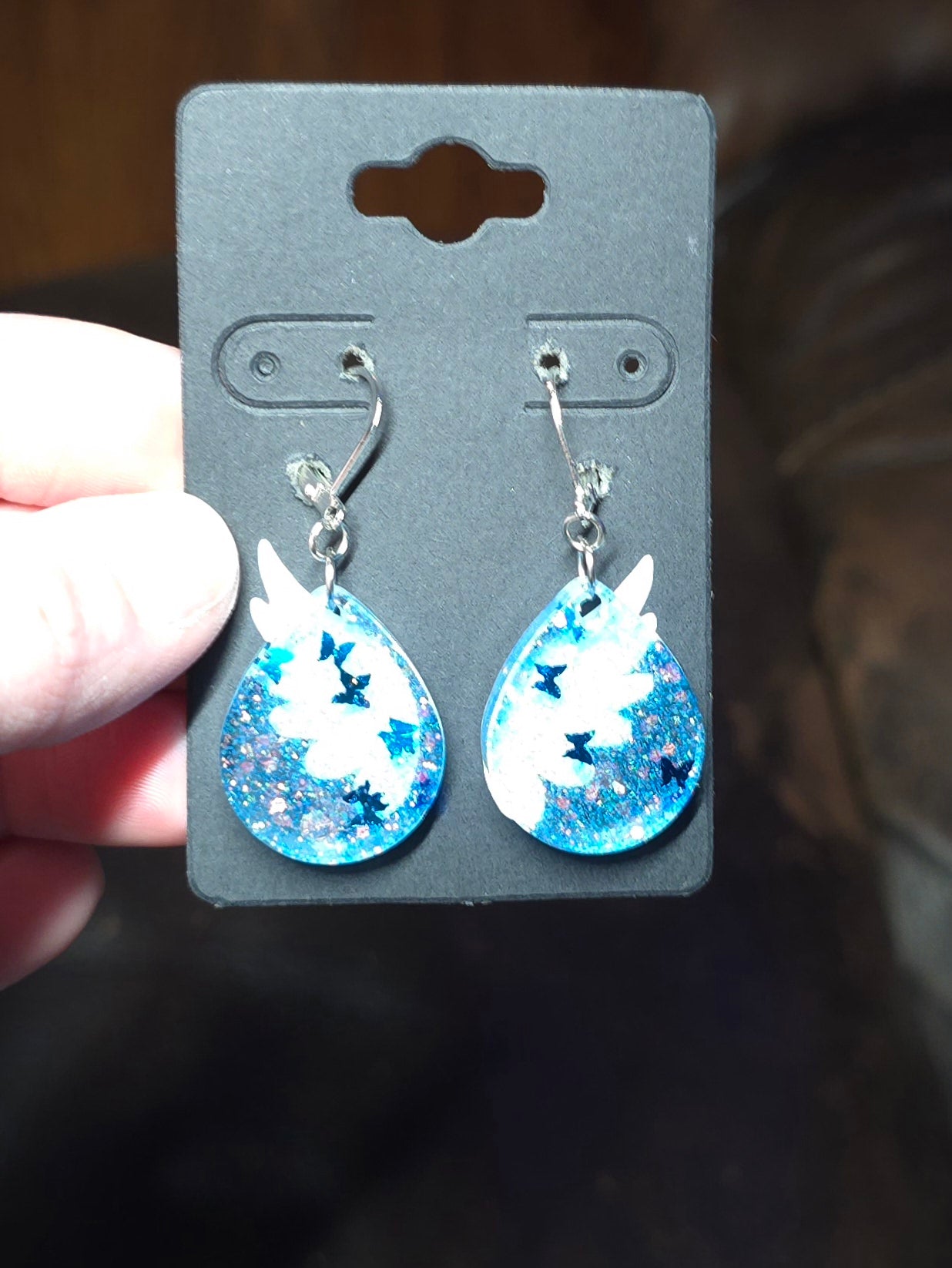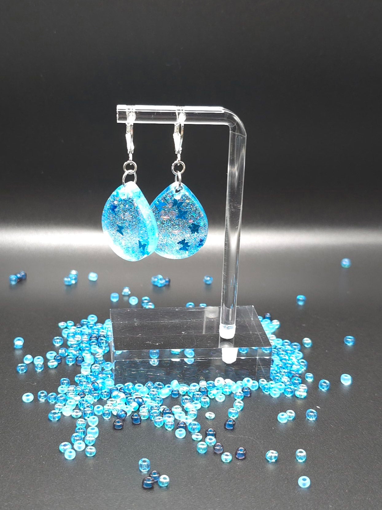 Elevate your style with our Stunning Tear Drop Resin Earrings. Made with clear resin and blue glitter, these earrings feature delicate blue butterflies for a unique touch. Crafted with stainless steel hooks and jump rings, they are versatile for any occasion. Perfectly complete any outfit with these elegant earrings. These Earrings feature a hook and latch. 1 1/2" in length with the charm measuring at 1" long x 3/8" wide.