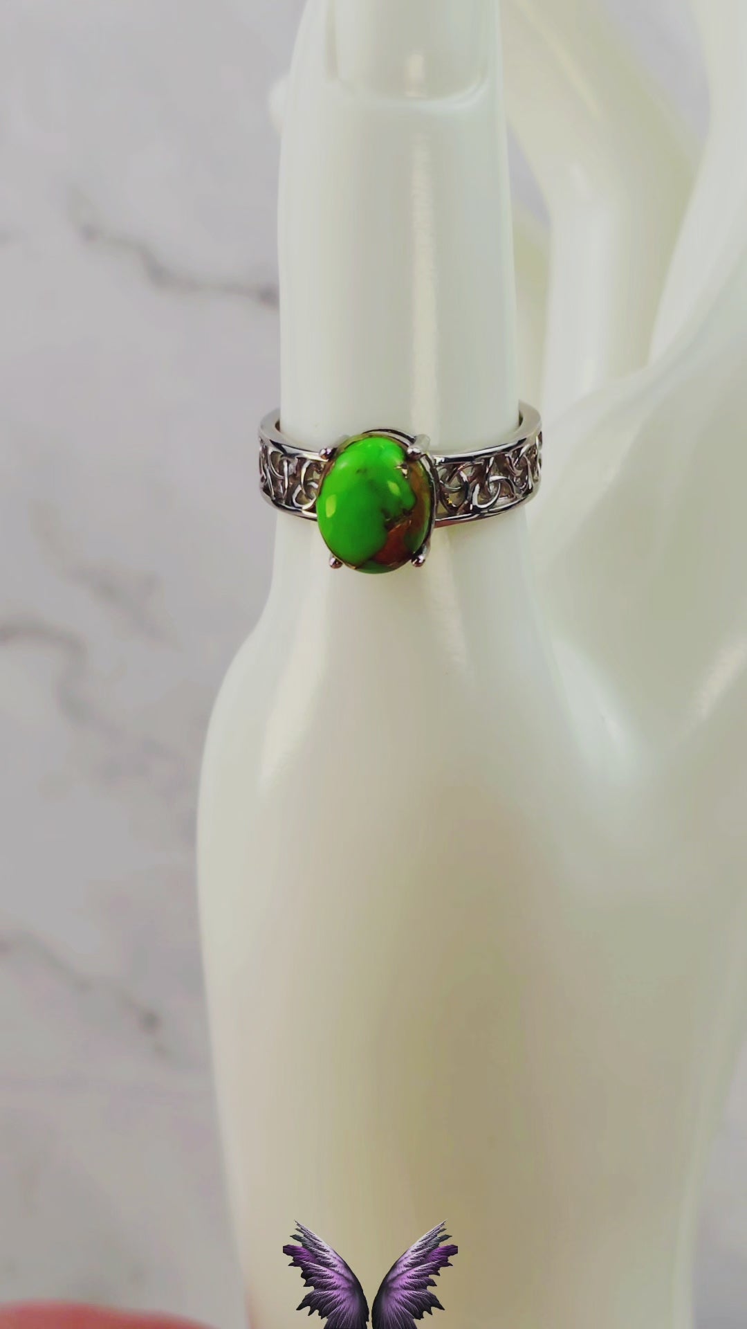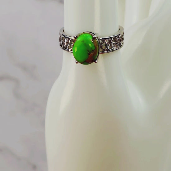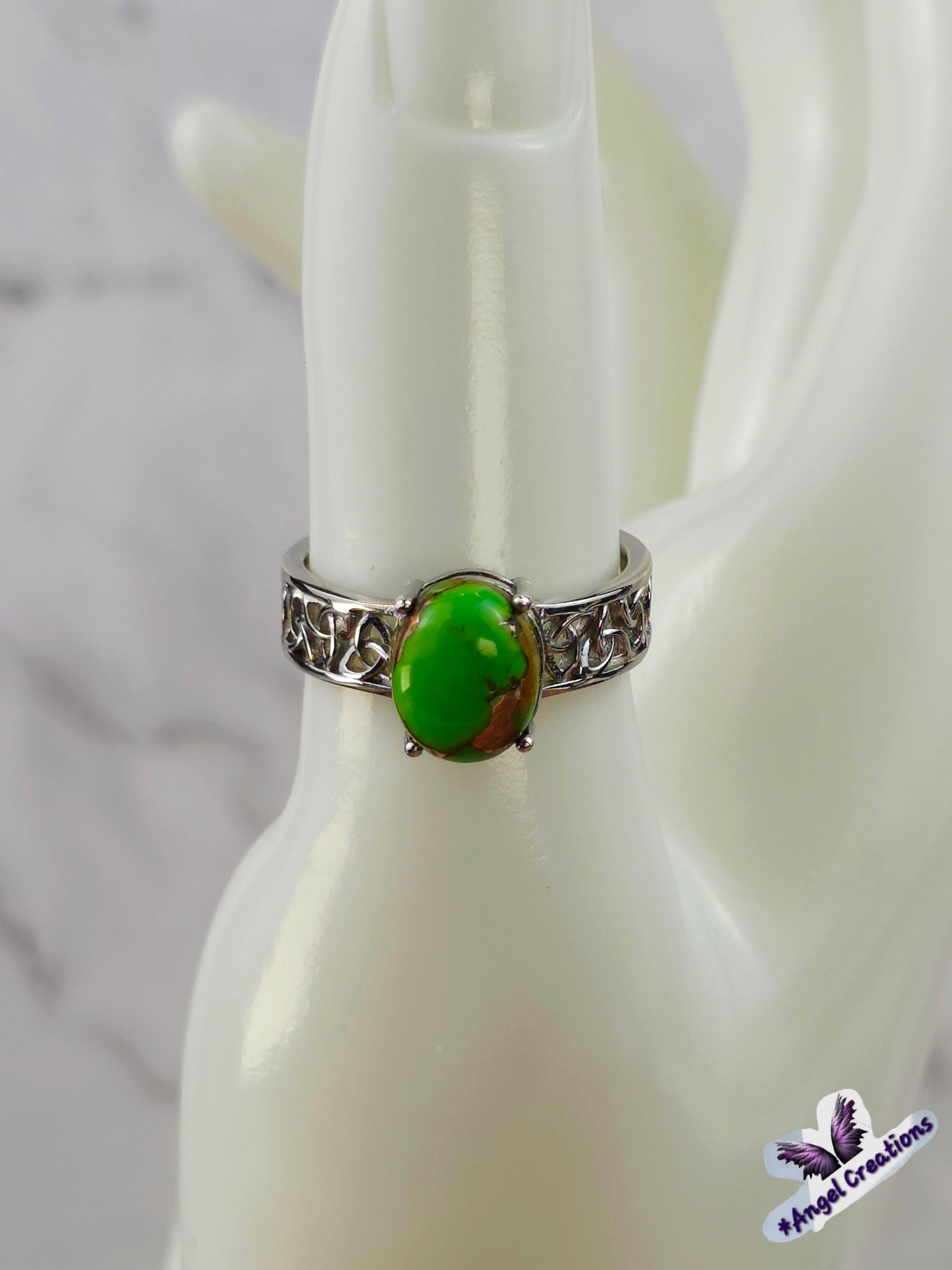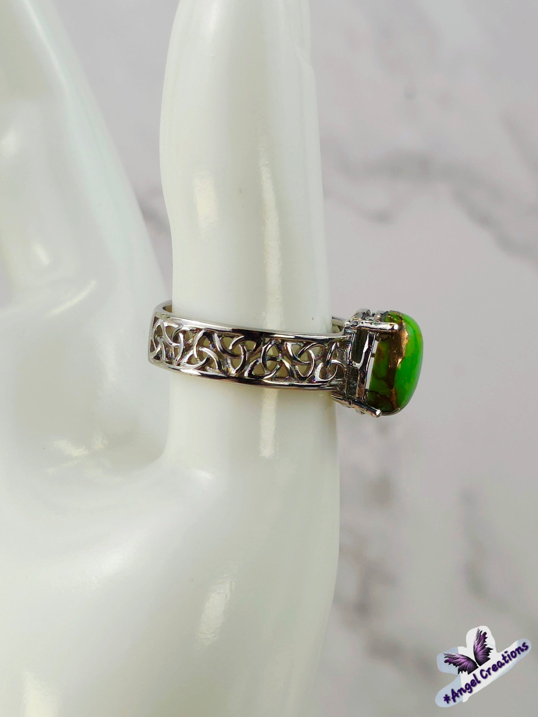 Discover the enchanting blend of elegance and spirituality in this exquisite 925 Sterling Silver Celtic Ring. Crafted with meticulous attention to detail, this piece showcases a stunning oval-shaped gemstone of rich green turquoise, measuring approximately 8x10mm. The cabochon cut amplifies the stone's natural beauty, allowing its vibrant hues to resonate deeply.