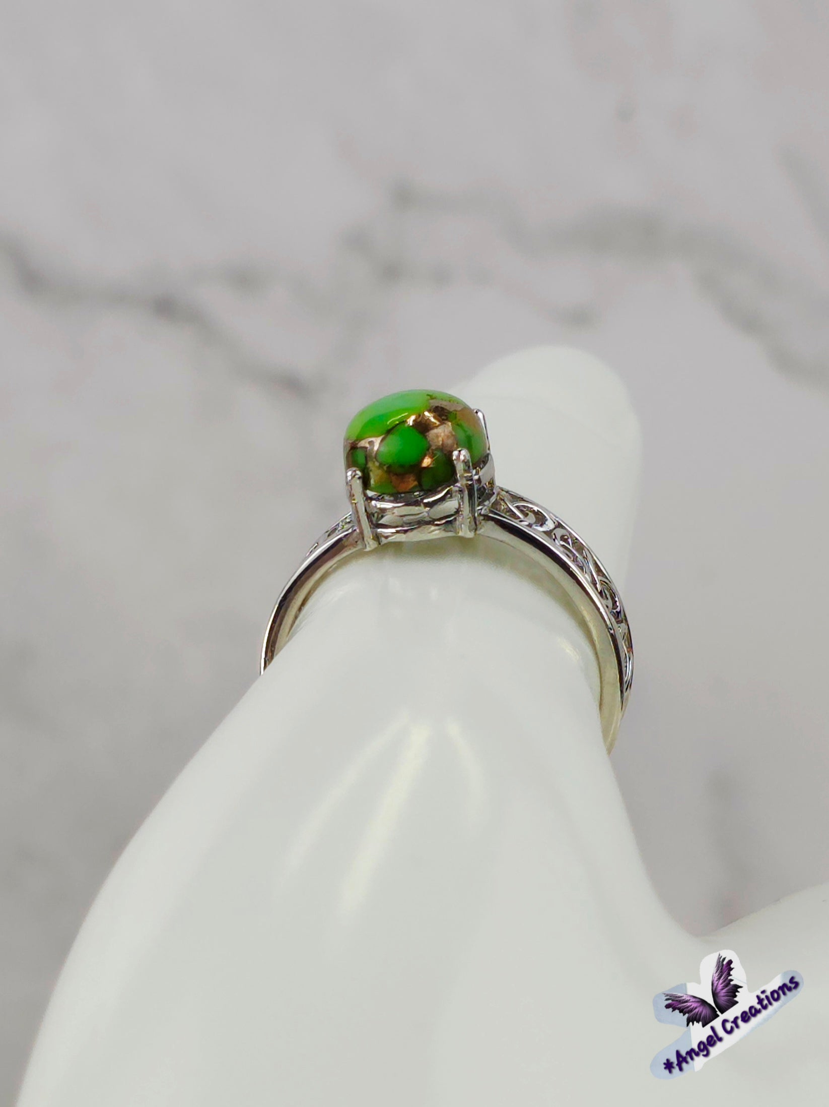 The ring features a classic prong setting that securely holds the turquoise, highlighting its captivating color and smooth texture. The intricate Celtic design etched into the band adds a touch of timeless charm, symbolizing interconnectedness and eternity—perfect for those who appreciate both beauty and meaning in their jewelry.