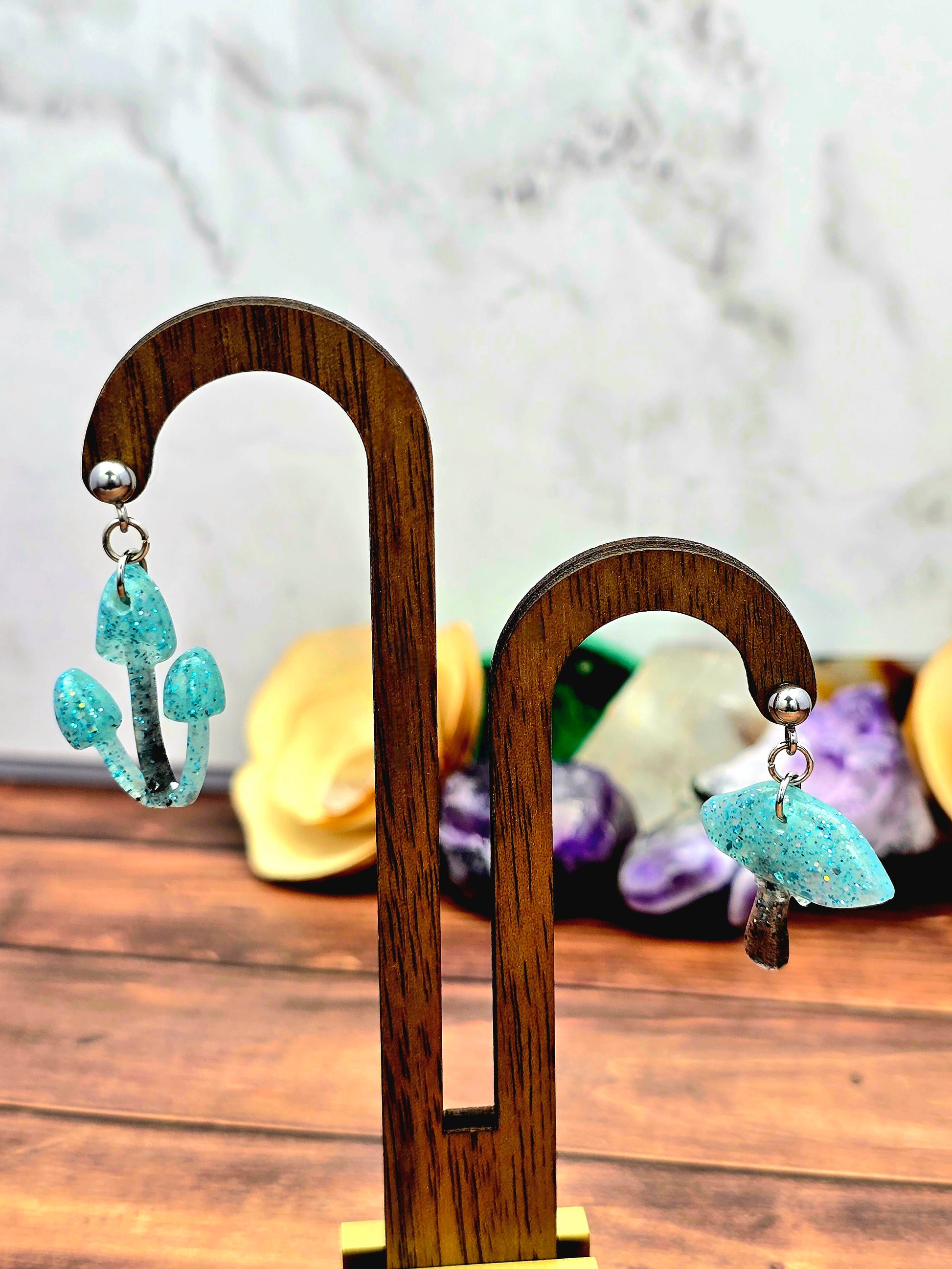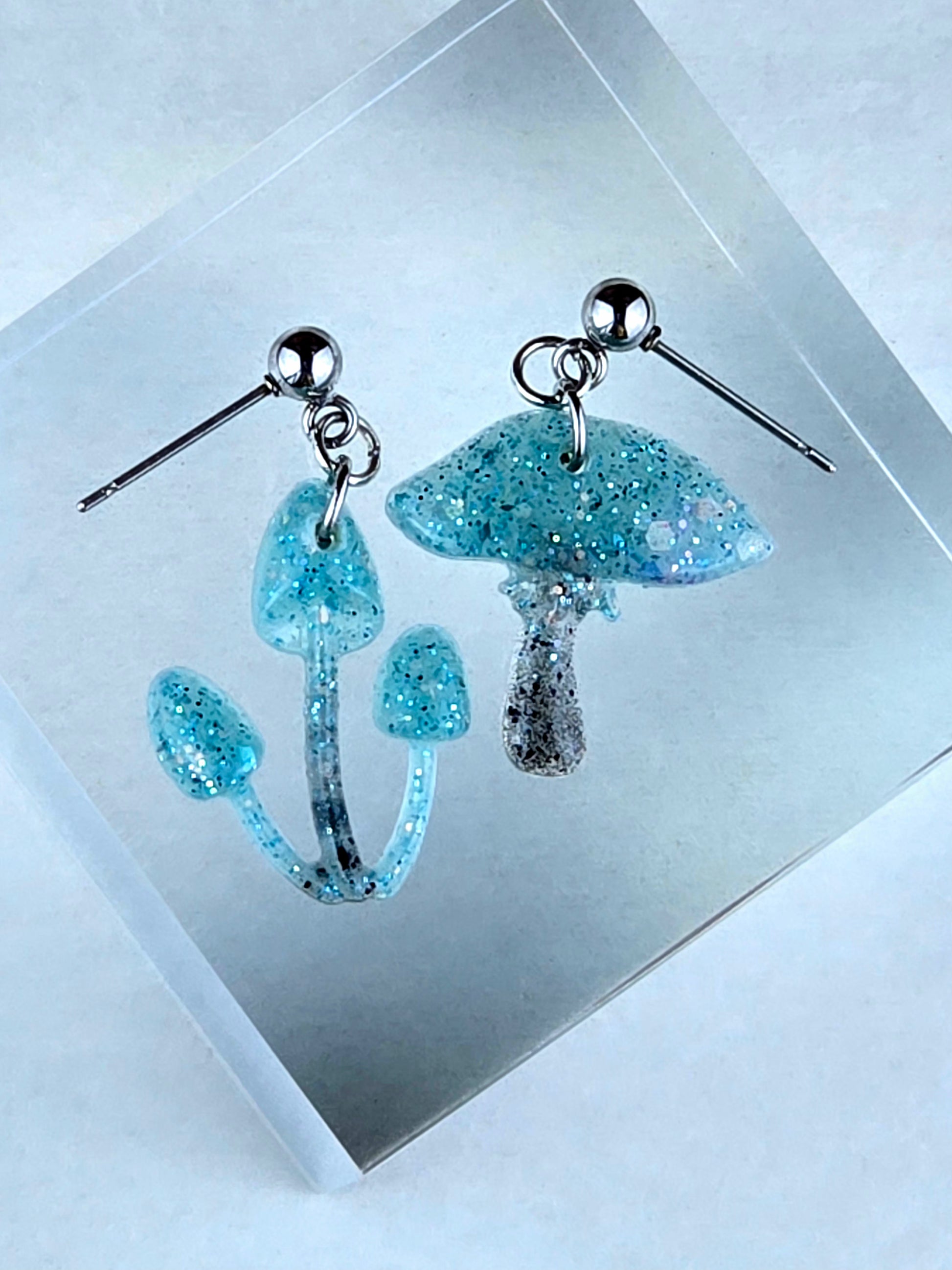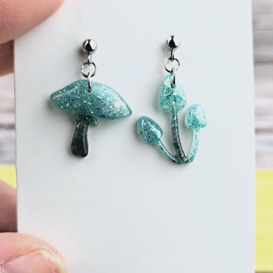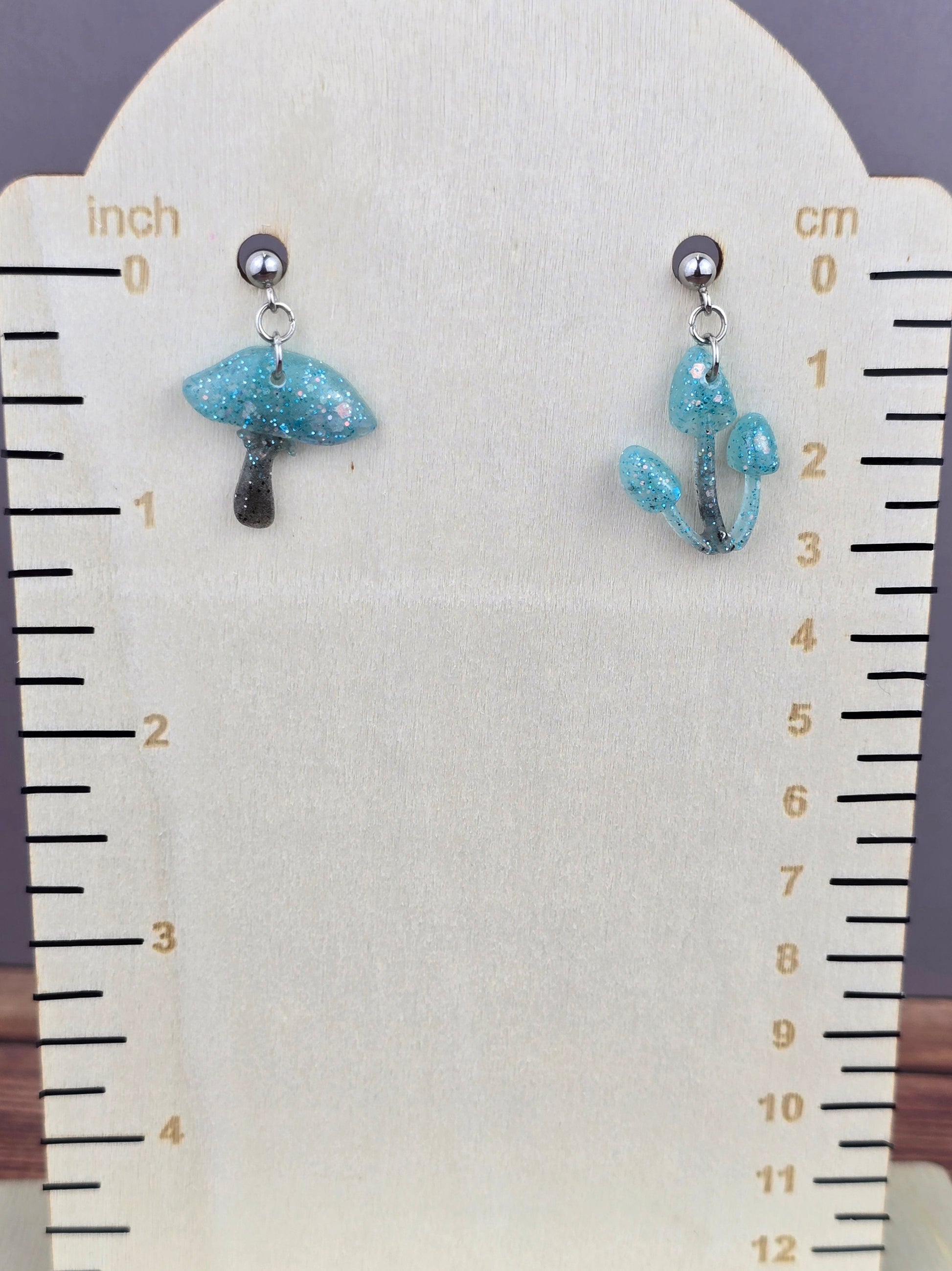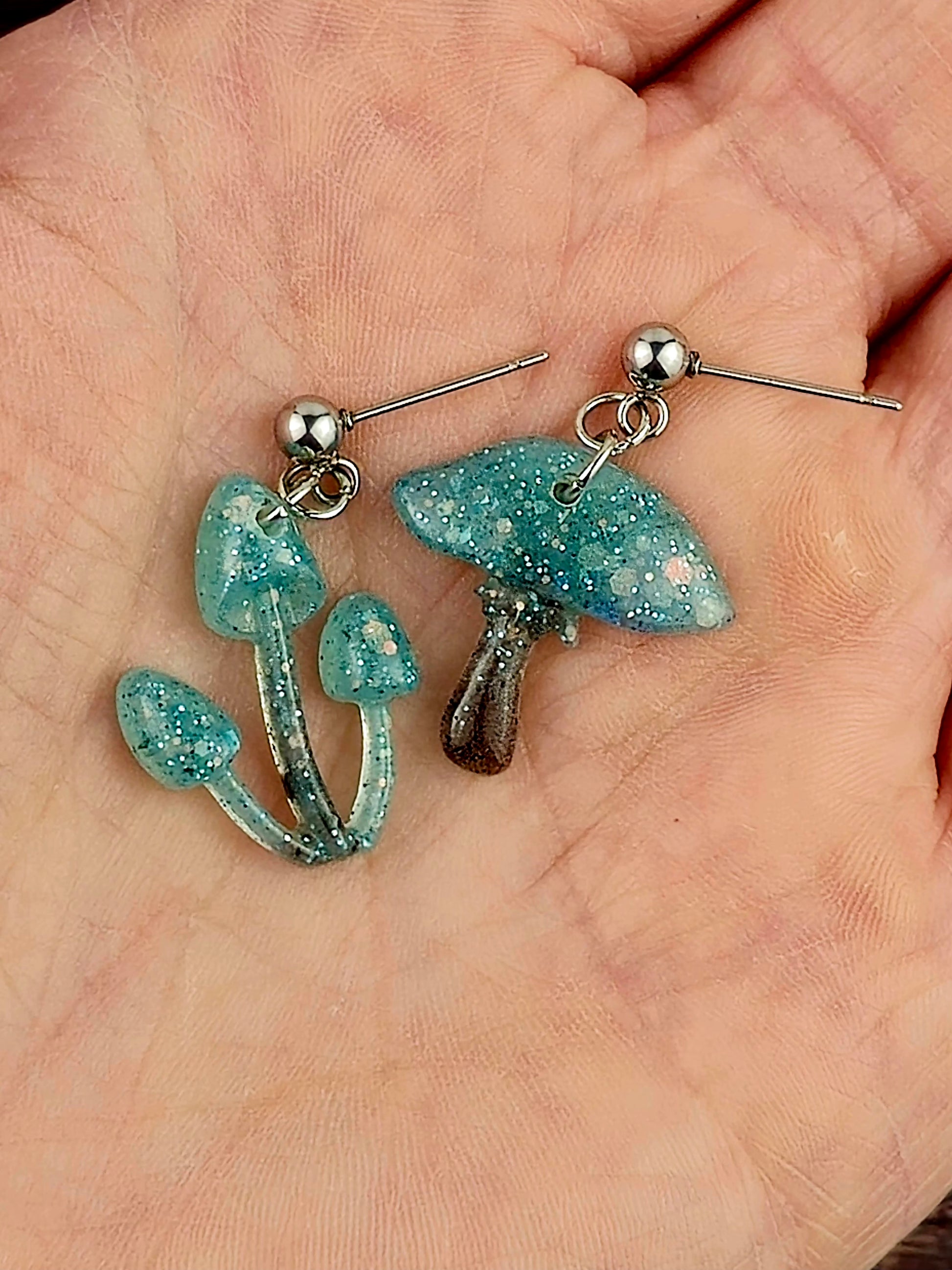 Bring a touch of whimsy to your outfit with these unique mushroom earrings! Made with 304 stainless steel ball post earrings, each earring features a teal and black glitter mismatch mushroom epoxy resin pendant. The one cap mushroom earring is 2.75cm long with a drop length of 2.25cm and is 2cm wide, while the mushroom pendant itself measures 2cm x 2cm. The three cap mushroom earring is 3cm long with a drop length of 2.5cm and is 1.75cm wide, with the pendant measuring 1.75cm x 2.25cm. These earrings are perfect for adding a pop of color and fun to your look, and the .8mm pin with loop ensures they stay securely in place. Add these adorable mushroom earrings to your collection today!