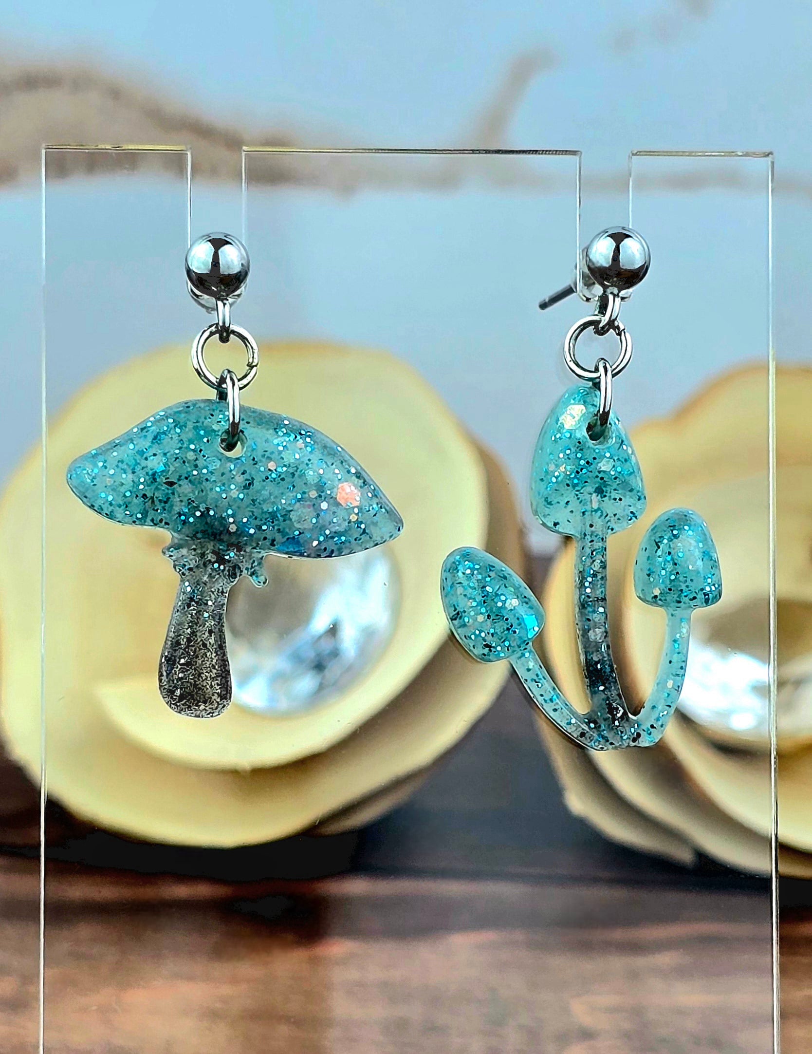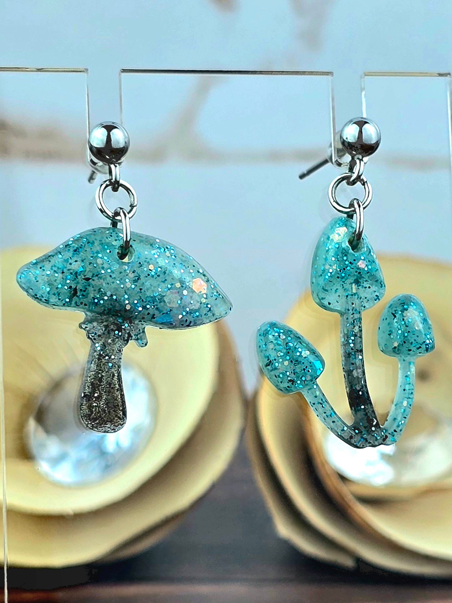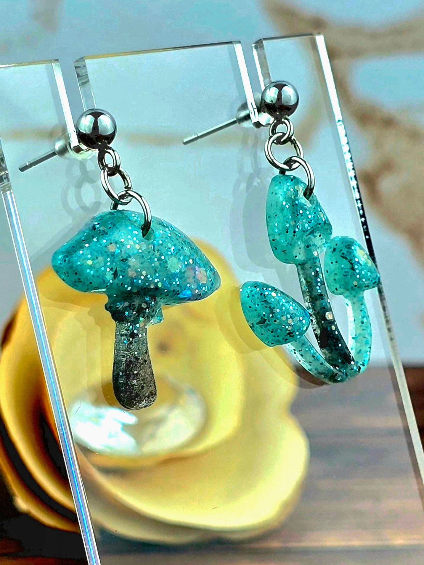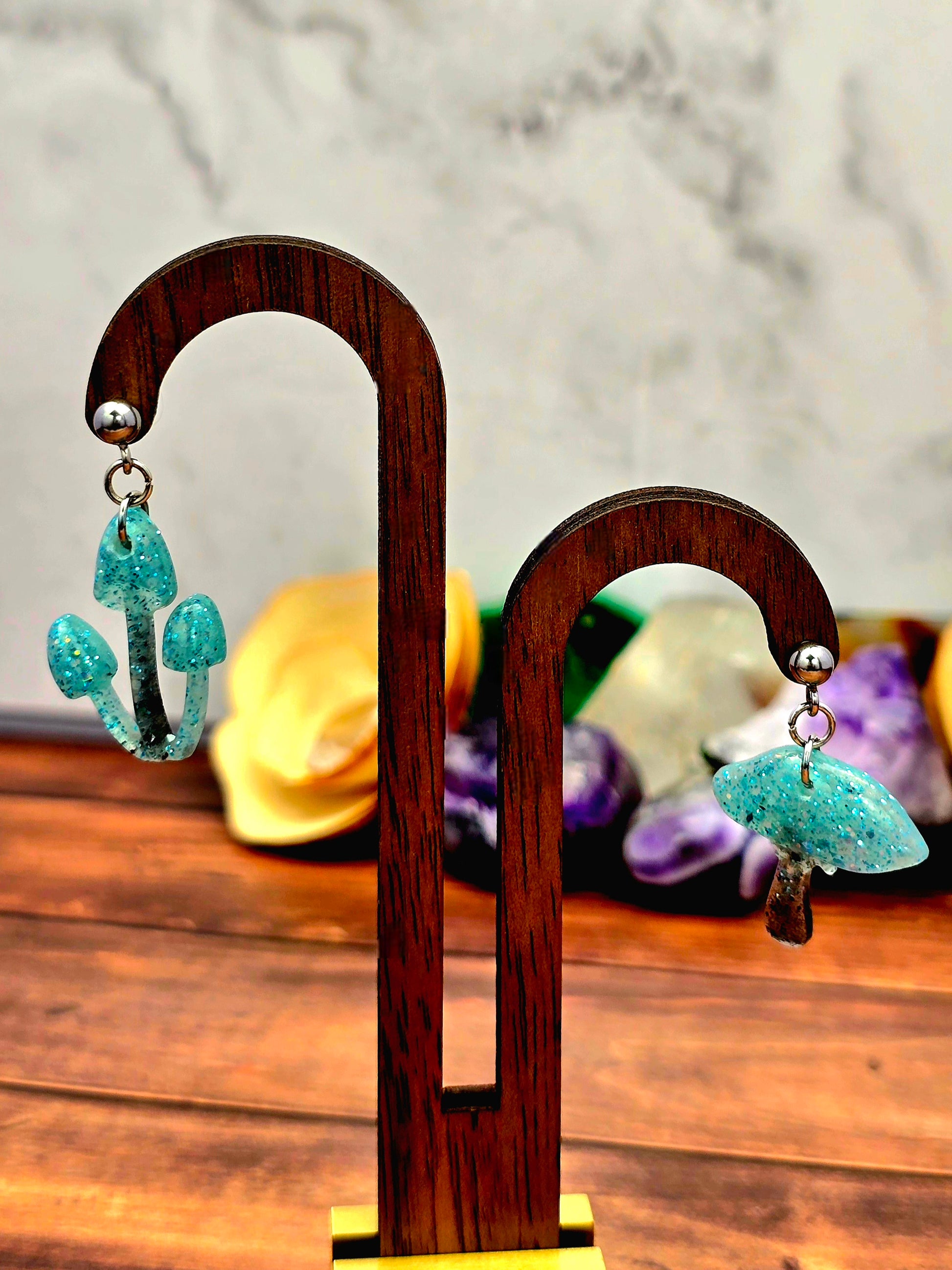 Bring a touch of whimsy to your outfit with these unique mushroom earrings! Made with 304 stainless steel ball post earrings, each earring features a teal and black glitter mismatch mushroom epoxy resin pendant. The one cap mushroom earring is 2.75cm long with a drop length of 2.25cm and is 2cm wide, while the mushroom pendant itself measures 2cm x 2cm. The three cap mushroom earring is 3cm long with a drop length of 2.5cm and is 1.75cm wide, with the pendant measuring 1.75cm x 2.25cm. These earrings are perfect for adding a pop of color and fun to your look, and the .8mm pin with loop ensures they stay securely in place. Add these adorable mushroom earrings to your collection today!