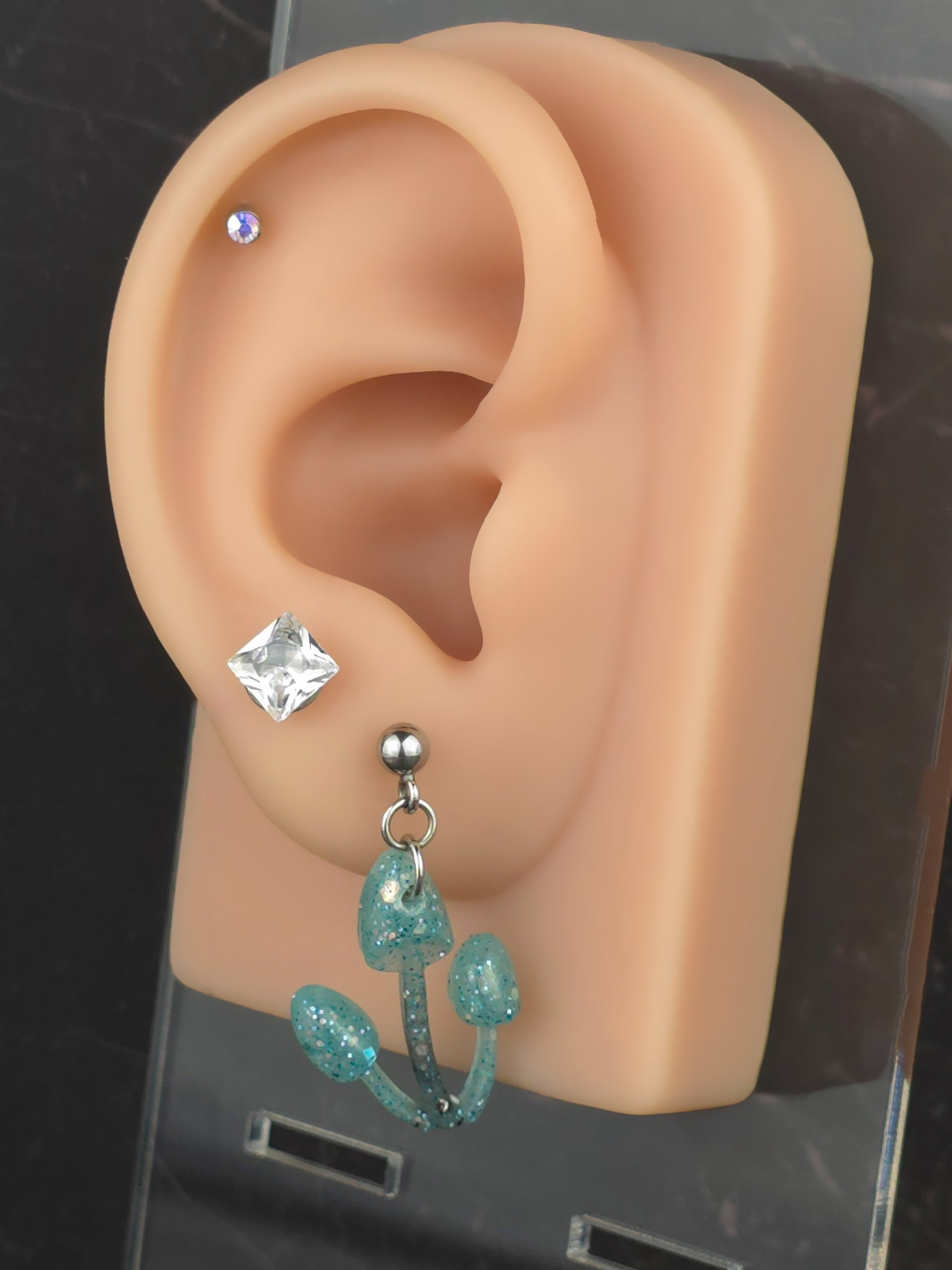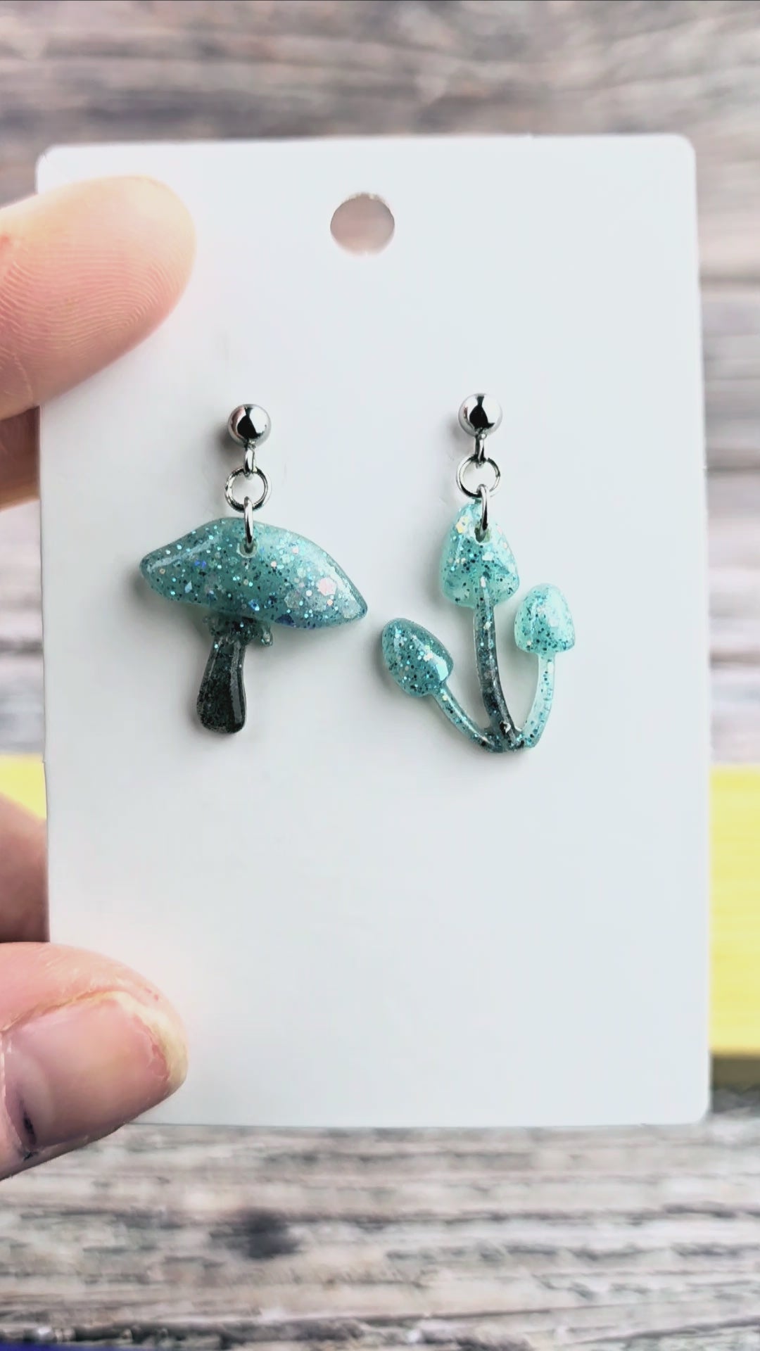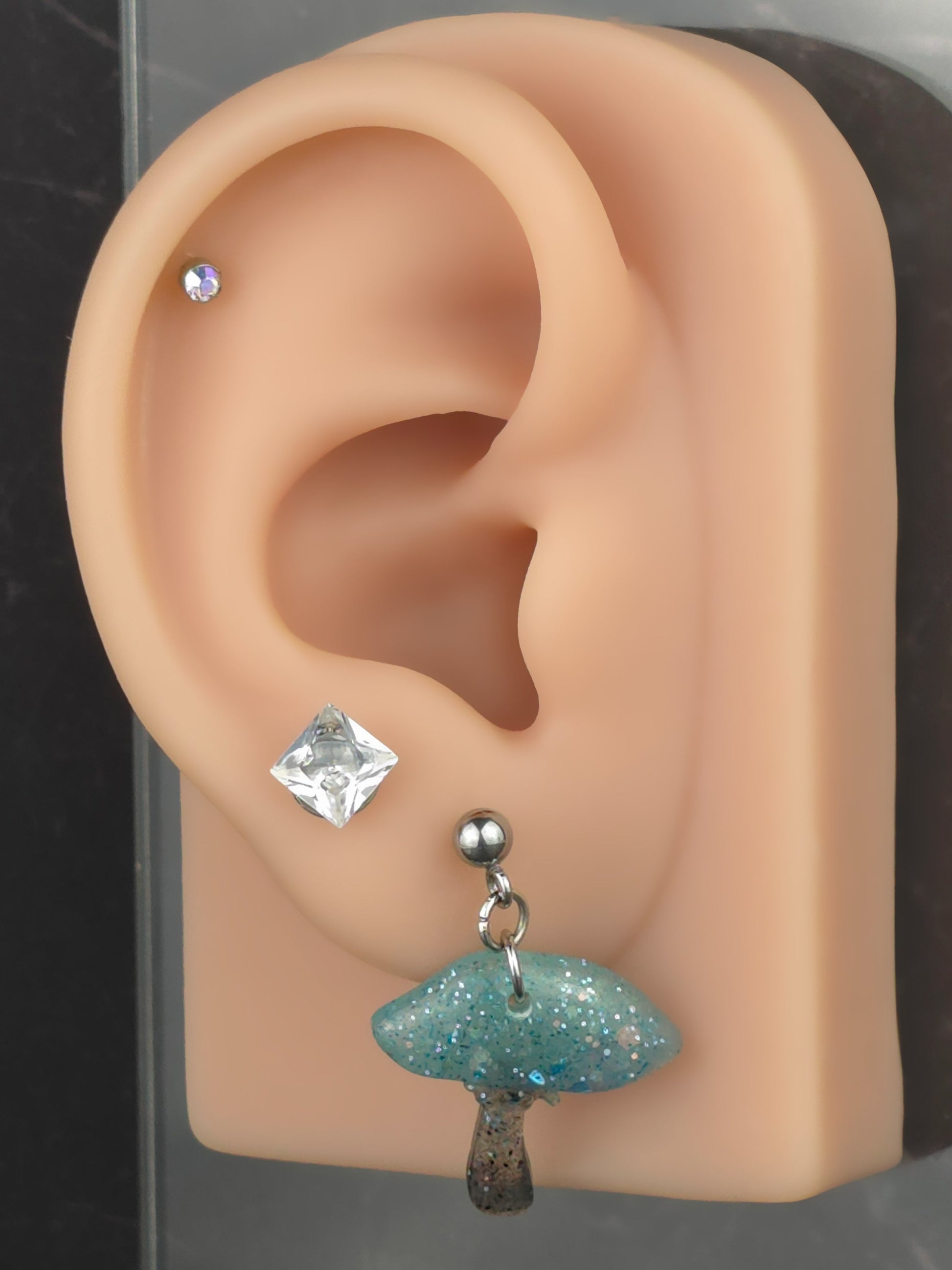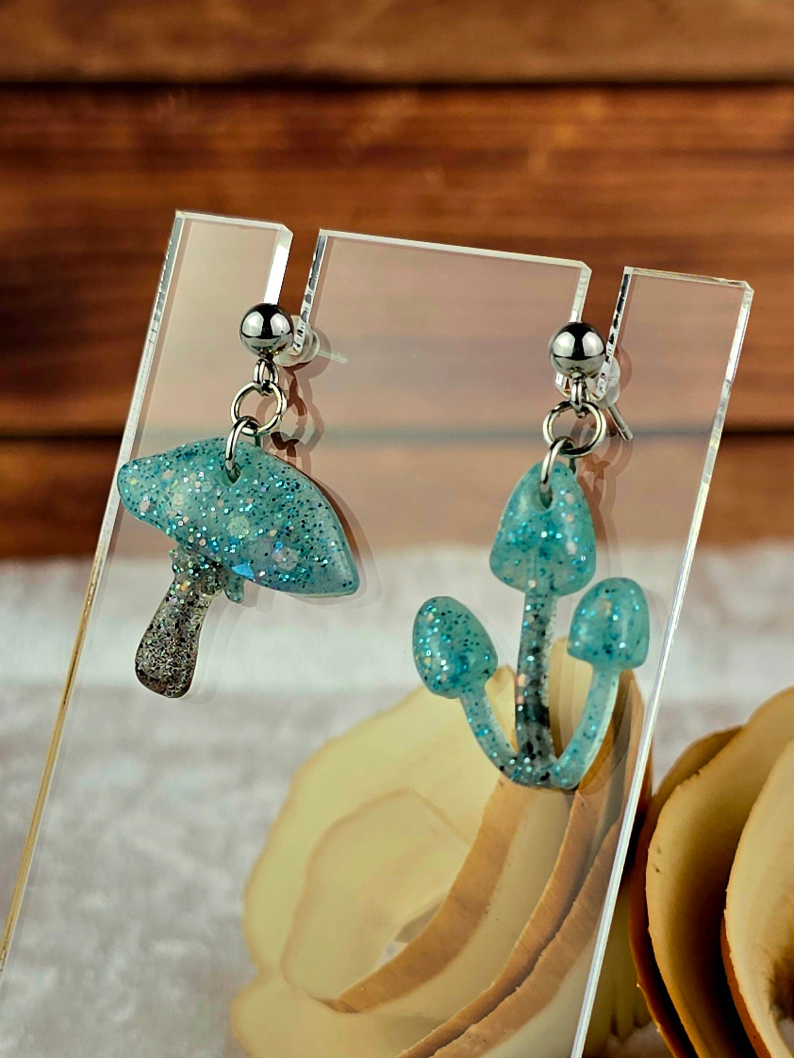 Bring a touch of whimsy to your outfit with these unique mushroom earrings! Made with 304 stainless steel ball post earrings, each earring features a teal and black glitter mismatch mushroom epoxy resin pendant. The one cap mushroom earring is 2.75cm long with a drop length of 2.25cm and is 2cm wide, while the mushroom pendant itself measures 2cm x 2cm. The three cap mushroom earring is 3cm long with a drop length of 2.5cm and is 1.75cm wide, with the pendant measuring 1.75cm x 2.25cm. These earrings are perfect for adding a pop of color and fun to your look, and the .8mm pin with loop ensures they stay securely in place. Add these adorable mushroom earrings to your collection today!