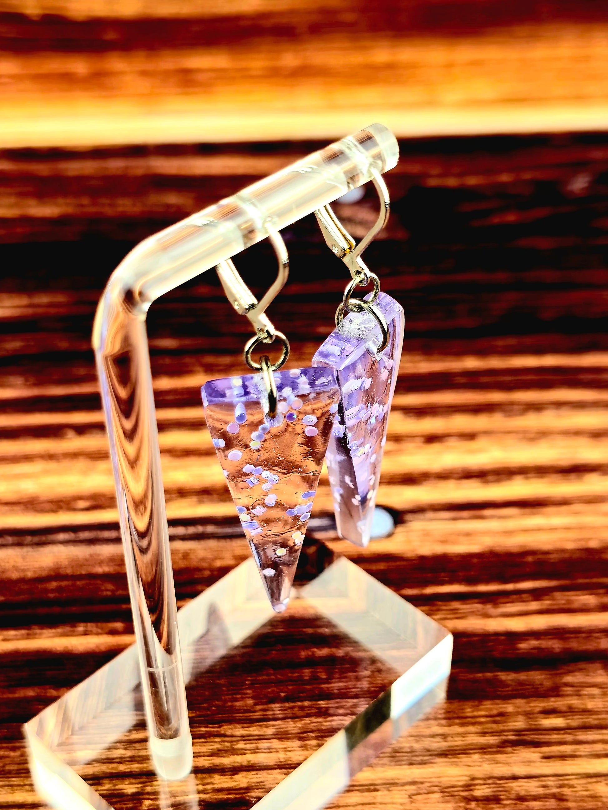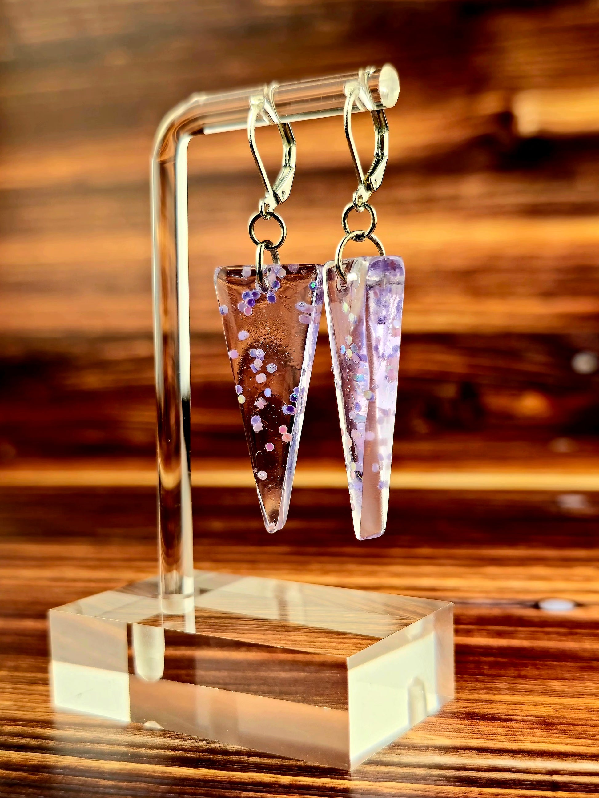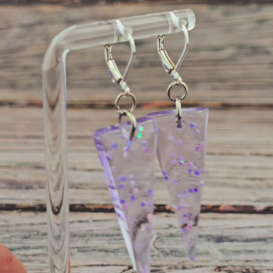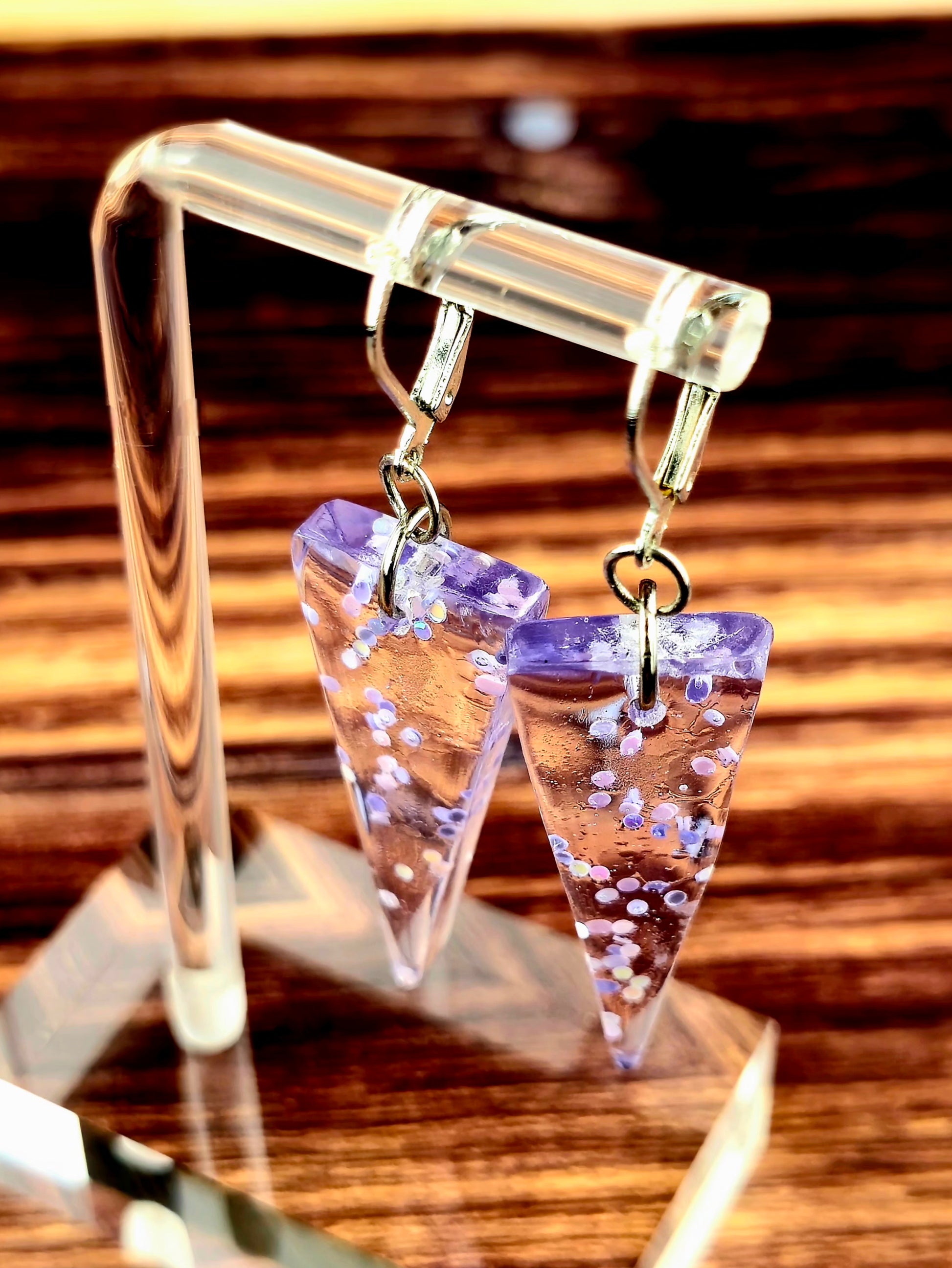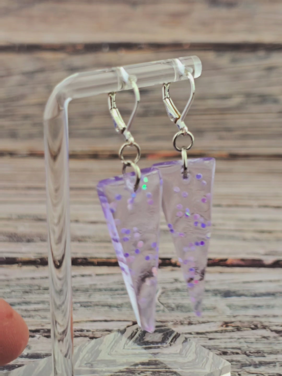 Add a touch of elegance to your outfit with these stunning silver 304 stainless steel French lever-back earrings. The 10x16mm size is perfect for everyday wear, while the premium epoxy resin pendant adds a unique and eye-catching element. The upside down triangle shape features a beautiful light purple translucent color, with pink and purple confetti dots scattered throughout for a playful touch.