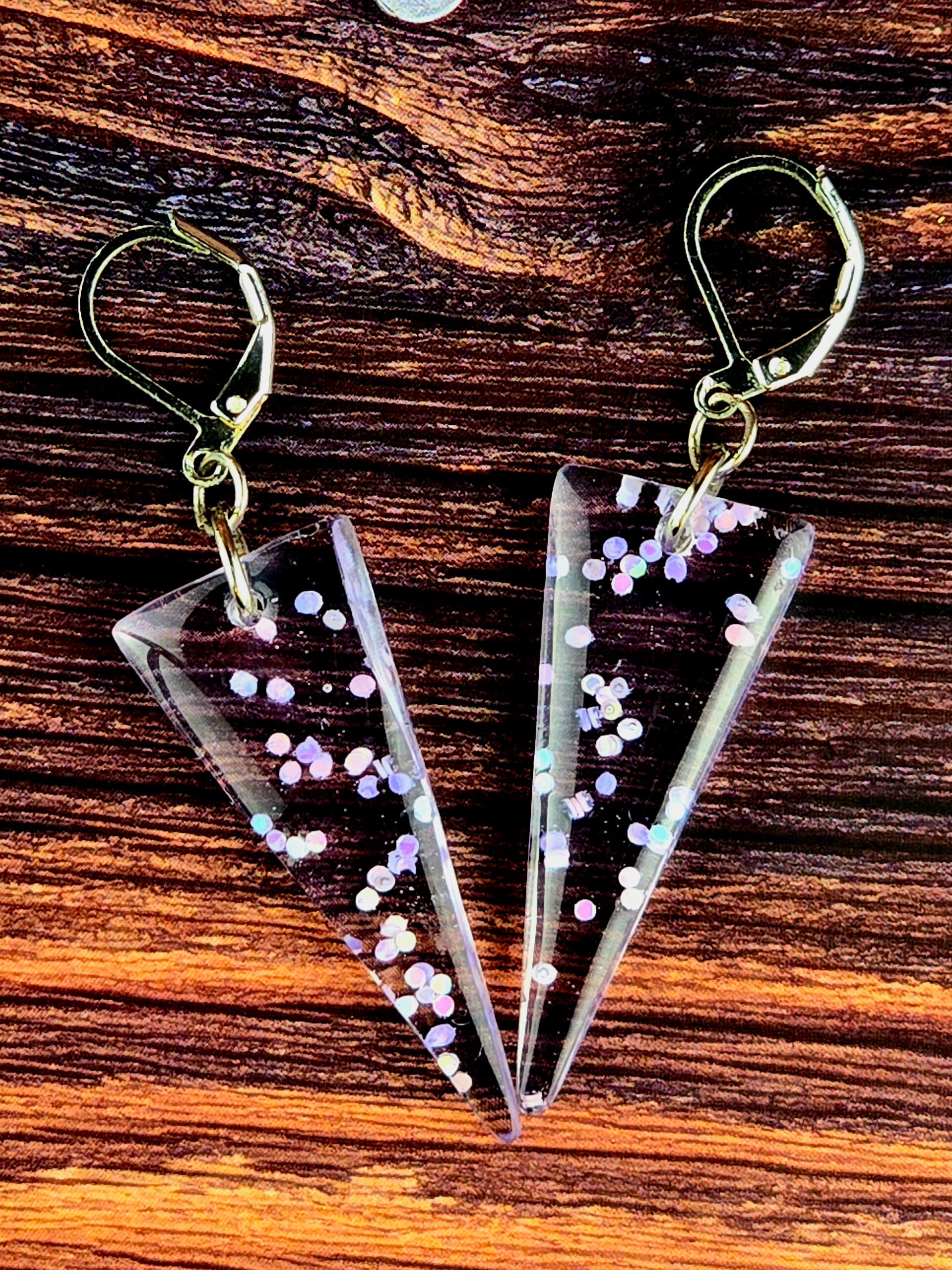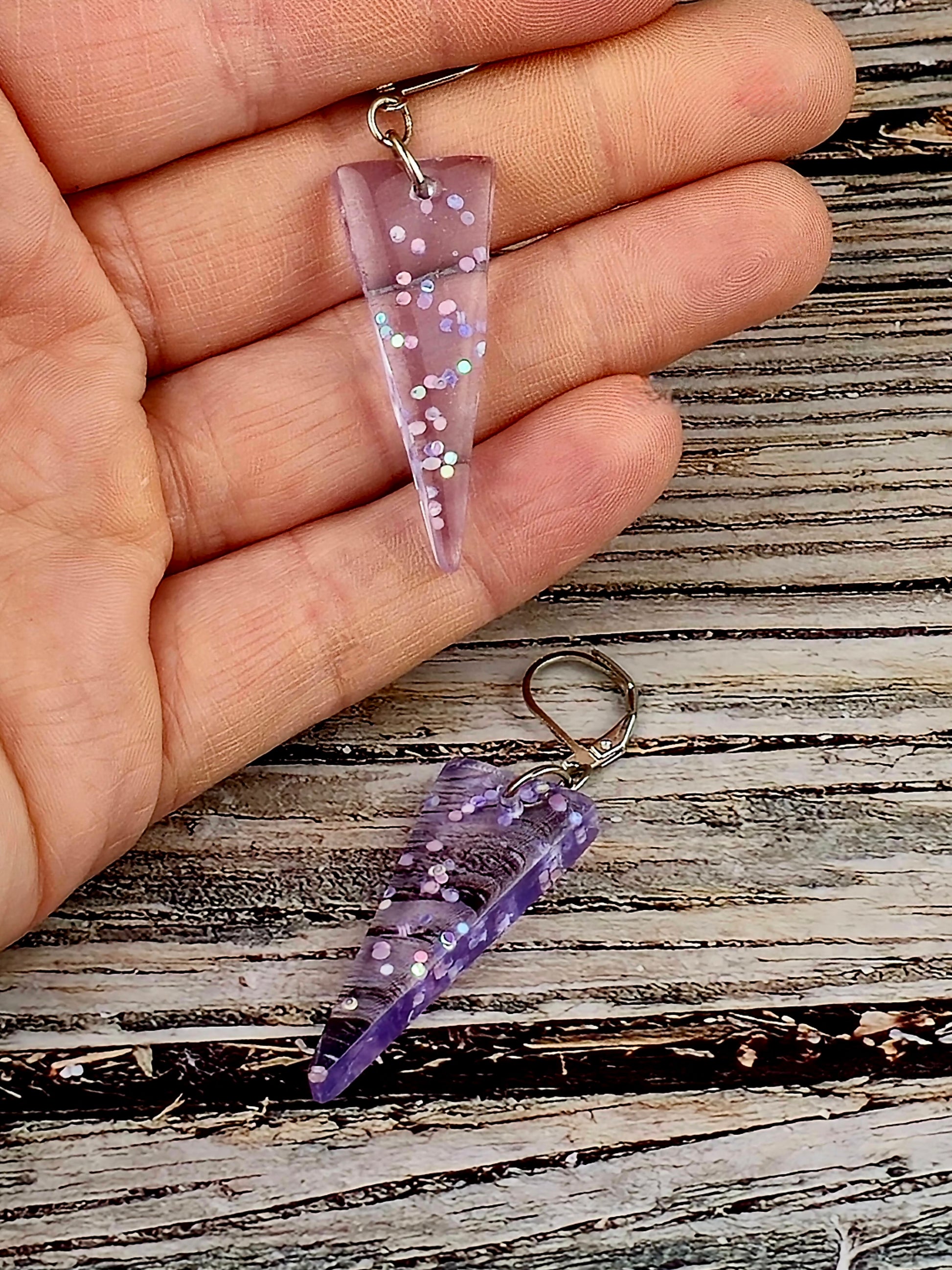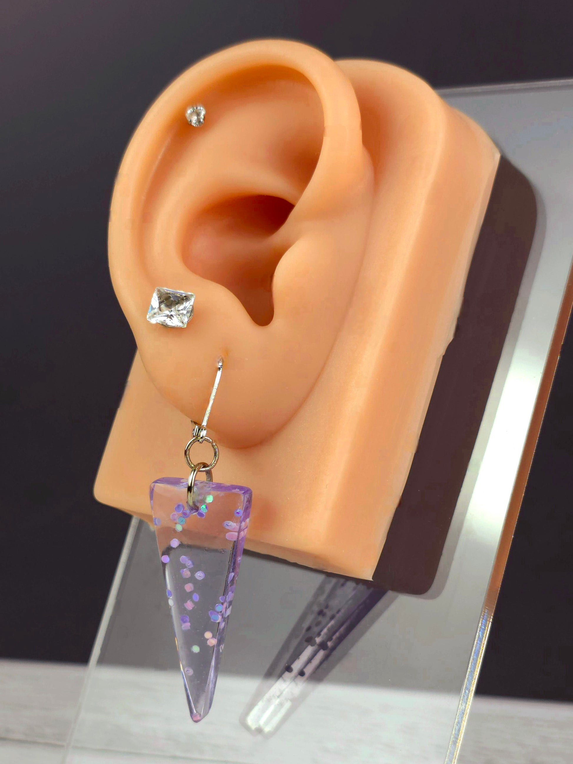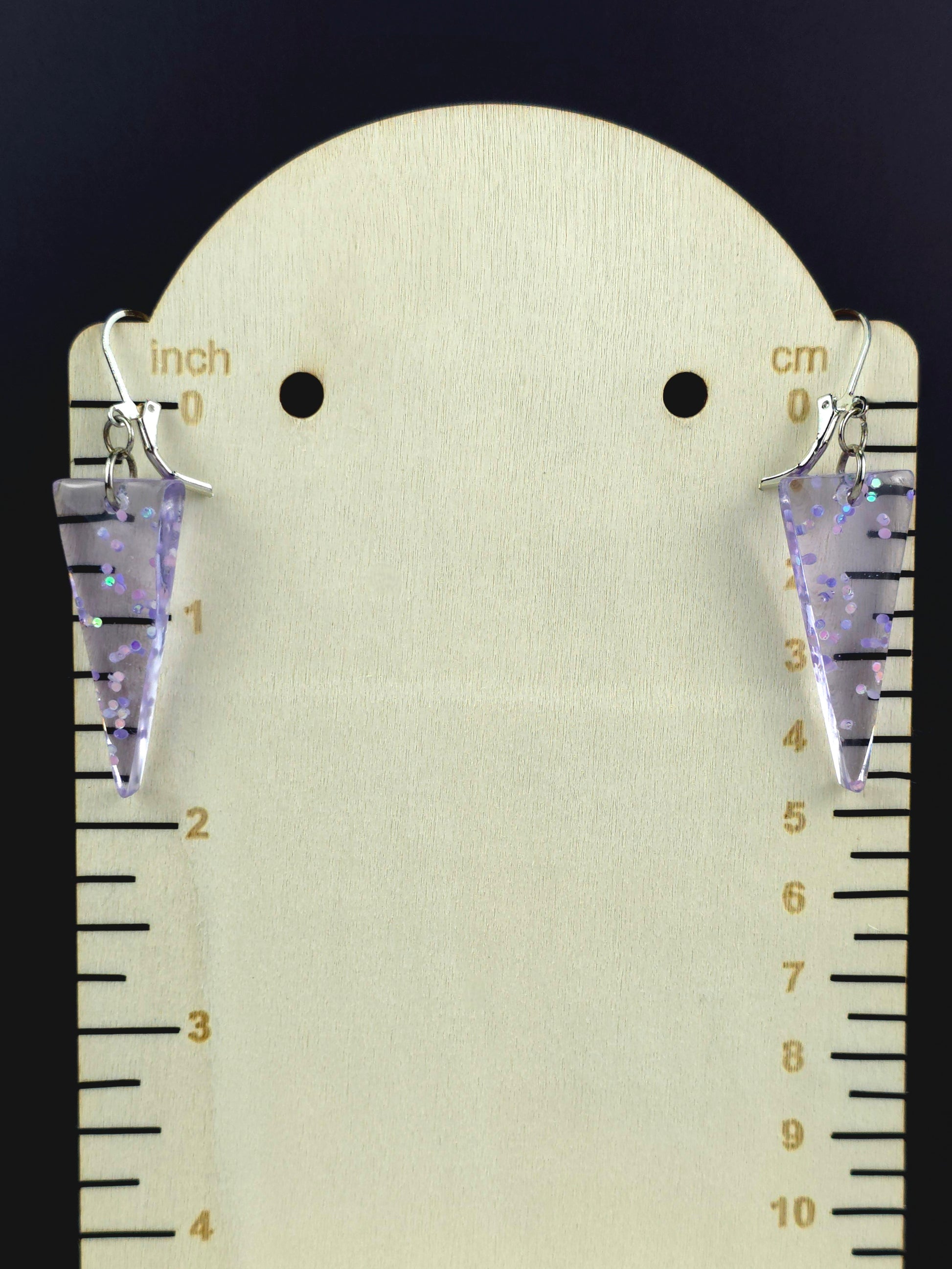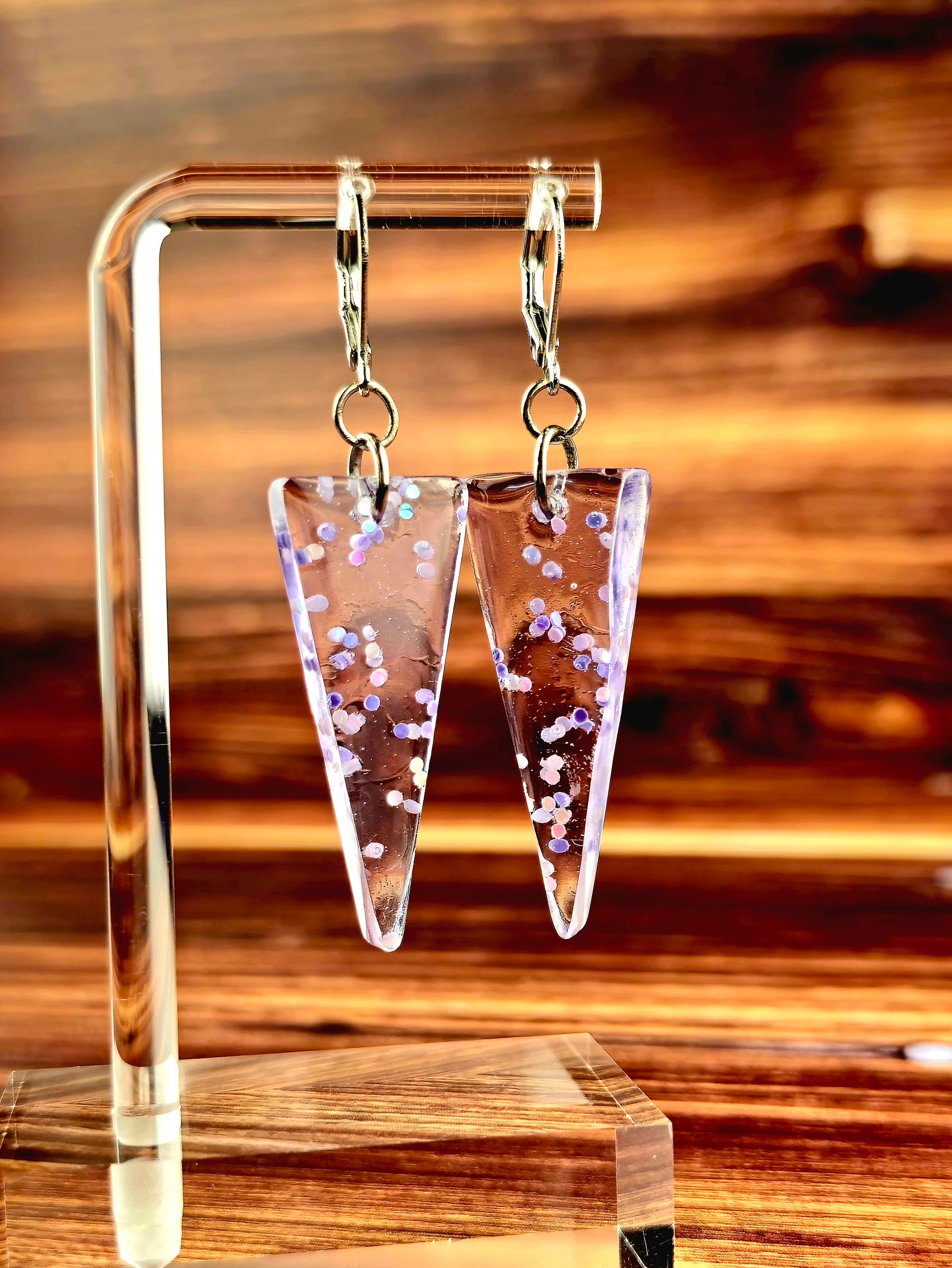 Add a touch of elegance to your outfit with these stunning silver 304 stainless steel French lever-back earrings. The 10x16mm size is perfect for everyday wear, while the premium epoxy resin pendant adds a unique and eye-catching element. The upside down triangle shape features a beautiful light purple translucent color, with pink and purple confetti dots scattered throughout for a playful touch.