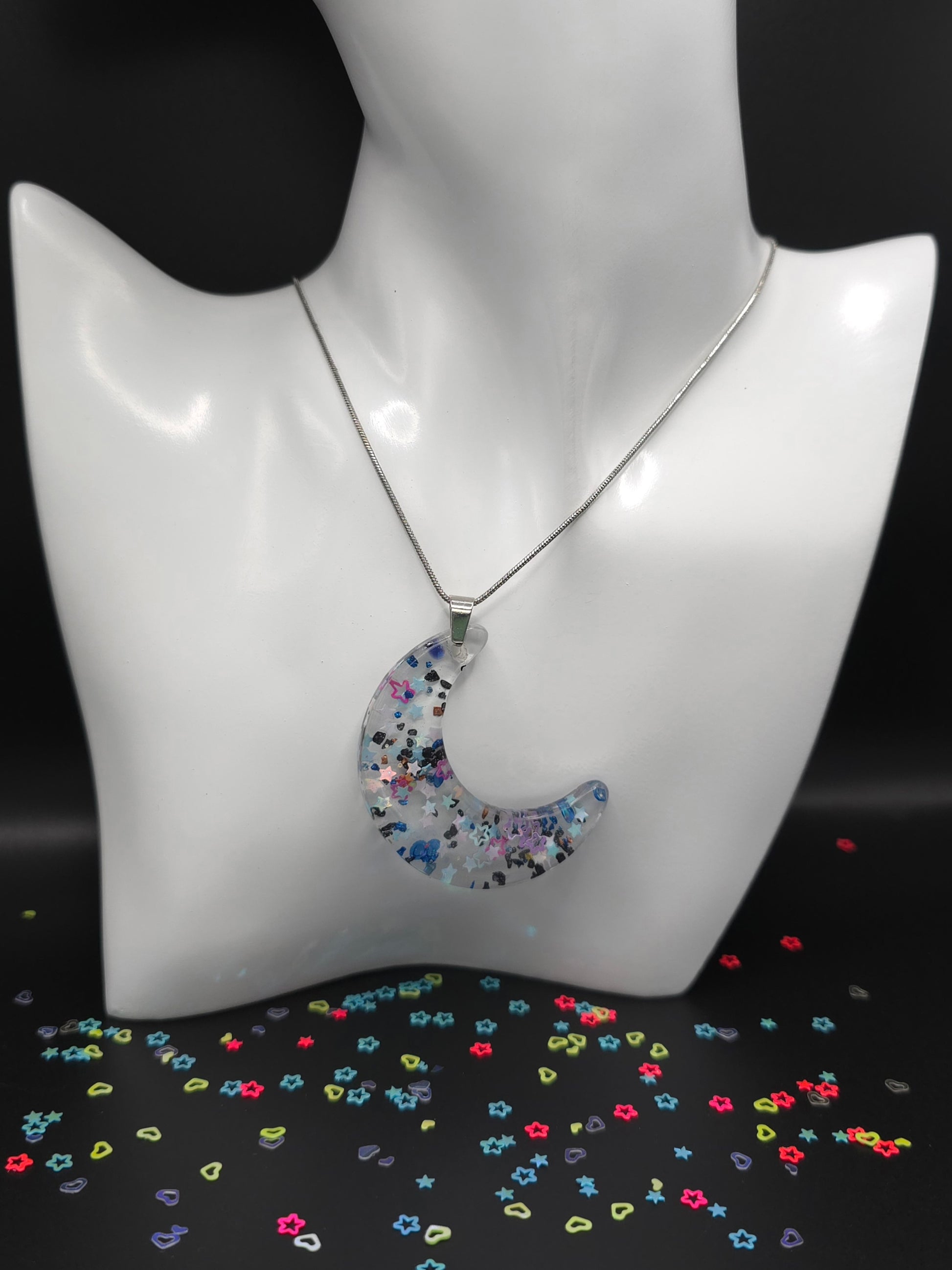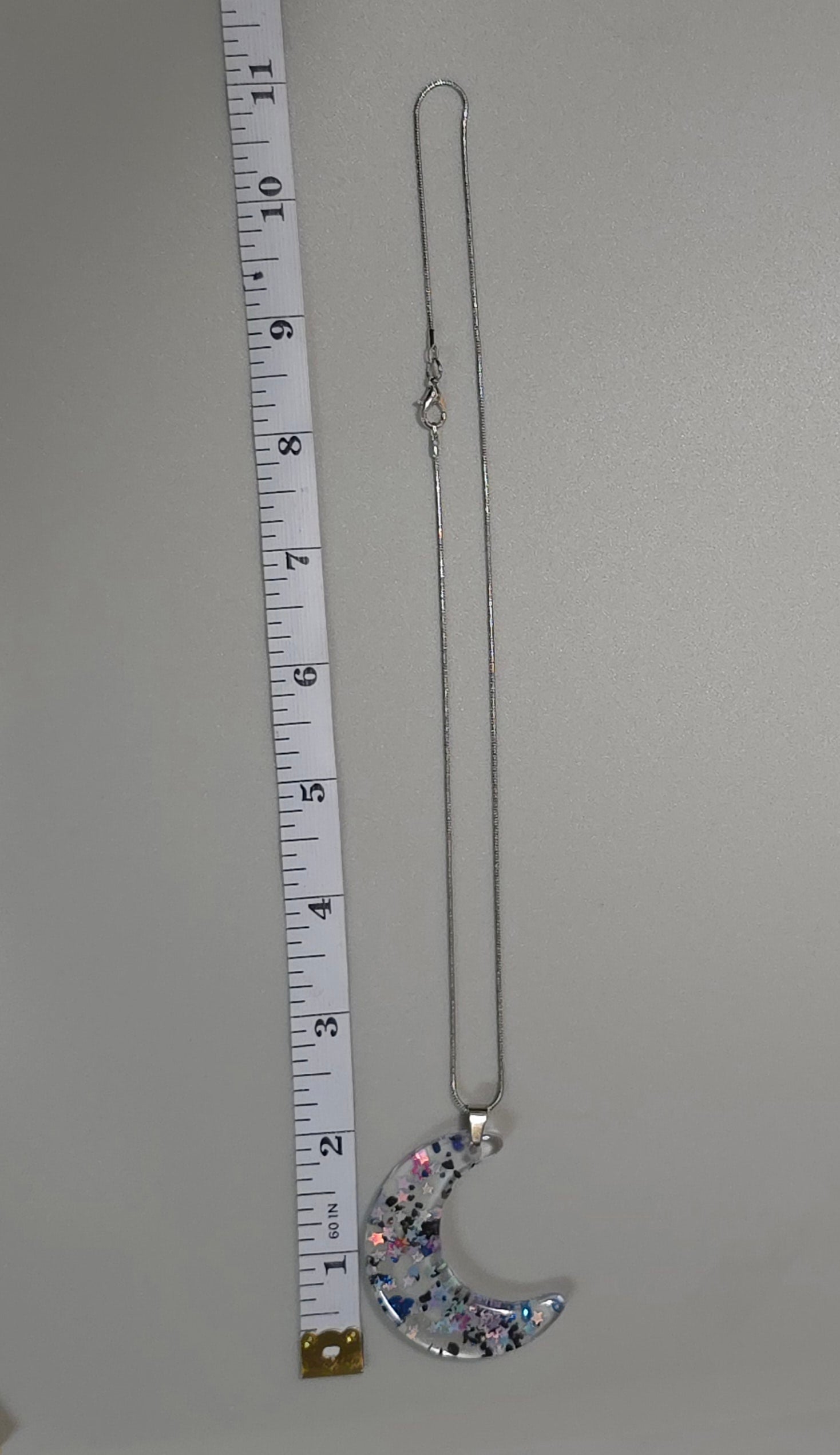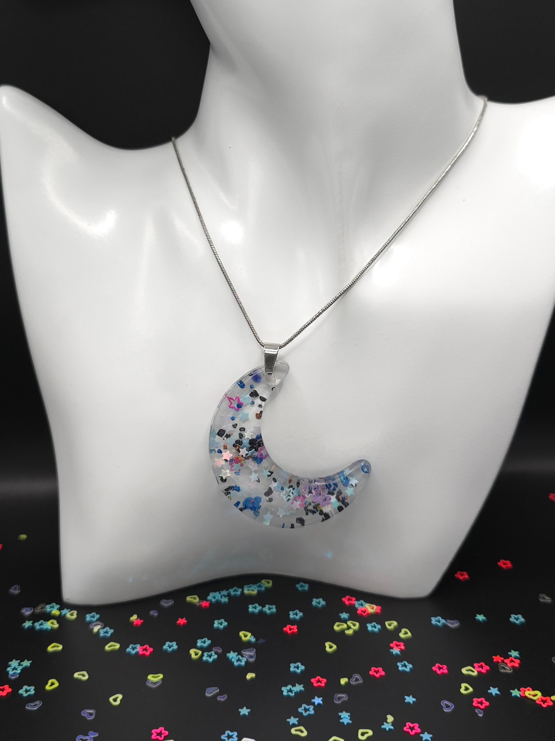 This stunning Stars & Moon Necklace features a beautiful moon shaped resin charm with blue and black glitter stars encased in clear resin. The stainless steel snake chain adds a touch of elegance to any outfit. Perfect for adding a unique and celestial touch to your style. This necklace is 47cm long, with a drop length of 30cm (including resin pendant). Moon pendant is 5cm long by 1.5cm wide (at widest point of pendant).