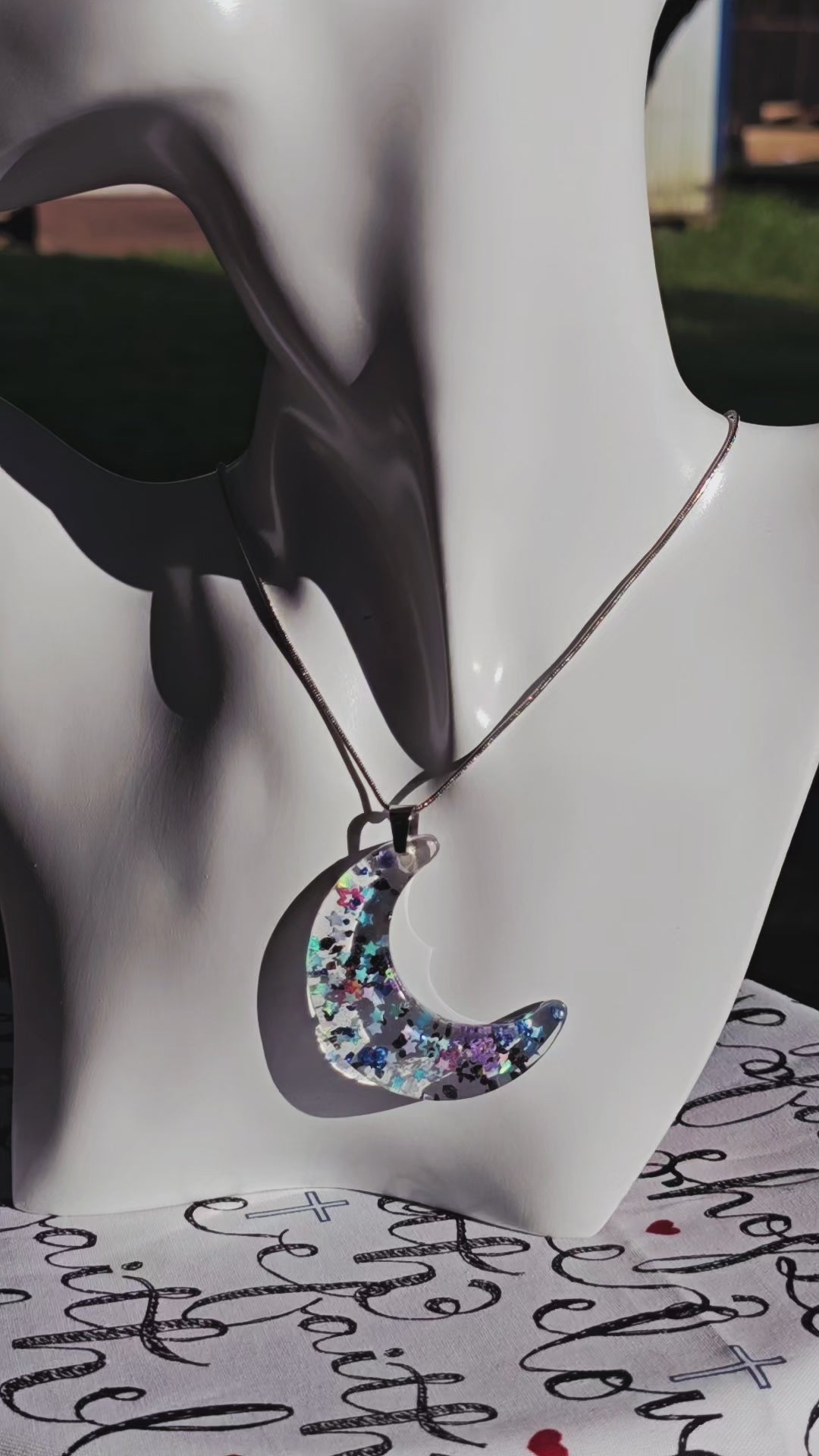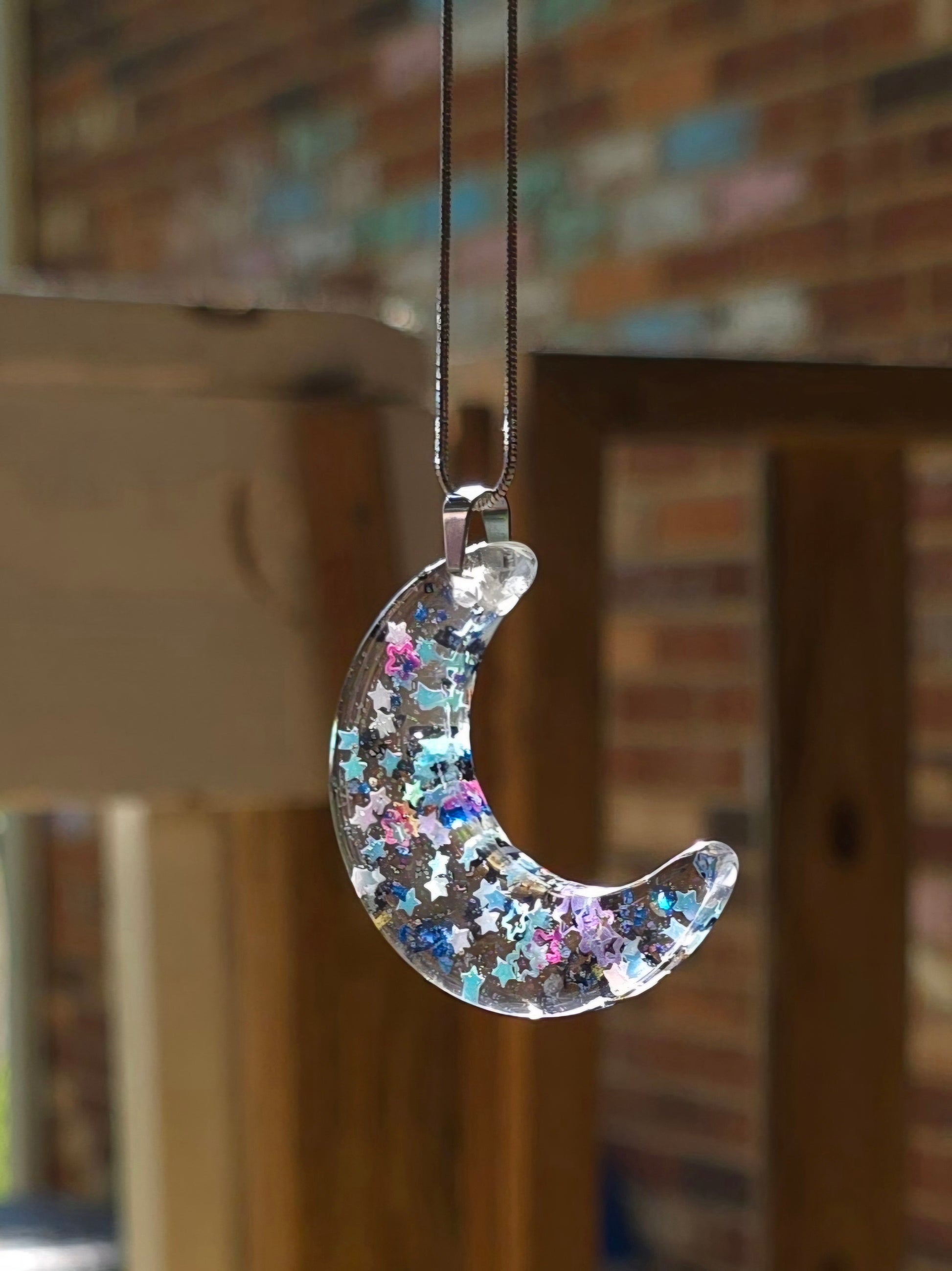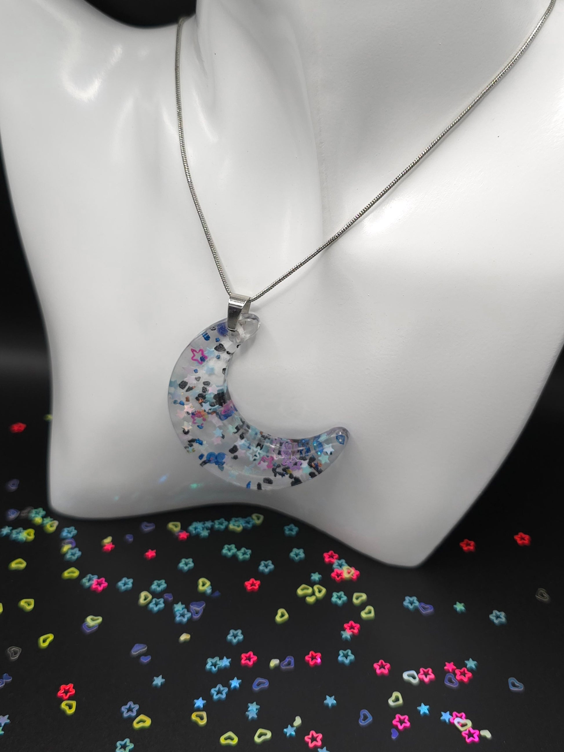 This stunning Stars & Moon Necklace features a beautiful moon shaped resin charm with blue and black glitter stars encased in clear resin. The stainless steel snake chain adds a touch of elegance to any outfit. Perfect for adding a unique and celestial touch to your style. This necklace is 47cm long, with a drop length of 30cm (including resin pendant). Moon pendant is 5cm long by 1.5cm wide (at widest point of pendant).
